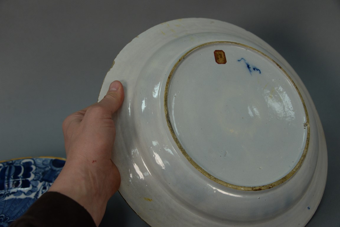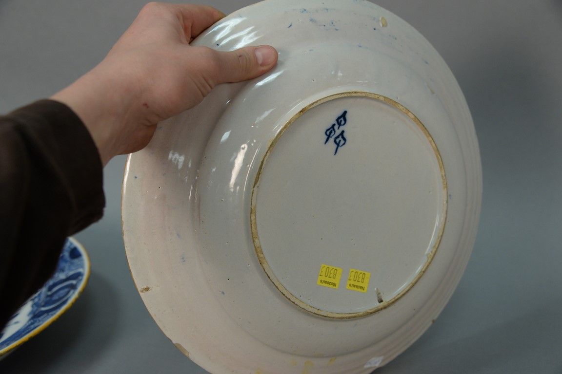 Lot 3: Pair of Delft tin glazed deep chargers, each with yellow rims, probably 18th century. glaze chips and minor rim chips diameter 1…