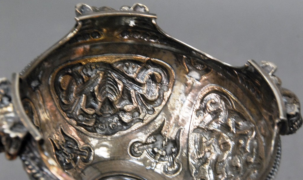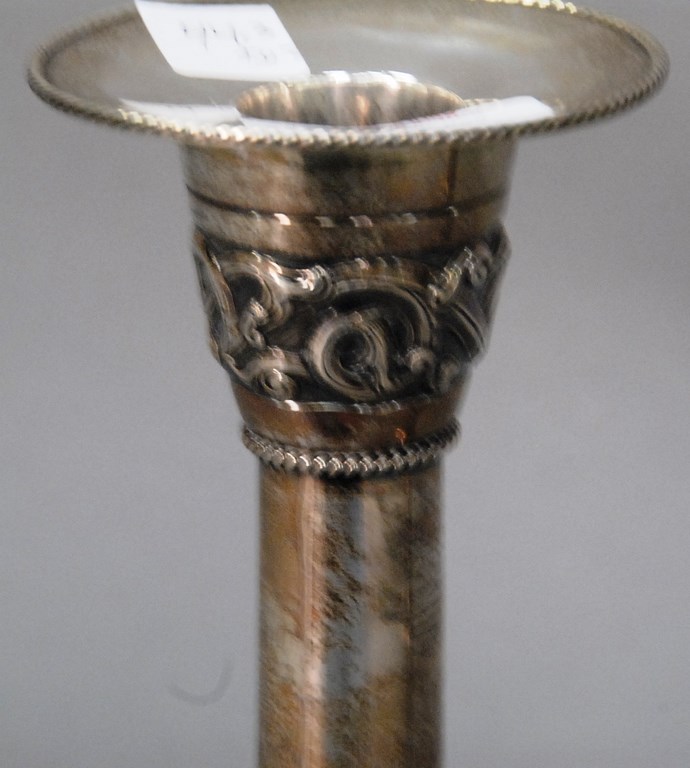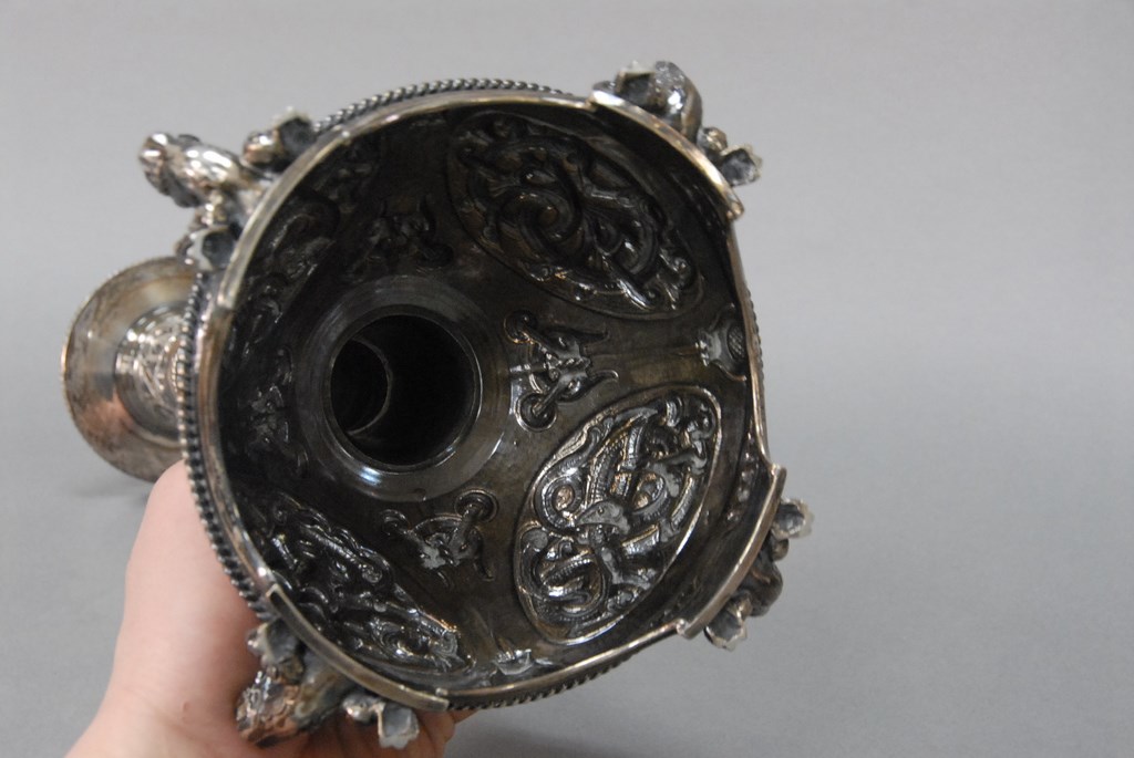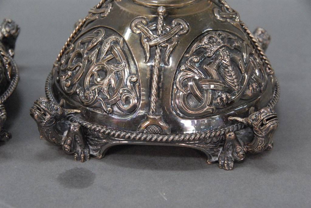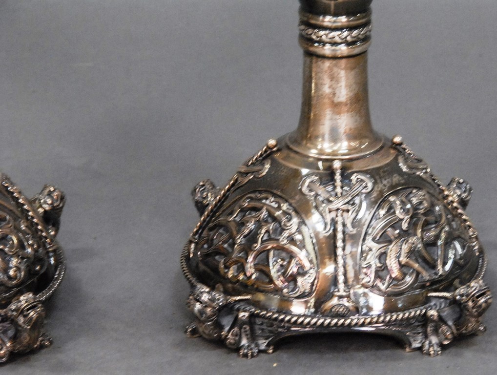 Lot 3: Pair of sterling silver candlesticks with large round bases with birds having entwined scrolling all set on four griffin feet, marke…