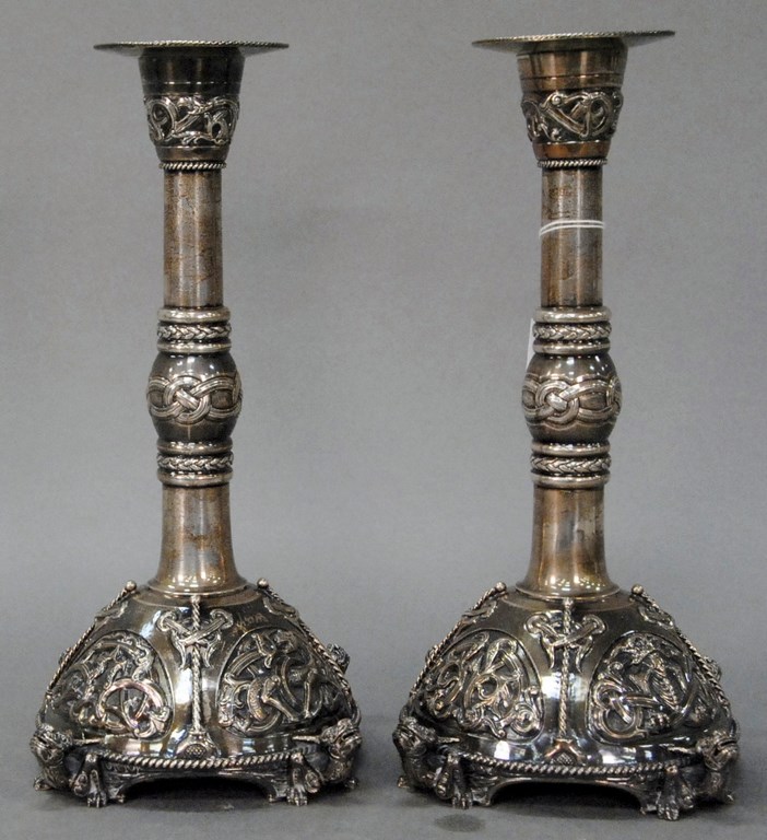Pair of sterling silver candlesticks with large round bases with birds having entwined scrolling all set on four griffin feet, marked H. Moeller 925 Trondhjen. 44.3 t oz.
