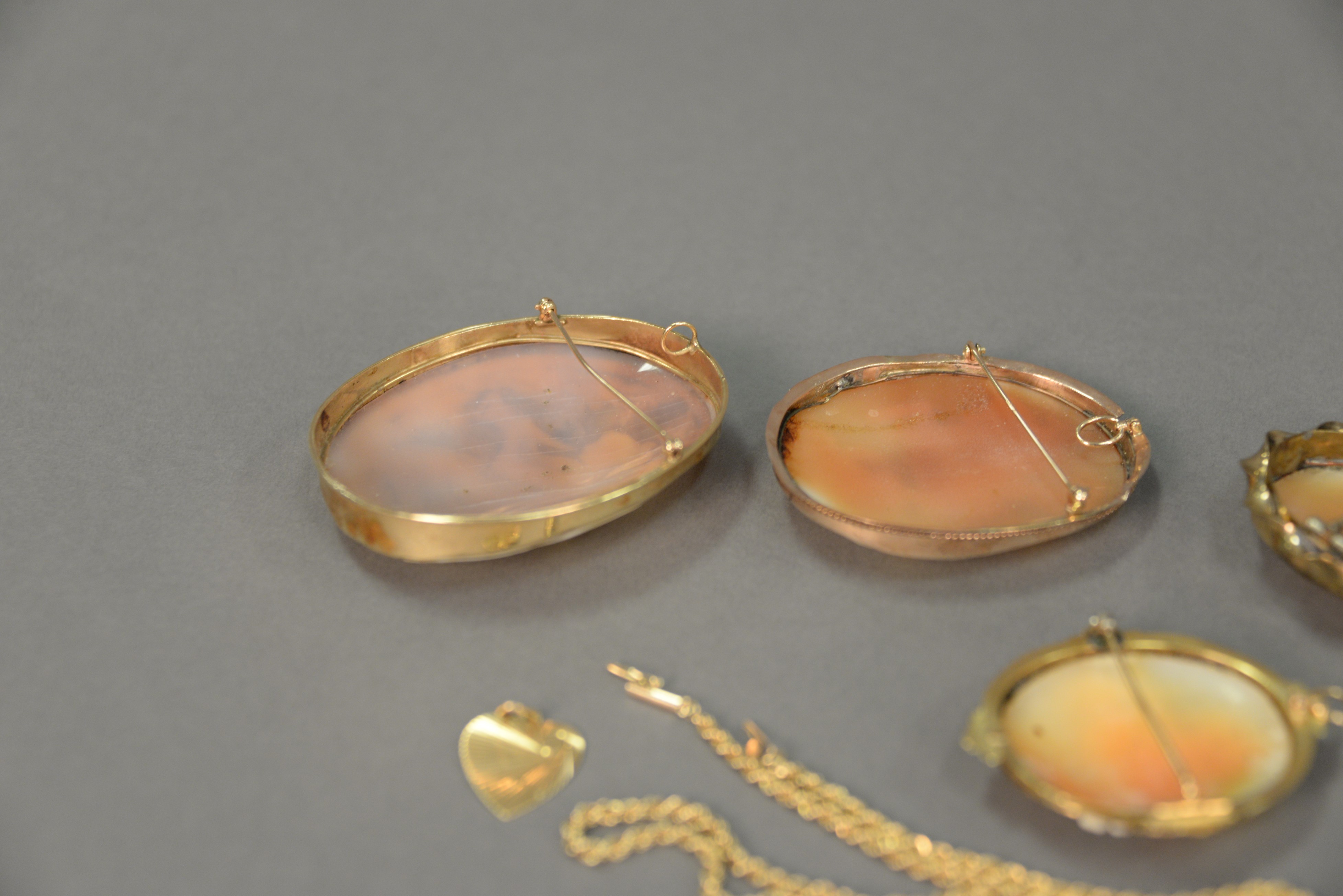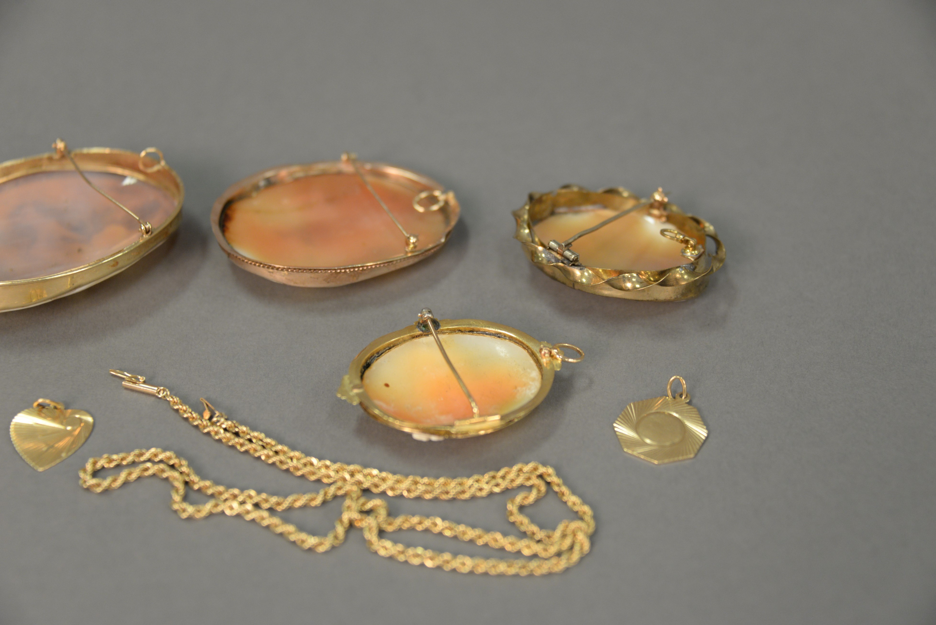 Lot 3: Seven piece lot to include 14K gold necklace and two pendants plus and cameos at least three mounted in gold. 8.2 grams