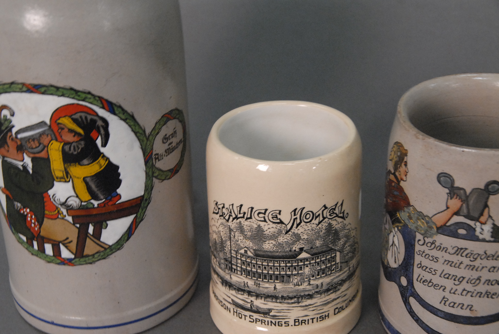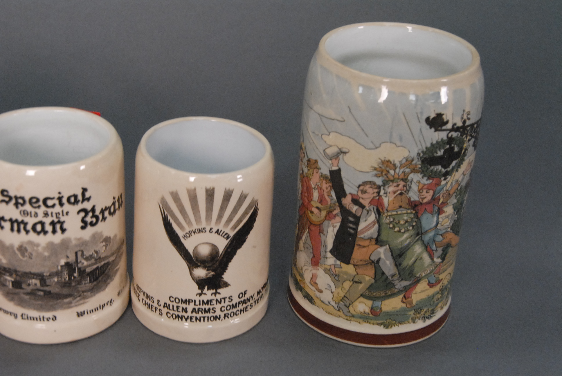 Six advertising steins with open tops, three signed Mettlach, hts. 4 – 7 1/2.