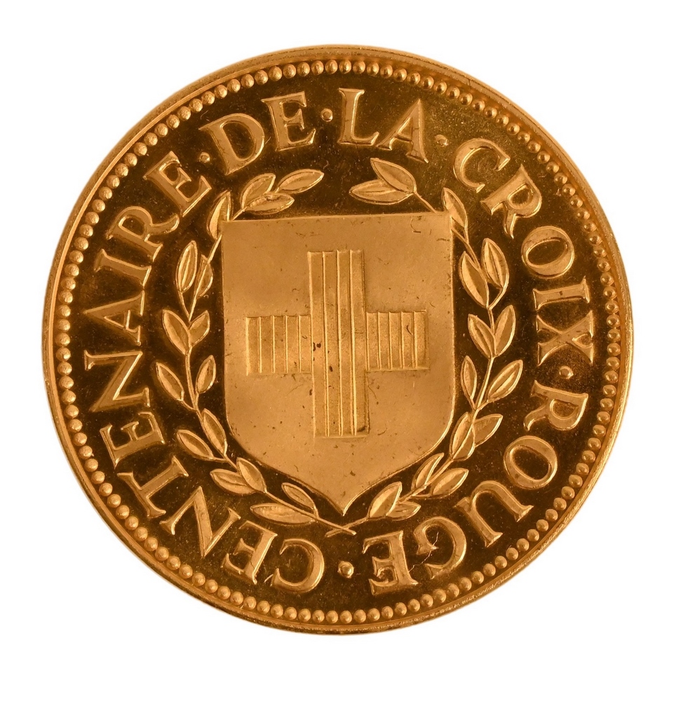 Lot 3: Swiss Gold Jean Henri Dunant Centenary of Foundation of the Red Cross, bust of Dunant Rev. having Swiss shield, 50 grams, #214 on edge, 38 mm.