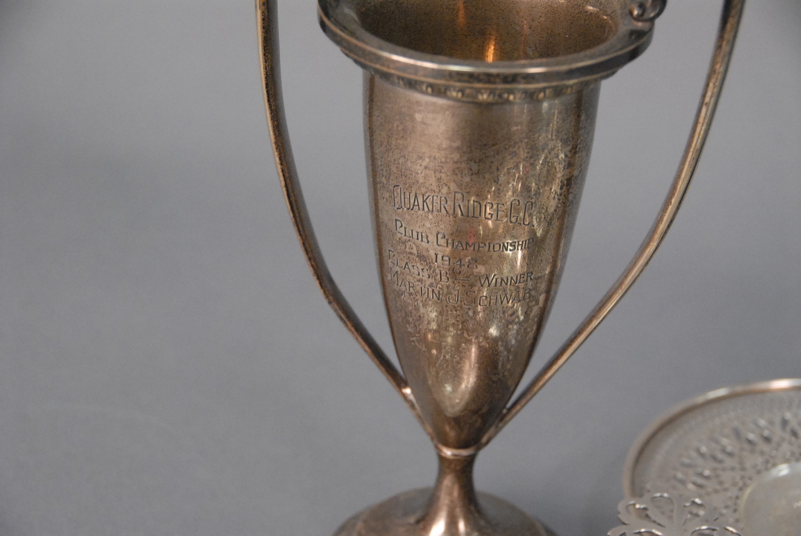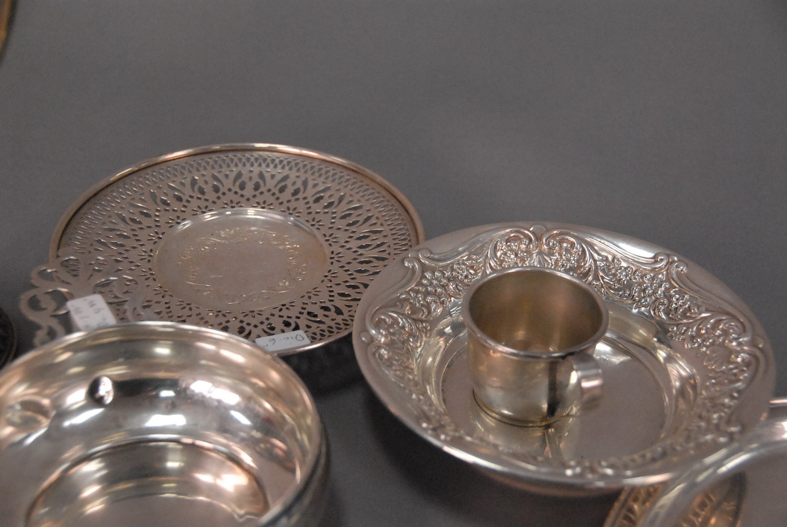 Ten piece lot of sterling silver including small bowls, porringer, and trophy. 37.2 t oz.