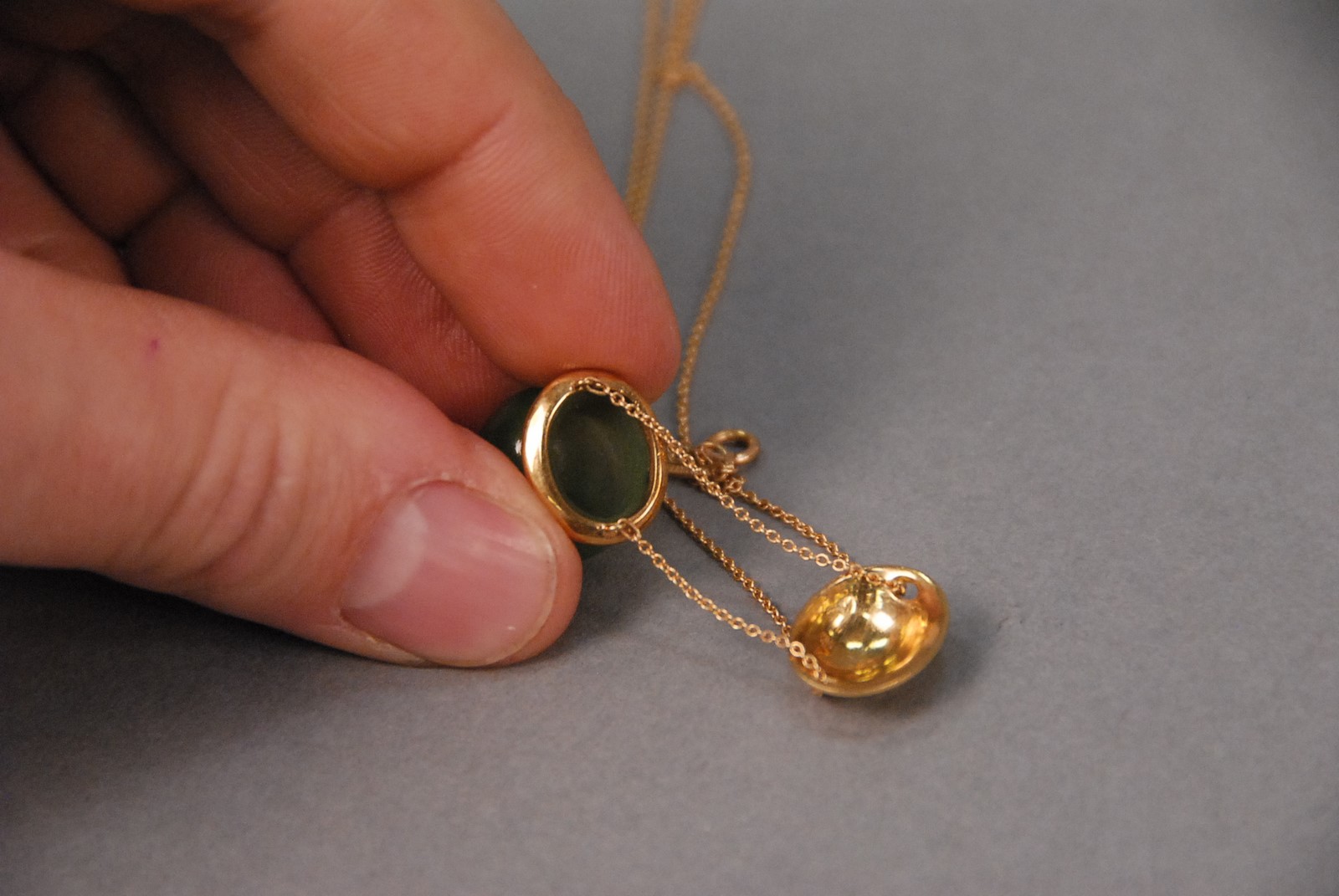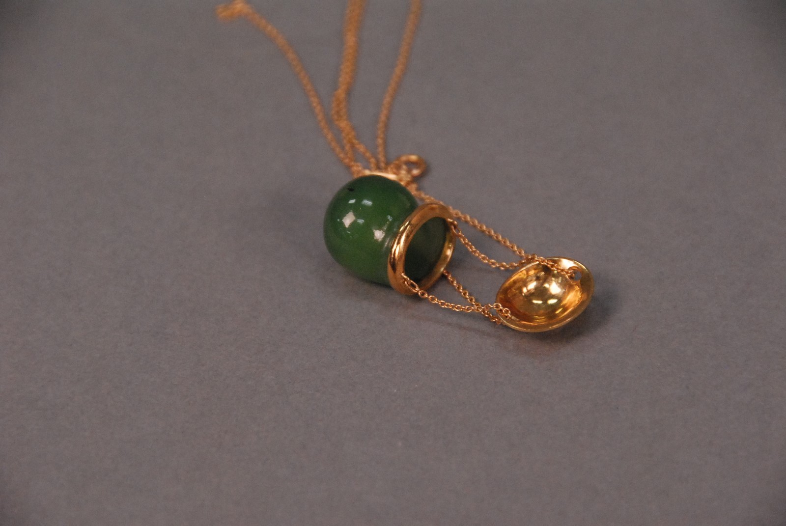 Tiffany & Co. Elsa Peretti, 18K gold chain with 18K gold covered green jade jug pendant with jug cover as slide, marked Tiffany & Co. Peretti. Provenance: Property from a Private Collection Sold for the Benefit of the Virginia Historical Society.