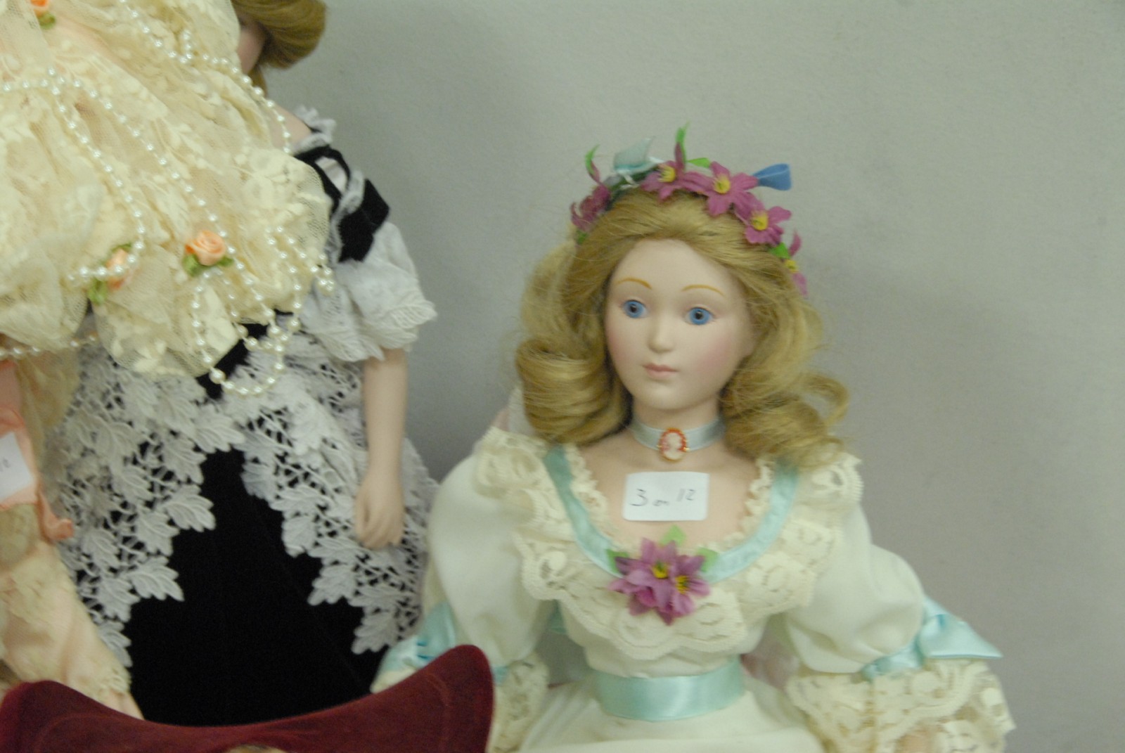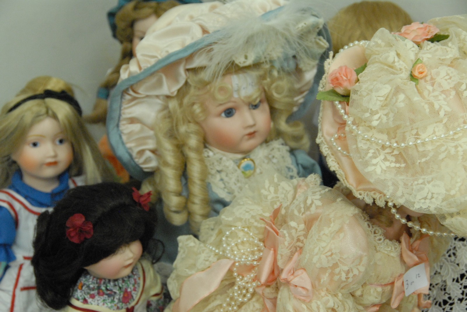 Twelve reproduction bisque collectible dolls