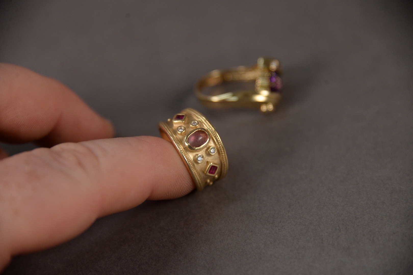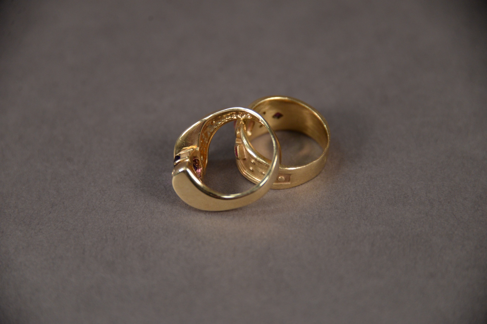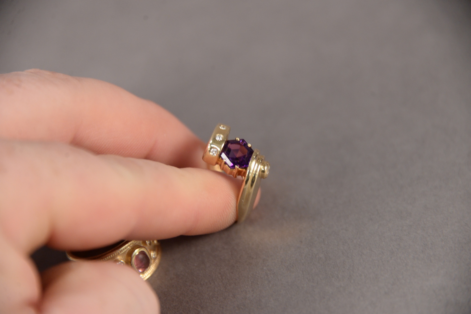 Lot 3: Two 14 Karat Gold Rings, to include amethyst with small diamonds, sizes 7 1/2 and 8 1/4, 14.2 grams.