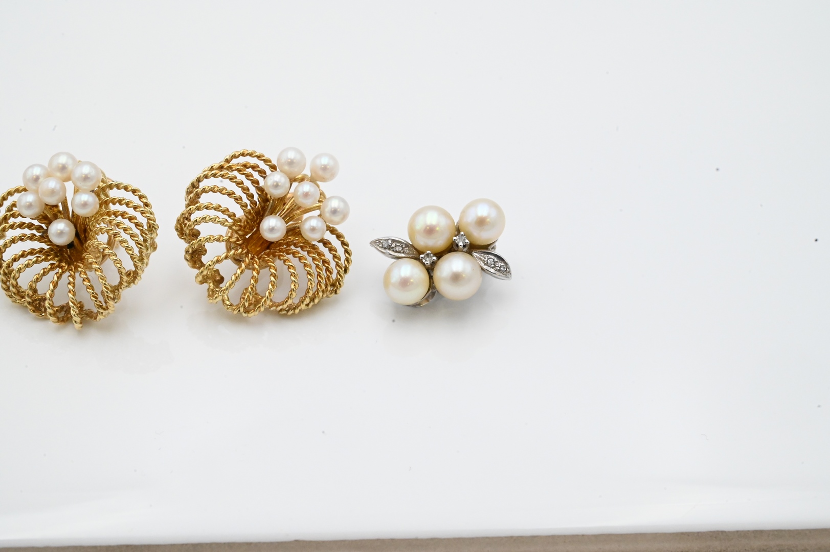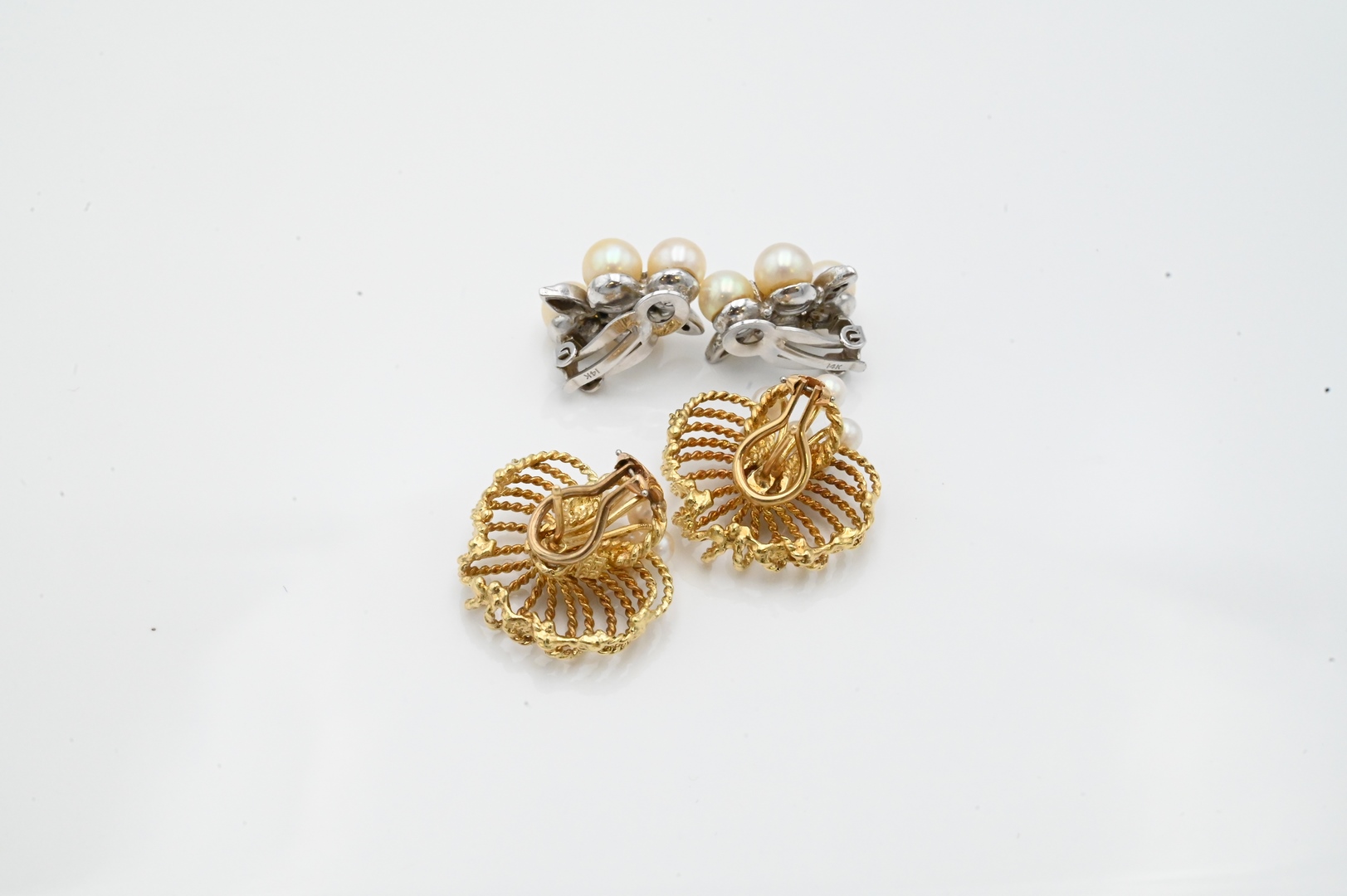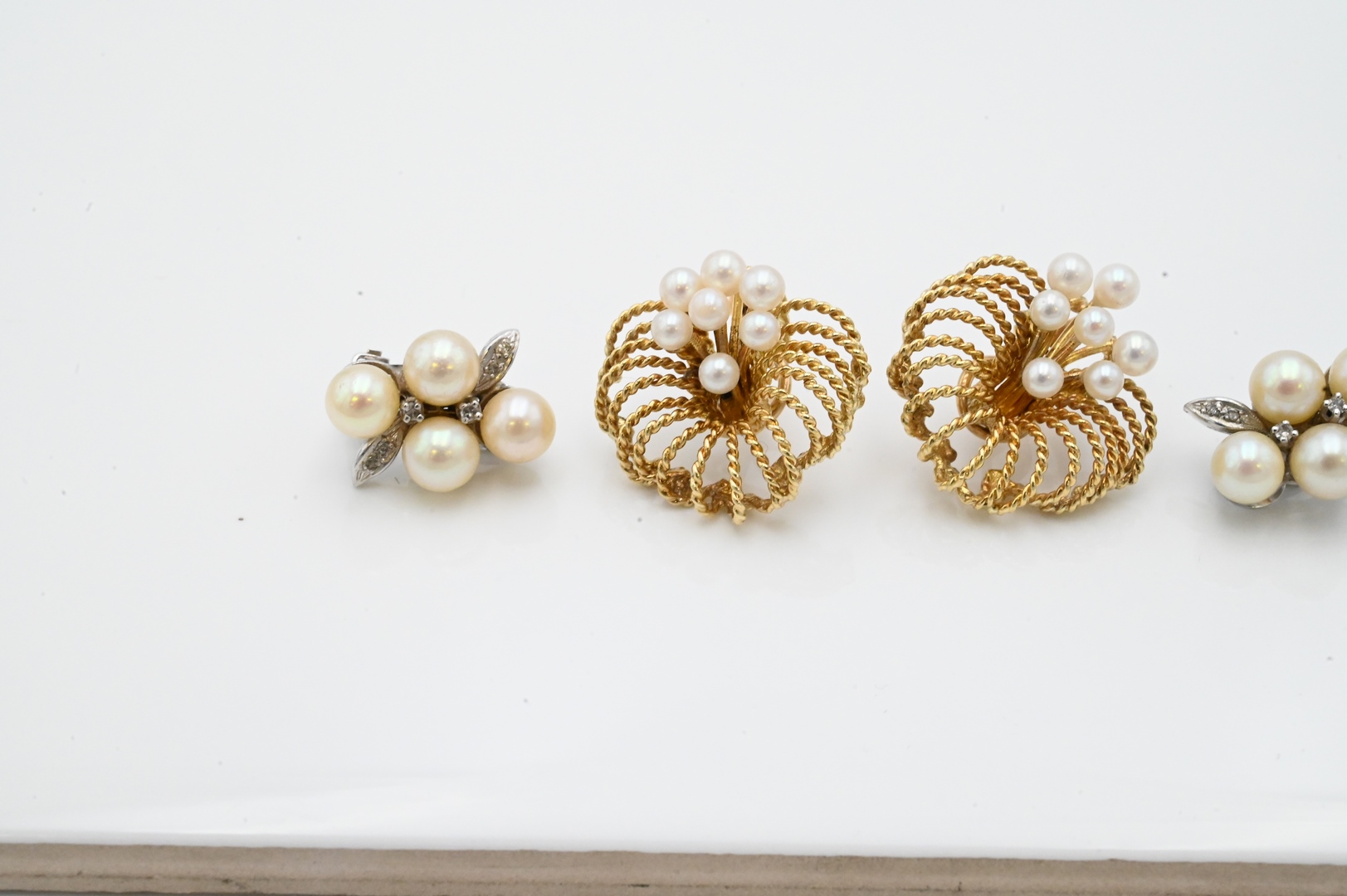 Two Pairs of 14 Karat Gold Pierced Earrings, set with seven pearls each; along with white gold ear clip pearl earrings; 21.9 grams.