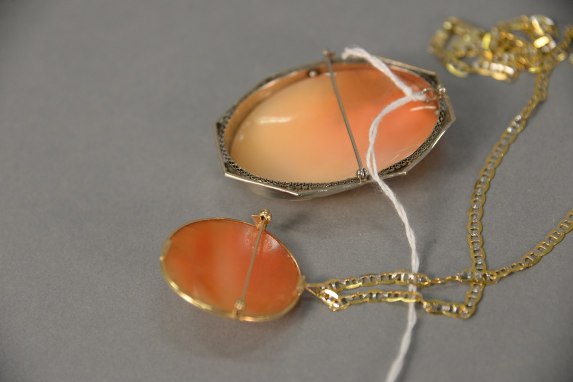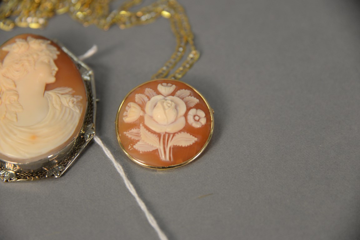 Lot 3: Two shell cameos, one oval with woman and one round with flower, each surrounded by 14K gold and 14K two color gold chain.
