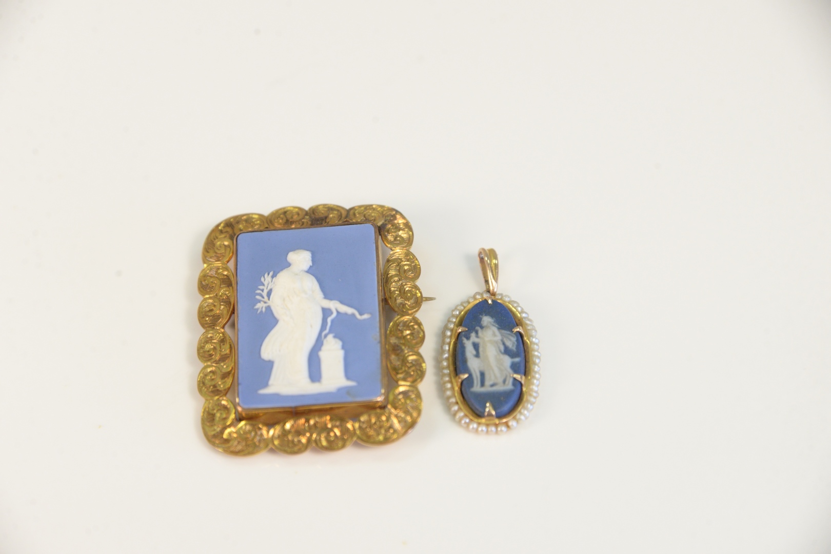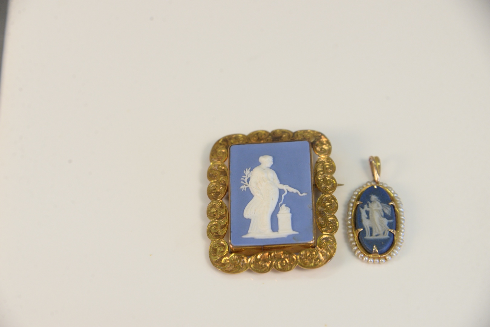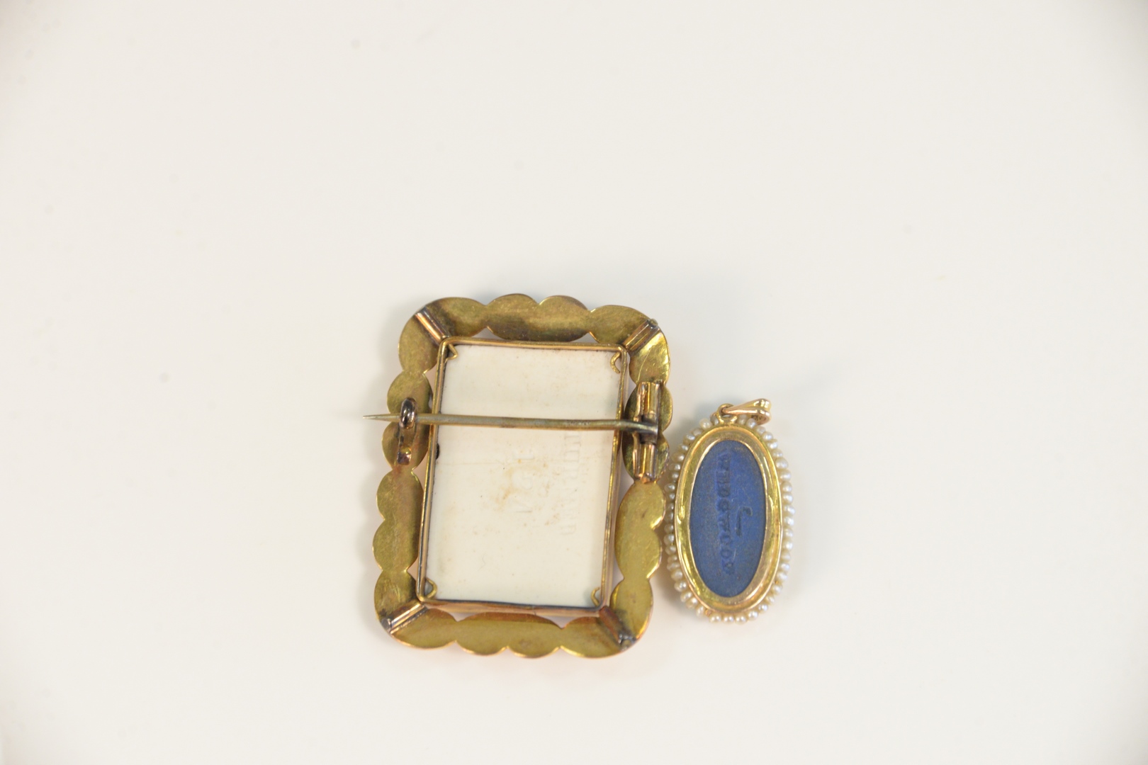 Two Wedgwood and Gold Medallions the larger signed ‘Turner 124’ with slight hairline in reverse the smaller surrounded by pearls, signed ‘Wedgwood’ 37mm x 28.5mm and 21.8mm x 12.8mm