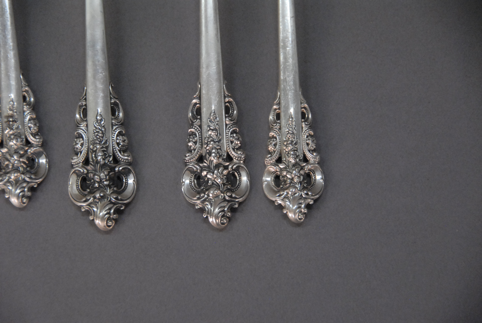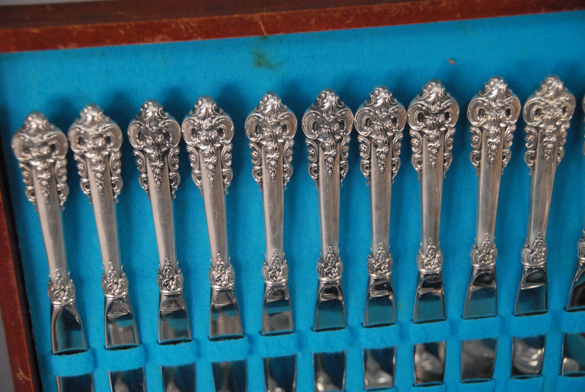 Wallace sterling silver flatware set, Grand Baroque pattern, setting for twelve, sixty-four total pieces comprising of twelve dinner forks, twelve luncheon forks, twelve teaspoons, eight iced teaspoons, twelve soup spoons, twelve dinner knives, four cocktail forks, one butter knife, and three serving pieces. 93.52 troy ounces plus knives