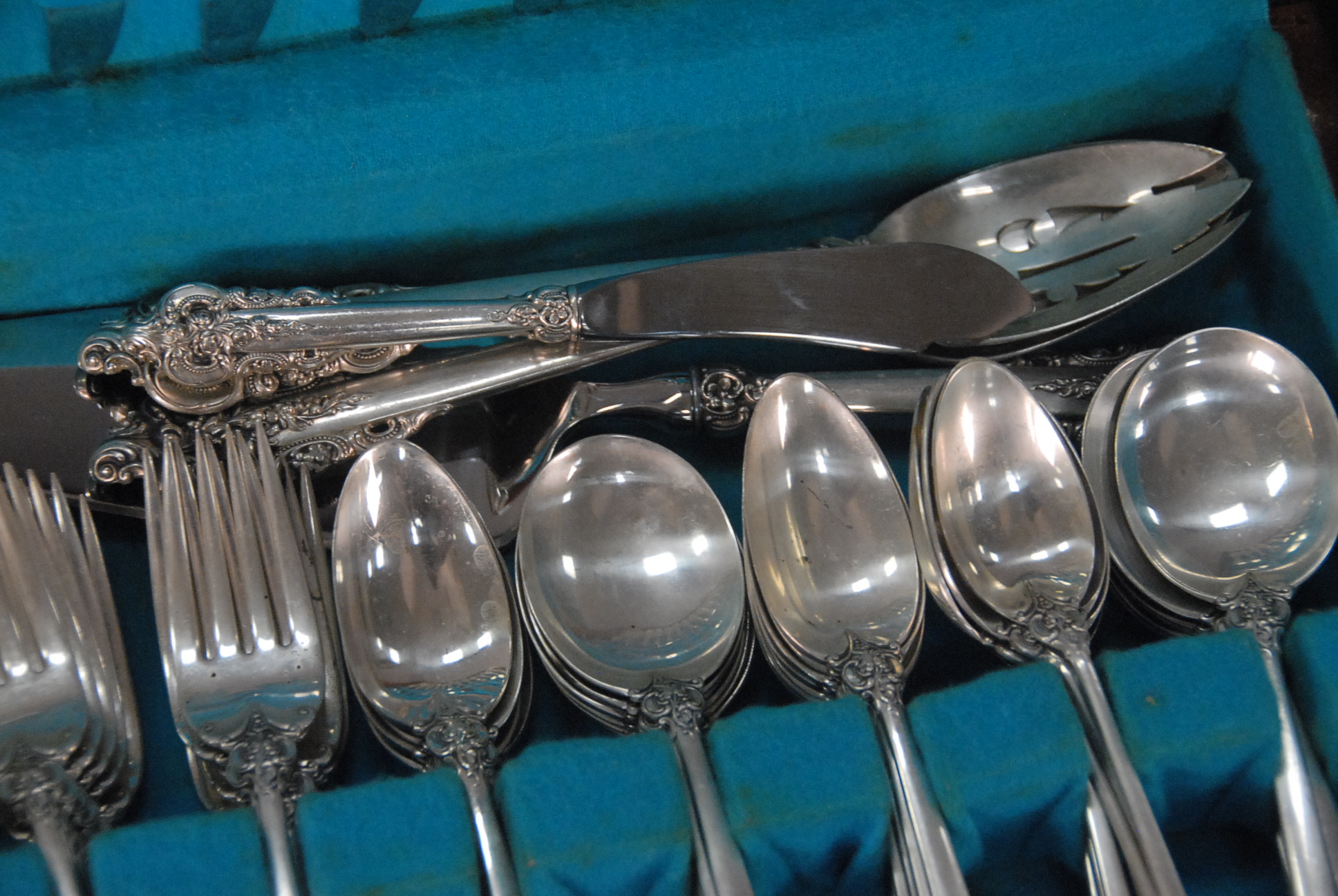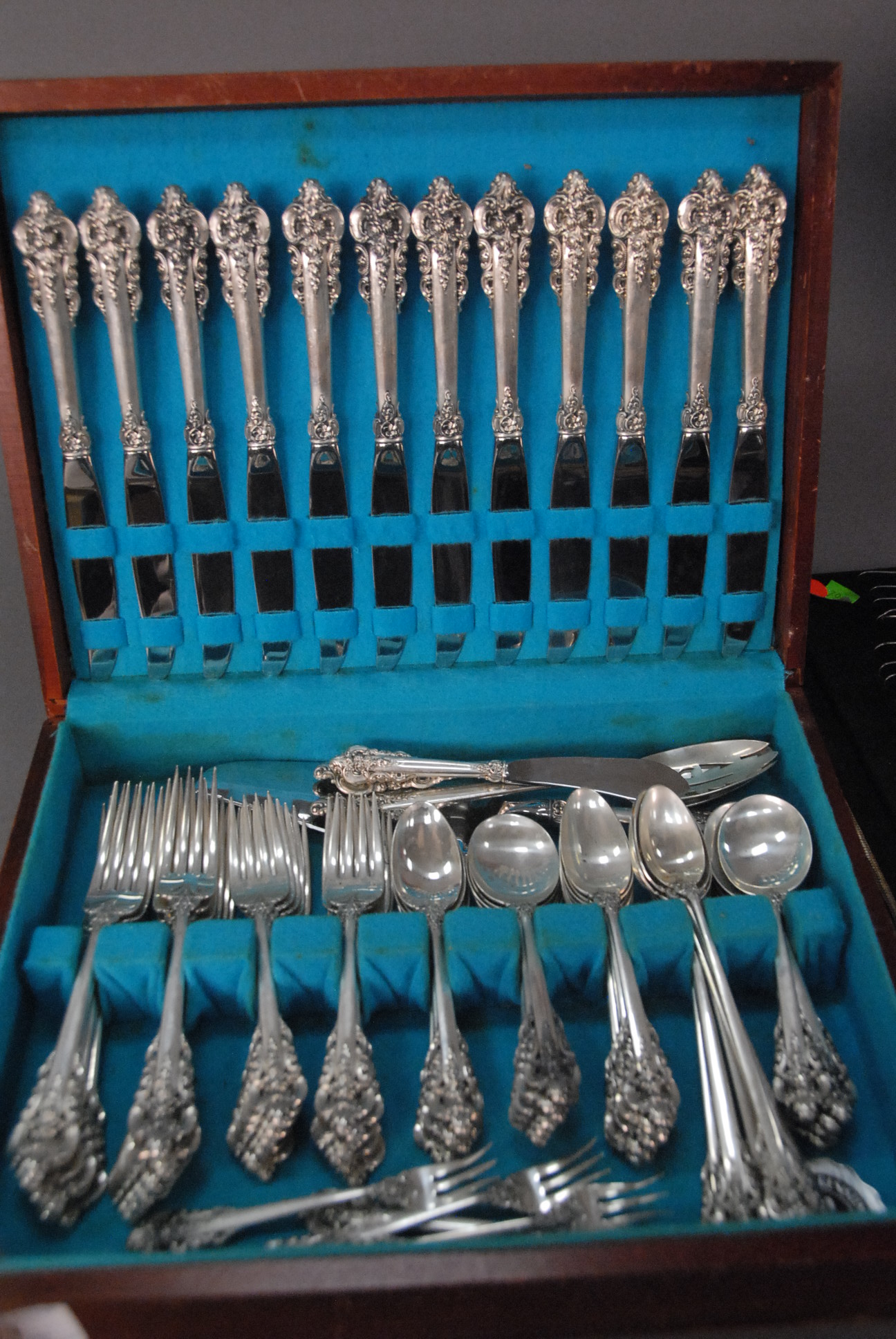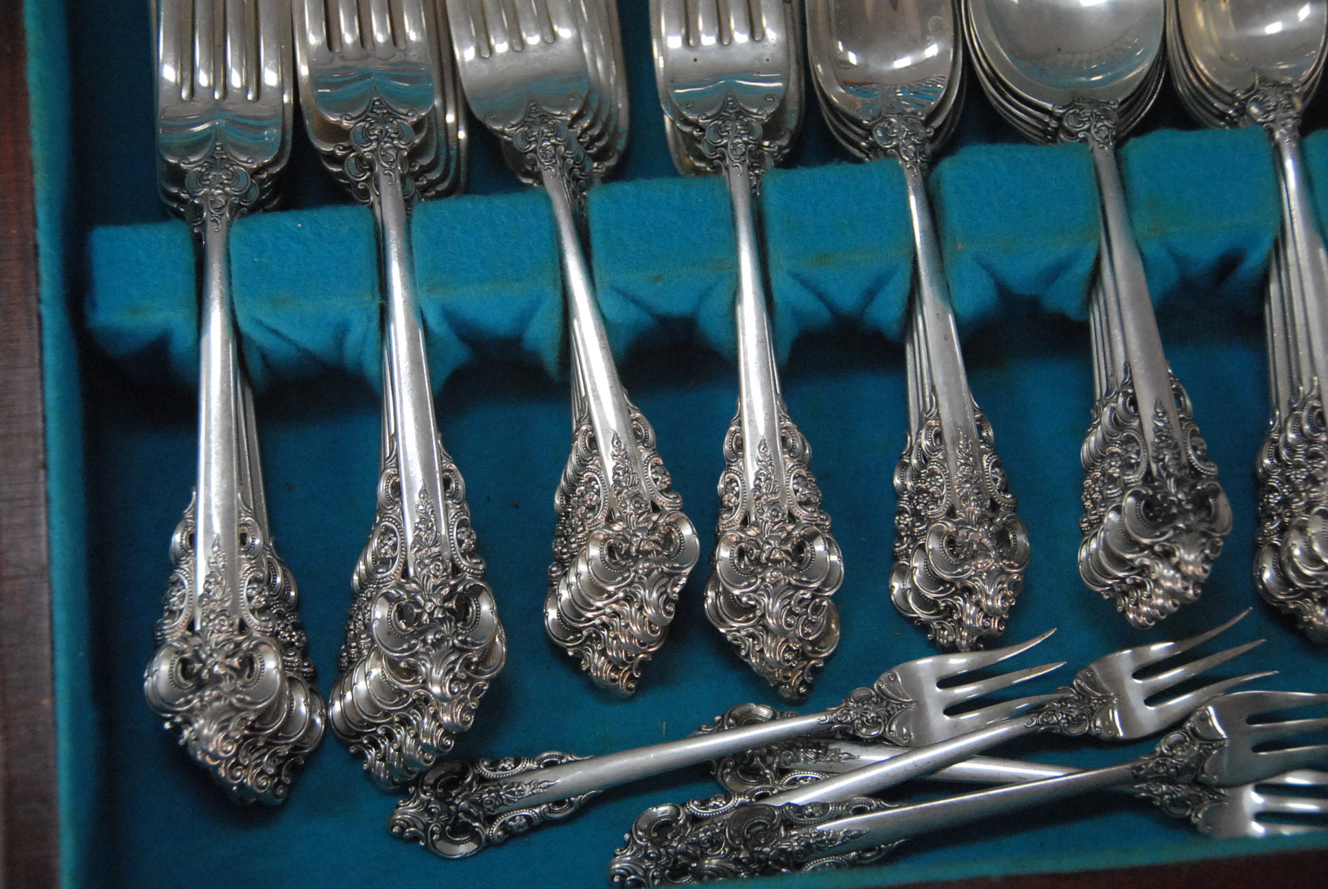 Lot 3: Wallace sterling silver flatware set, Grand Baroque pattern, setting for twelve, sixty-four total pieces comprising of twelve dinner forks, twelve luncheon forks, twelve teaspoons, eight iced teaspoons, twelve soup spoons, twelve dinner knives, four