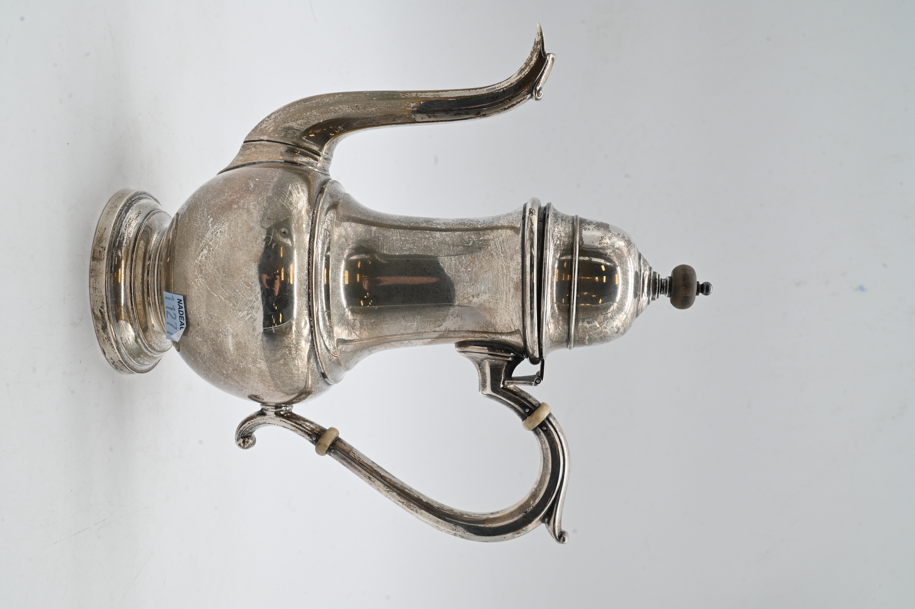 “Exemplar circa 1730″ pattern, of baluster form with domed lid and wooden finial, scroll handle with ivory insulators, and curved spout, monogrammed to body and raised on a circular foot. Total weight 15.2 troy ounces