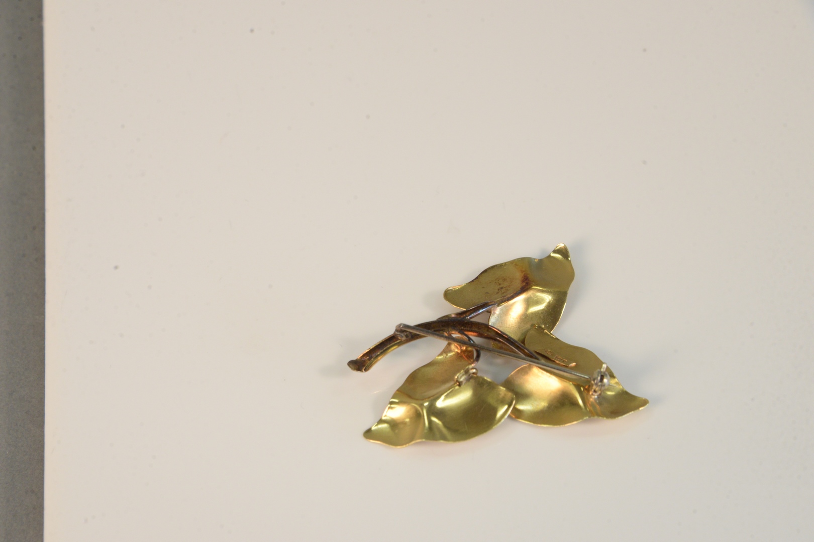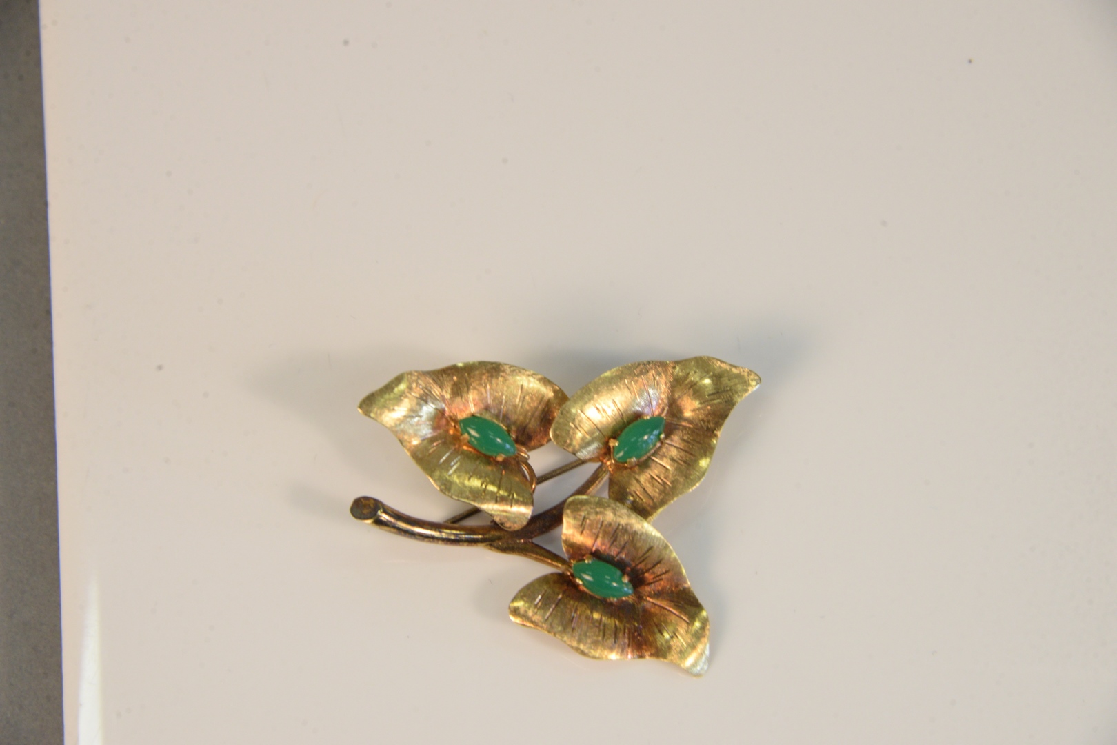 Lot 30: 18 Karat Gold Triple Leaf Brooch each set with green stones marked Italy 8.5 grams total weight Provenance: From the Lance & Irma Ke…