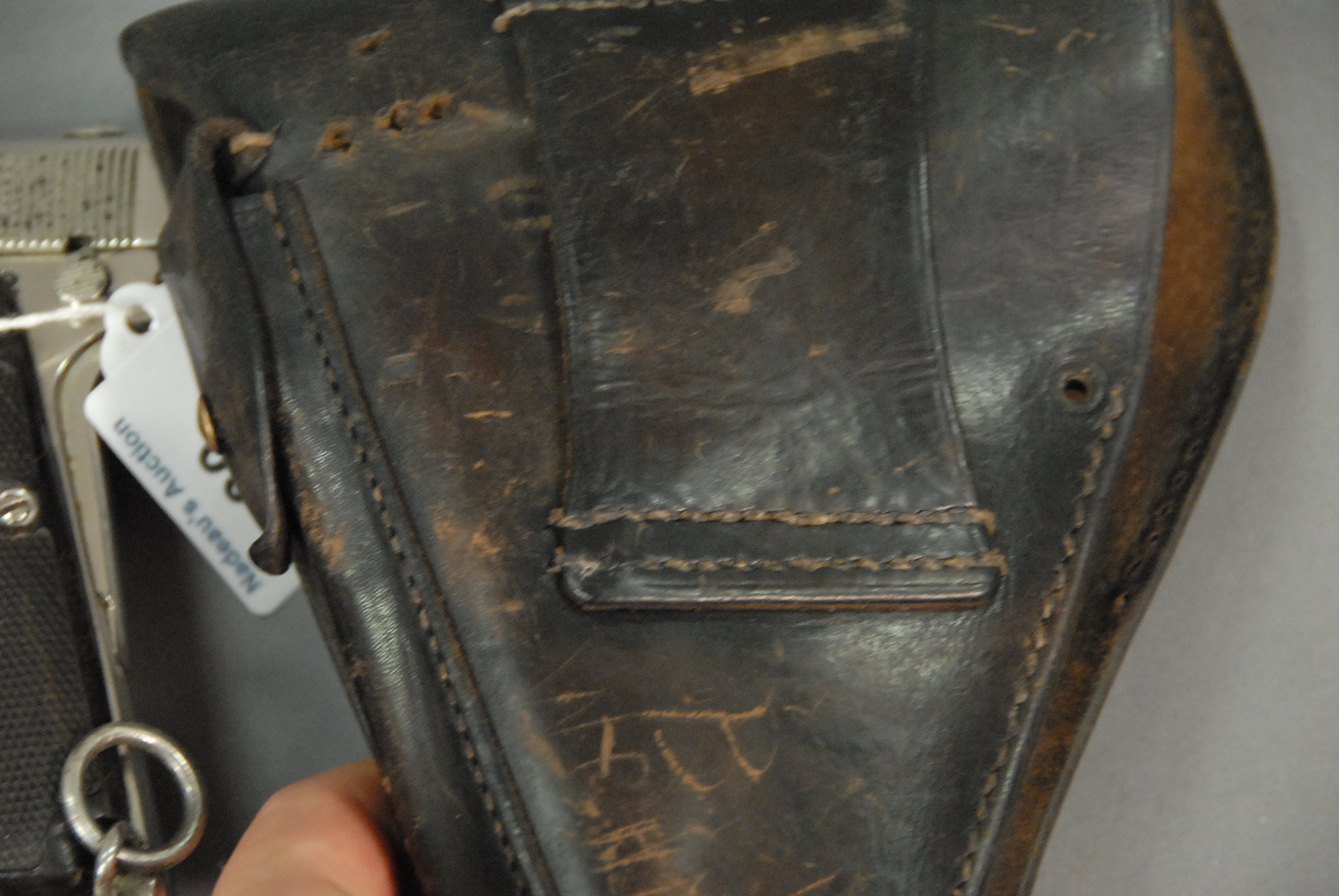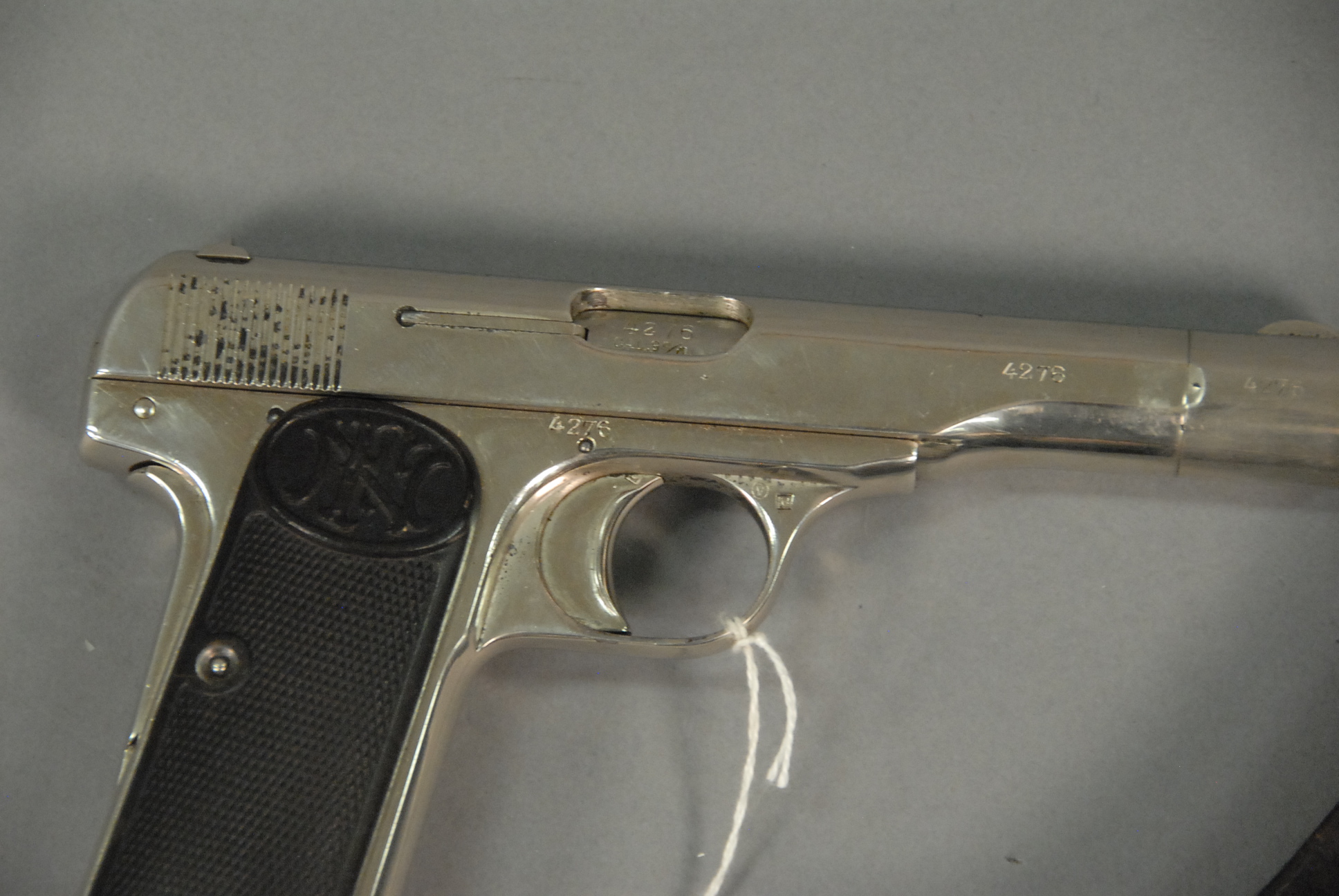 Browning pistol, 9mm, Fabrique National D’armes de Guerre Herstal Belgique, Browning’s Patent Depose, with leather holster, barrel lg. 4 1/2, sn 4276 and sn 13525, 313.