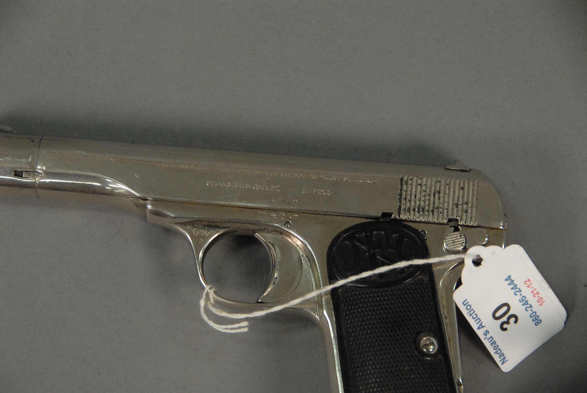 Lot 30: Browning pistol, 9mm, Fabrique National D’armes de Guerre Herstal Belgique, Browning’s Patent Depose, with leather holster, barrel l…