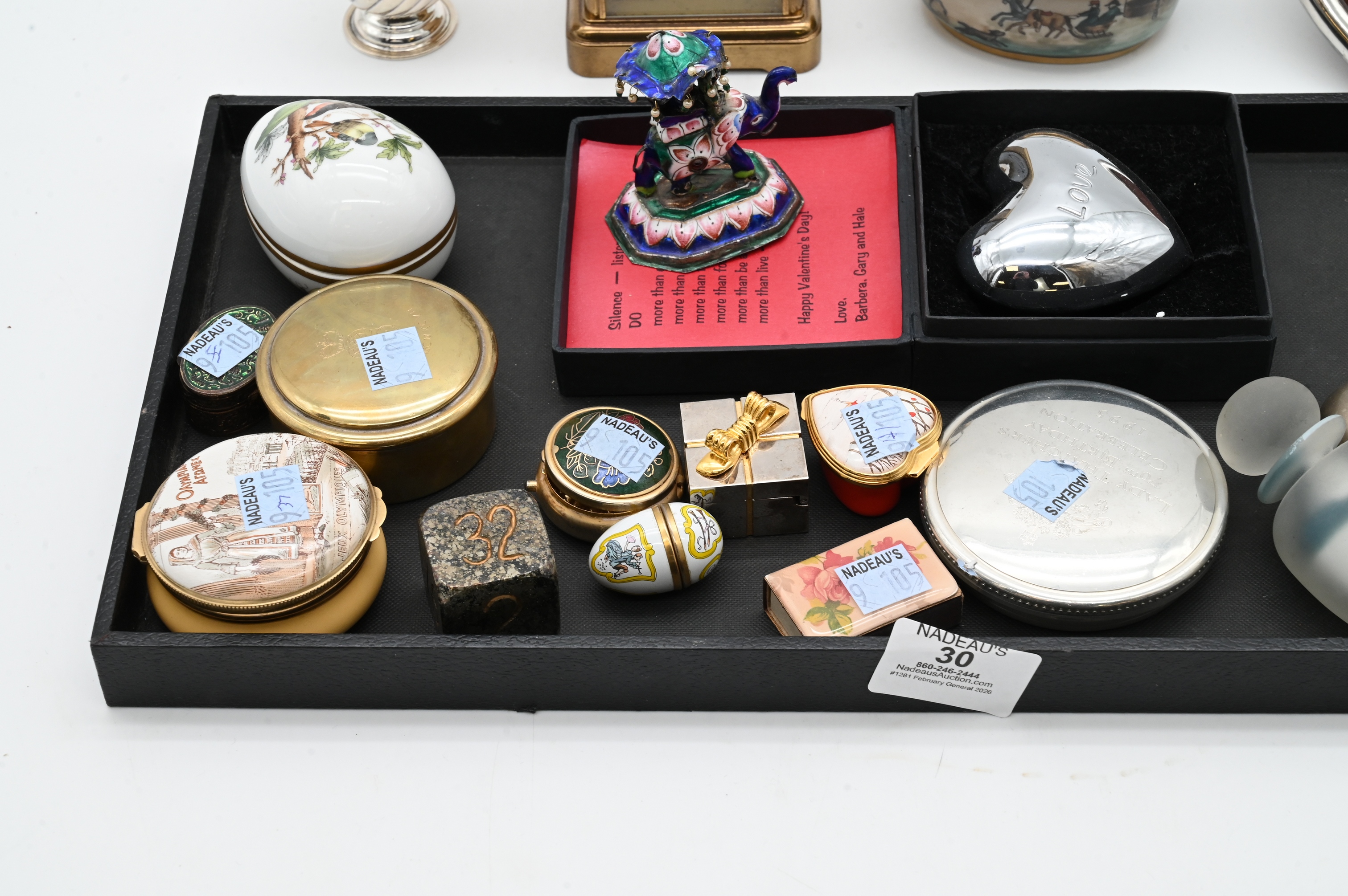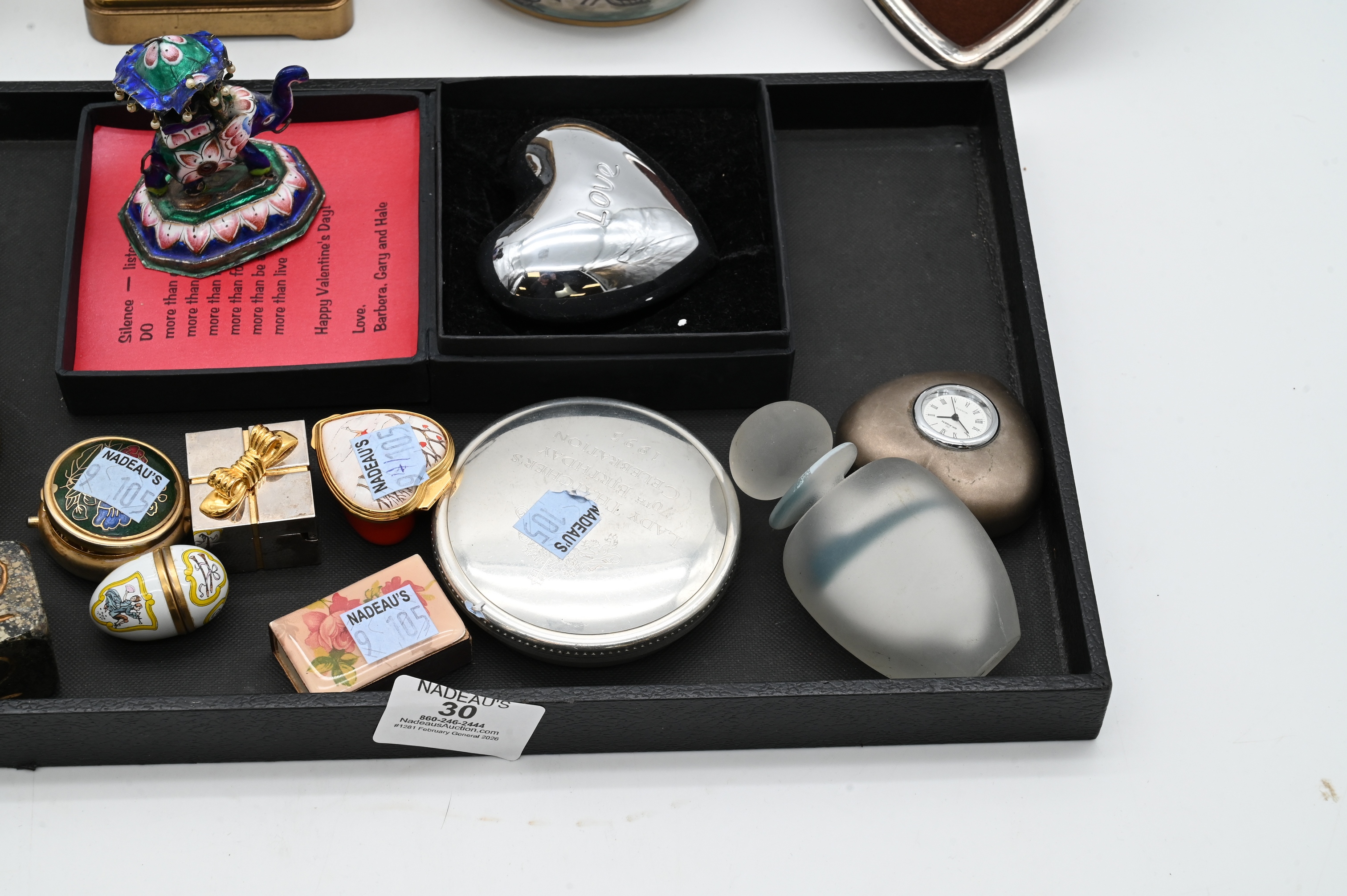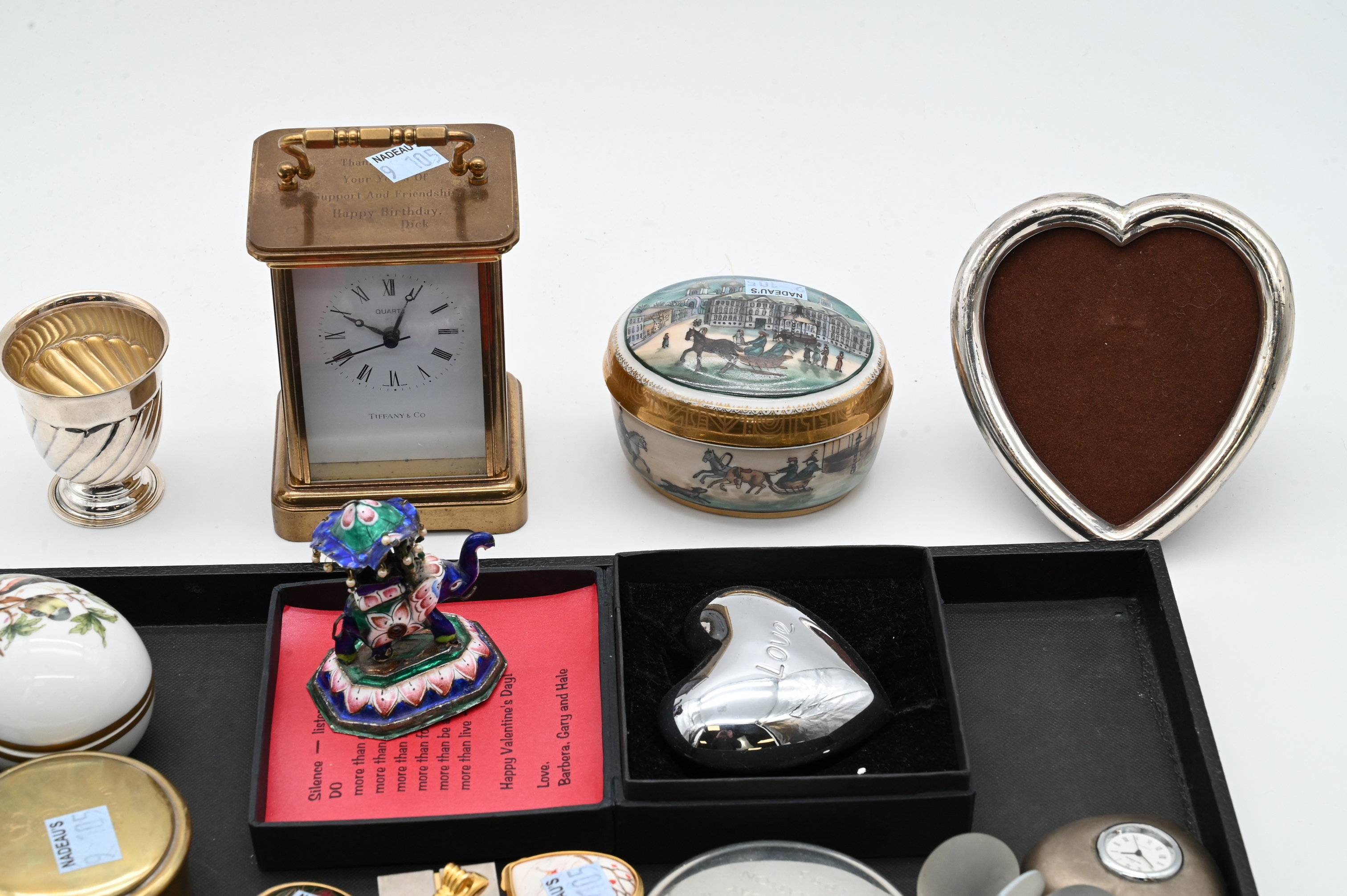 including Halcyon Days and Herend, one painted with a coaching scene, another egg-form example with floral and bird decoration, and a Herend “Lady Thatcher 70th Birthday Celebration” commemorative box, 1995. Together with a Tiffany & Co. pewter heart-form box inscribed Love, miniature clock-form and gilt metal heart boxes, sterling heart picture frame, Tiffany & Co. carriage clock, small Indian engraved and enameled silver elephants and rider