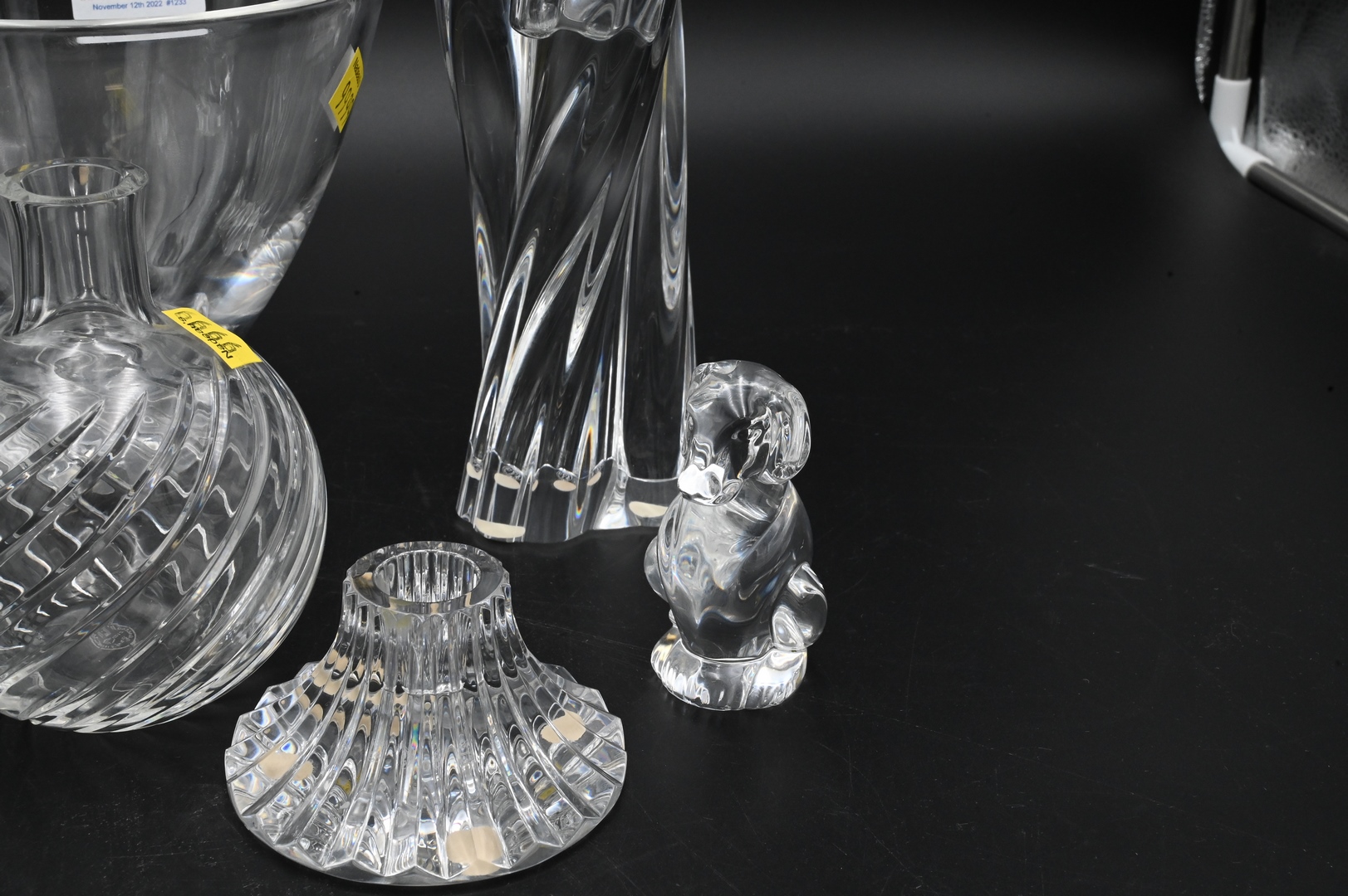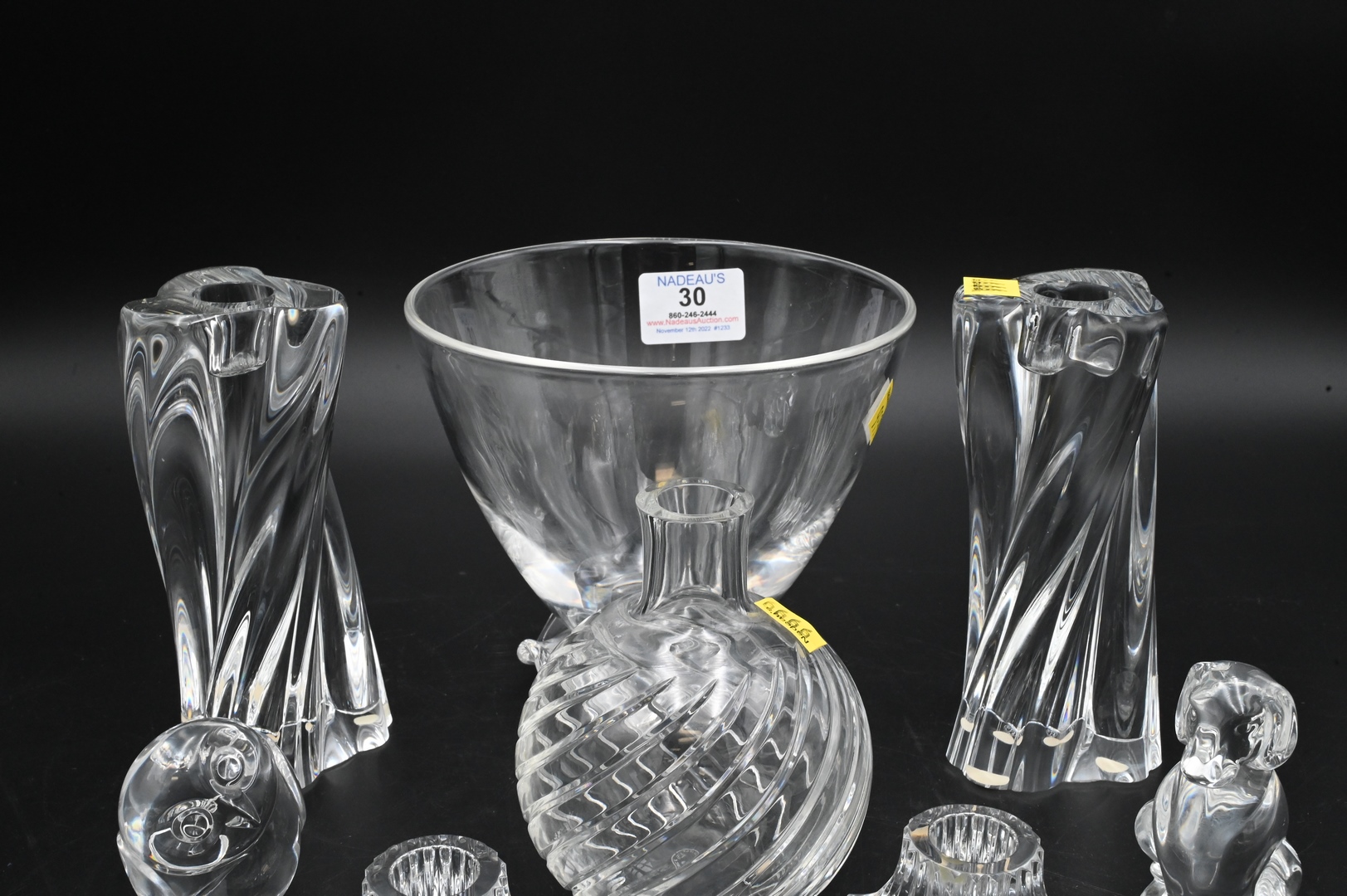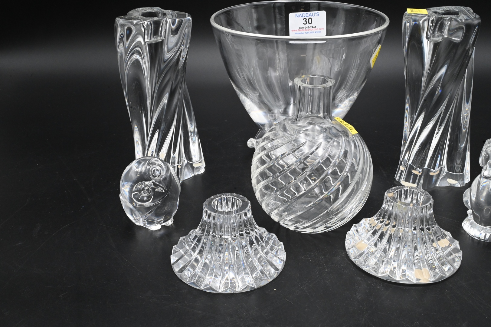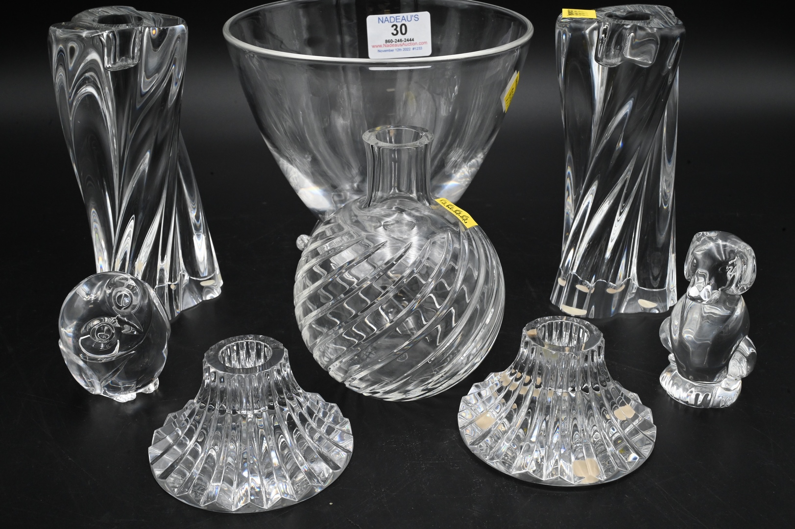 Eight Piece Crystal Lot, to include two pairs of Baccarat candlesticks, Baccarat vase, Steuben bowl and two Steuben animal figures, largest height 5 3/4 inches.
