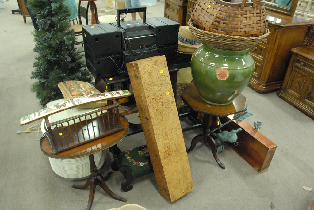 Lot 30: Group lot copper pan, TV. tables, floor model radio, wire rack, Victorian oak silverware tray, large jardinire, two stands, and fo…