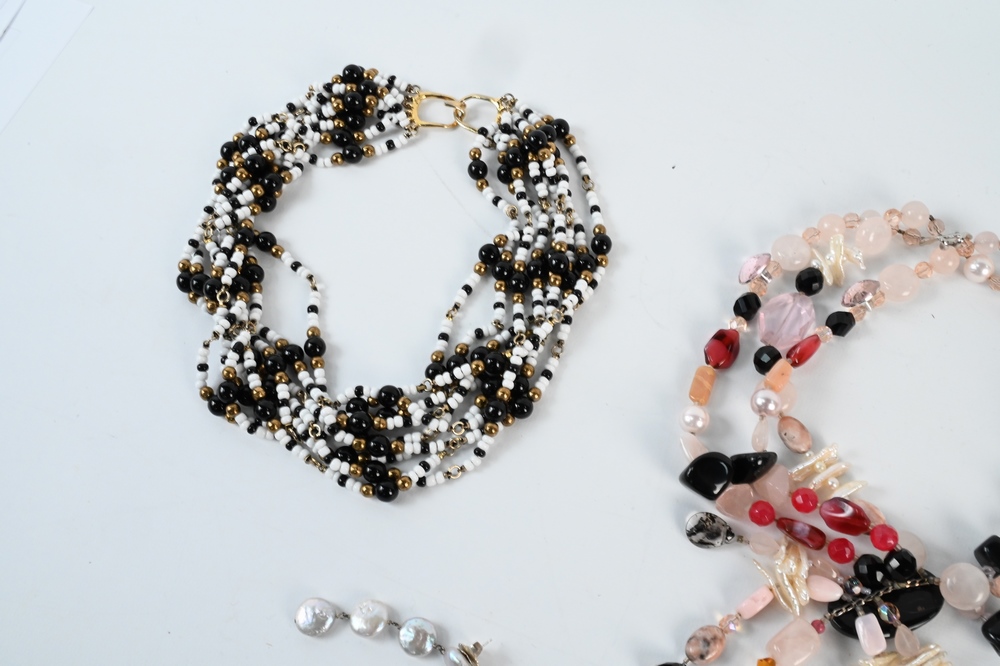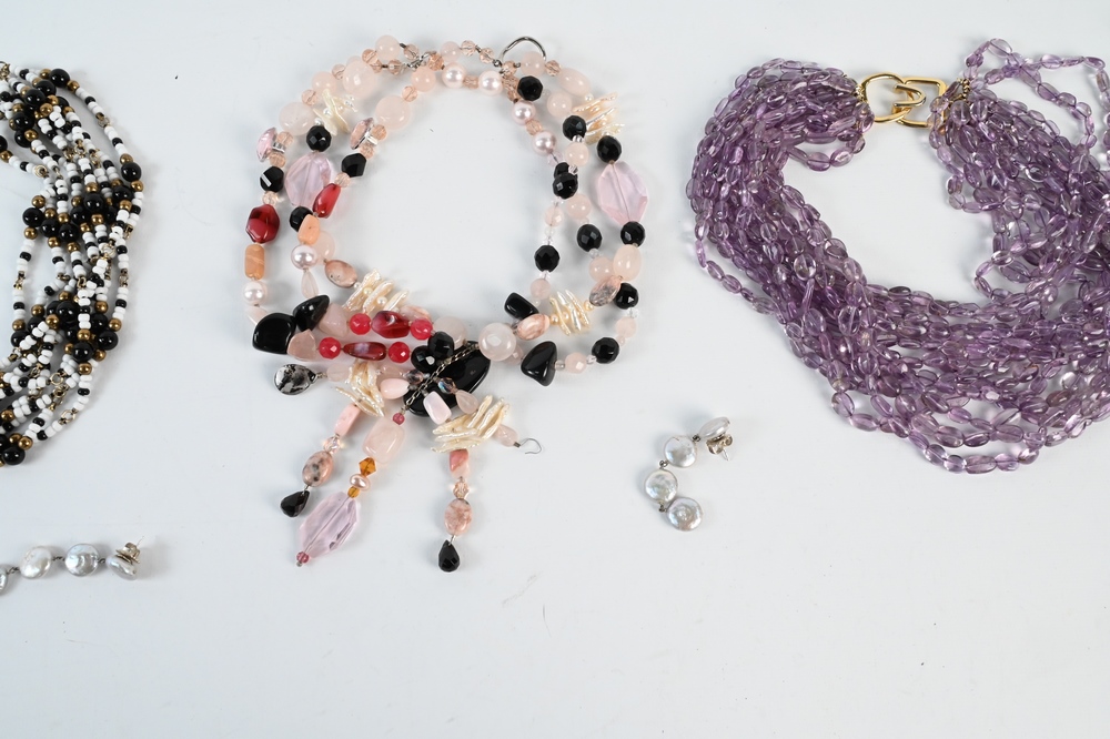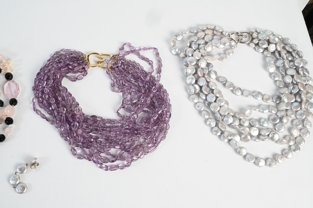 Group of Four Necklaces, to include mother of pearl six string necklace with matching earrings having sterling clasp; Kenneth Jay Lane amethyst beaded necklace, length 17 inches; multistrand necklace having black, white and gold colored beads, along with a three strand stone and gemstone necklace.