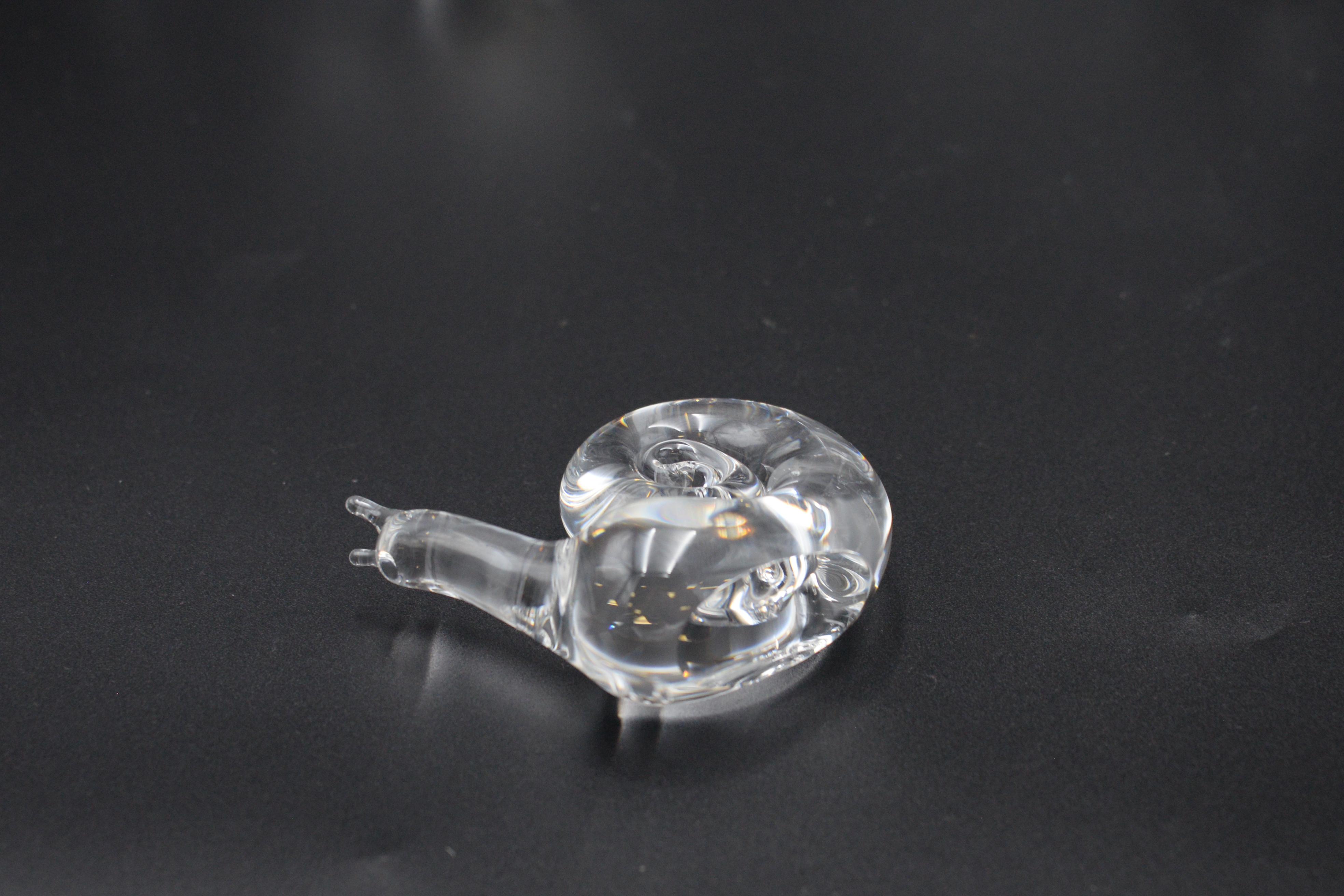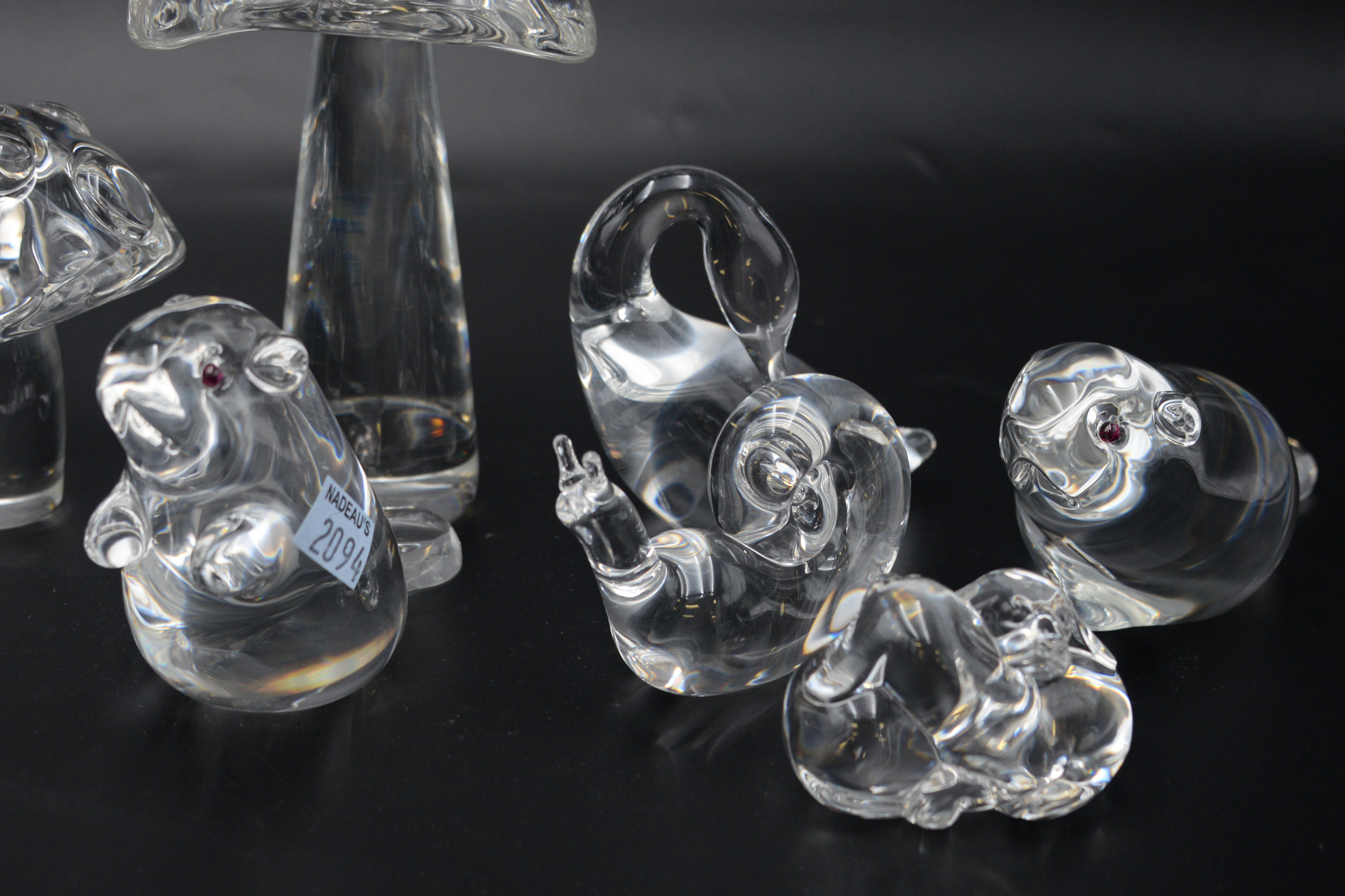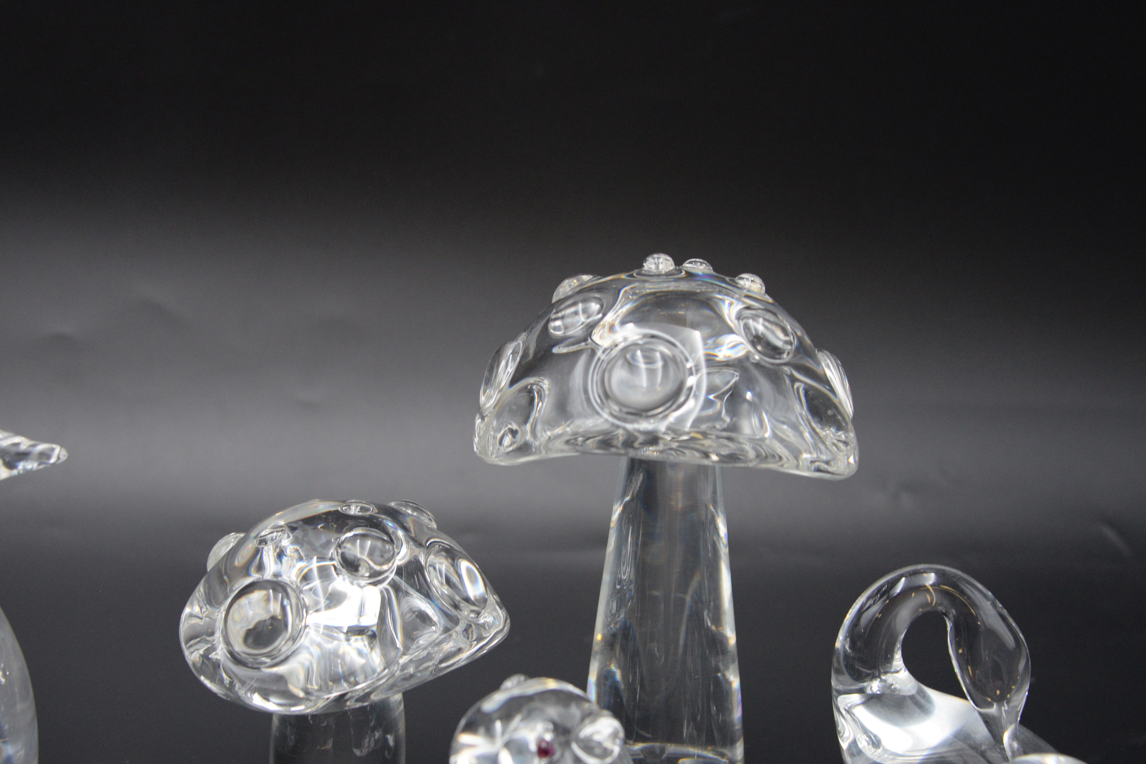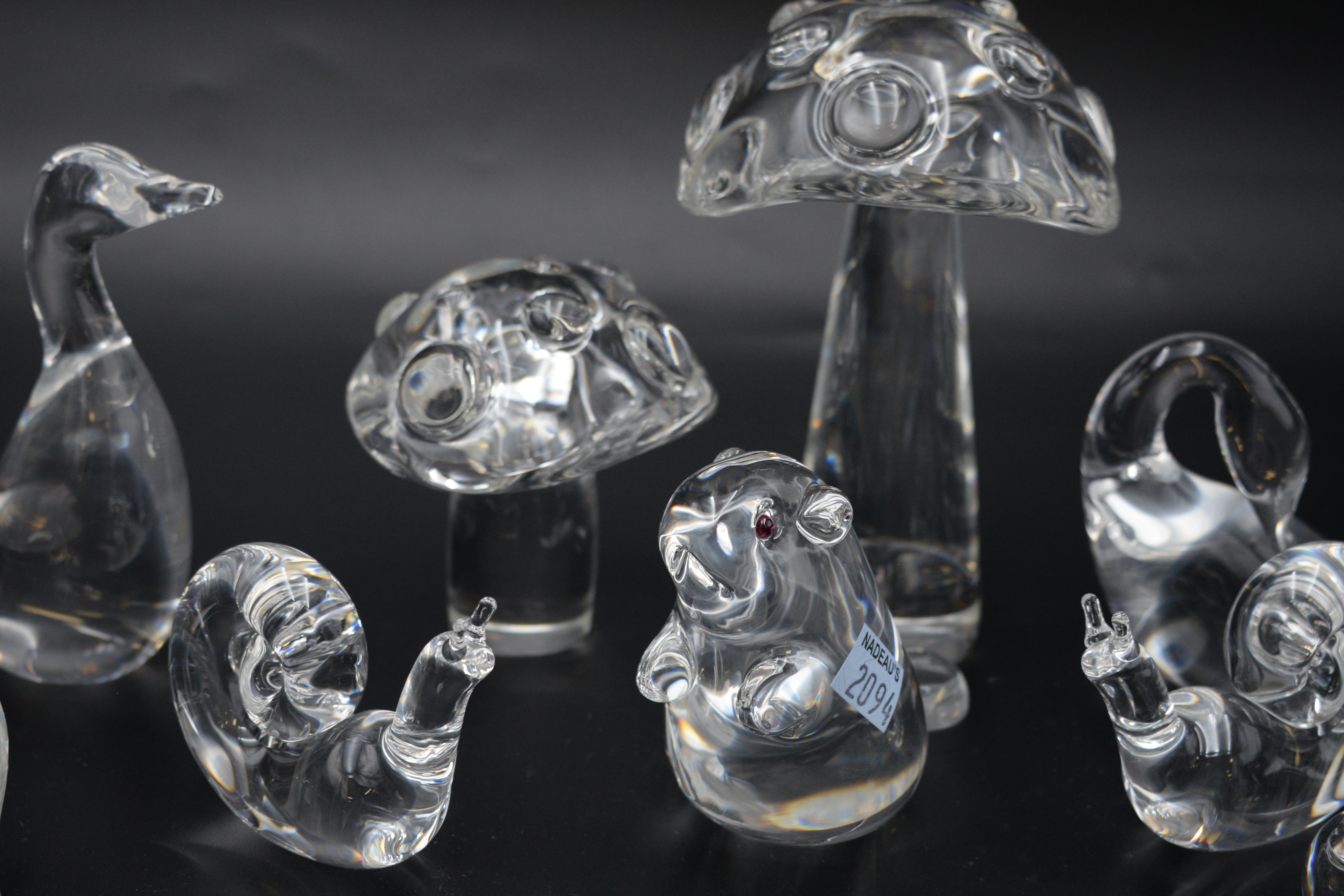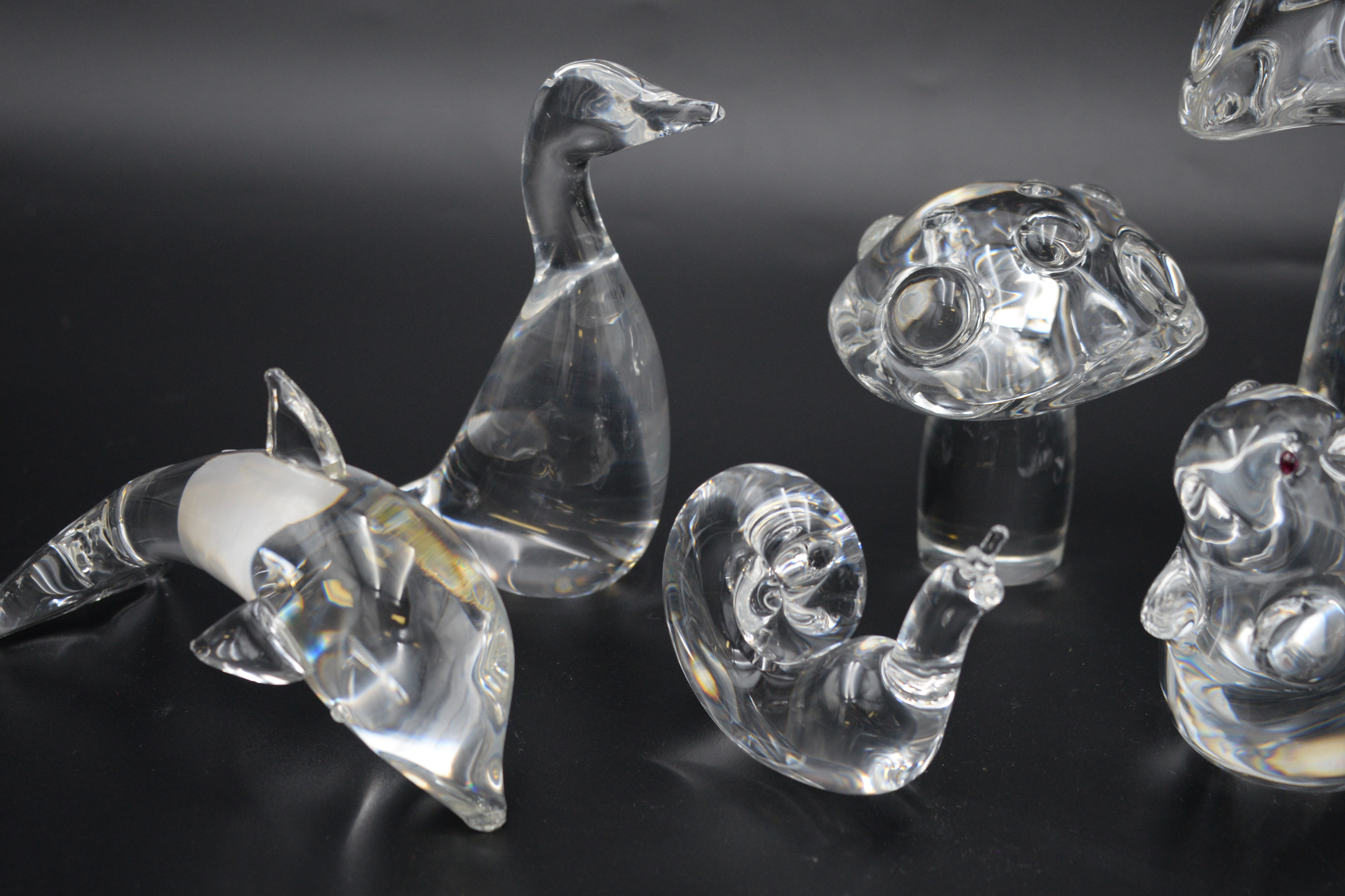 Group of Ten Steuben Crystal Figures, to include, two geese, two snails, one dolphin, cuddling puppies, two beavers with red garnet glass eyes, two mushrooms, each signed “Steuben” on bottom, tallest 6 1/2″