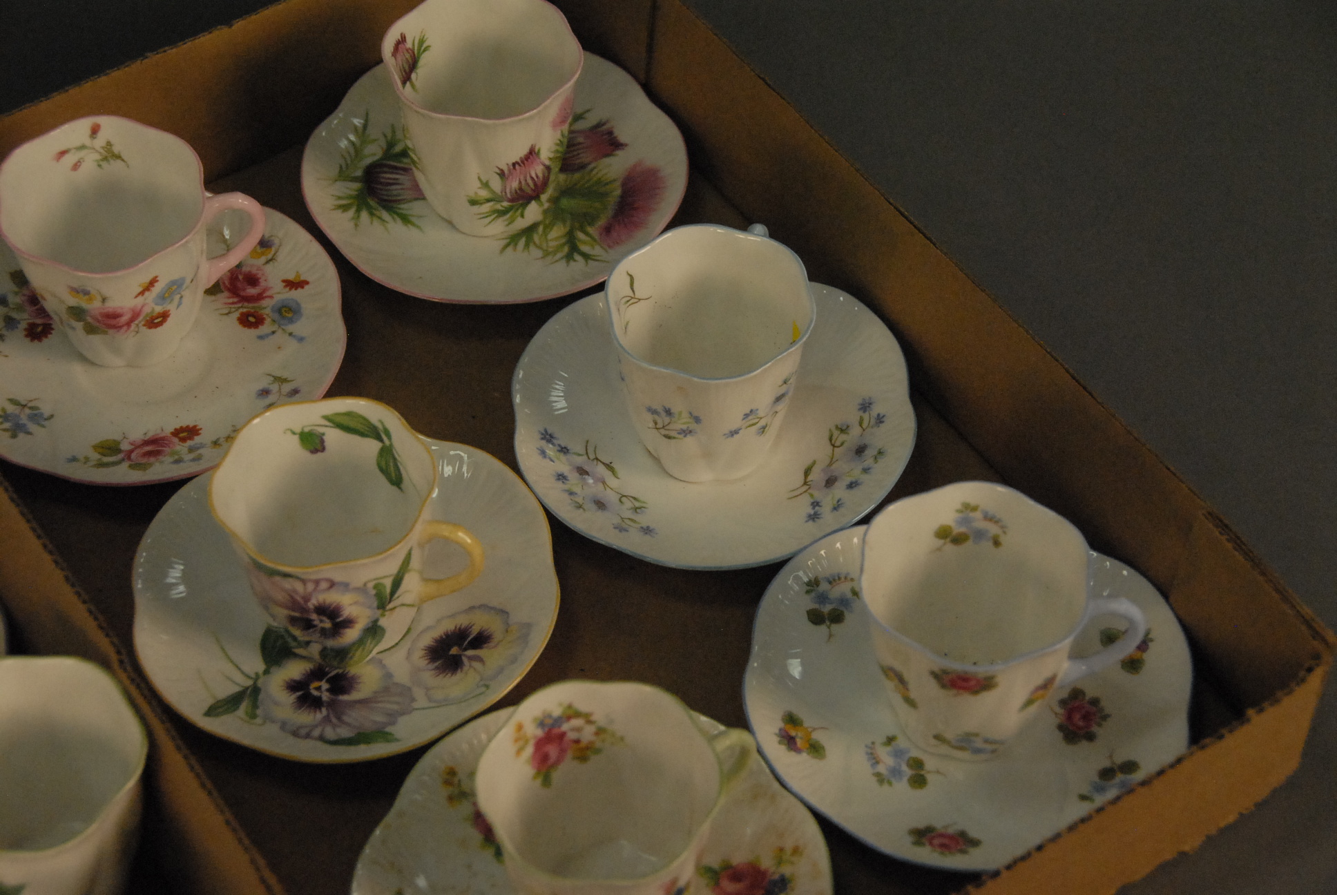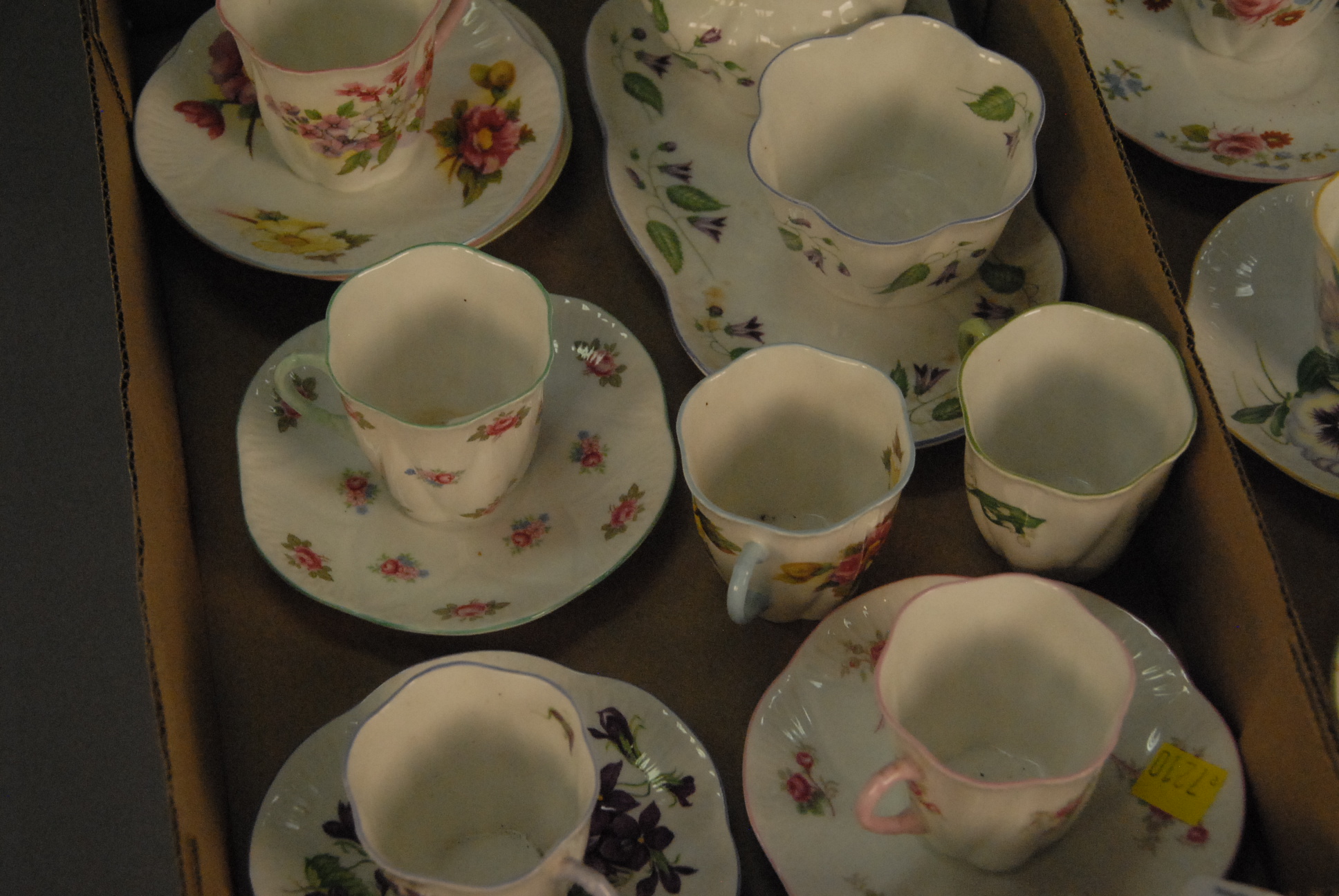Group of twelve Shelley cups and saucers along with a creamer, sugar, and tray.