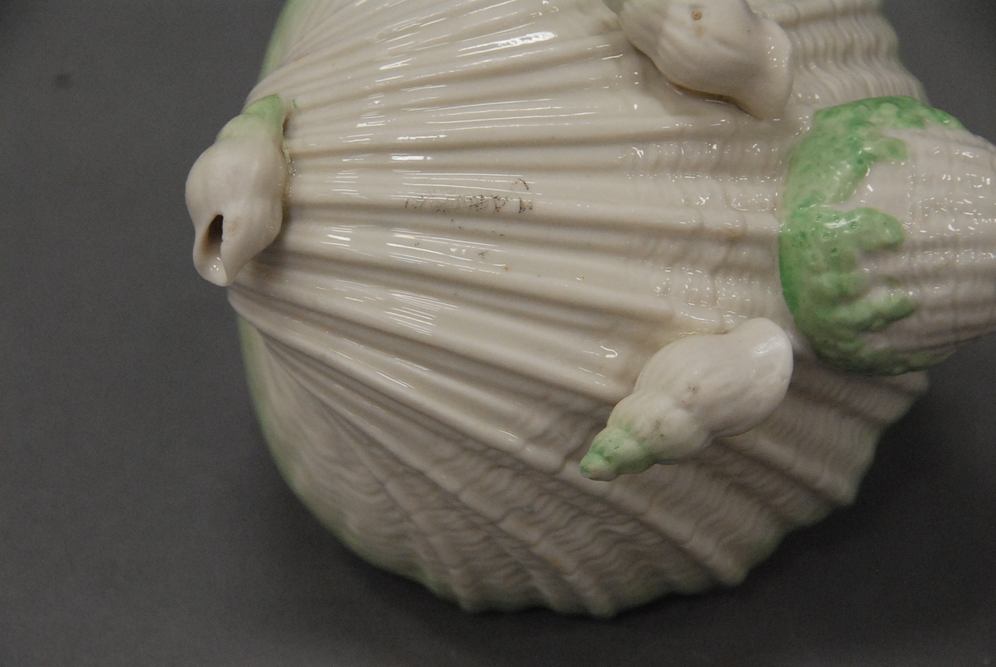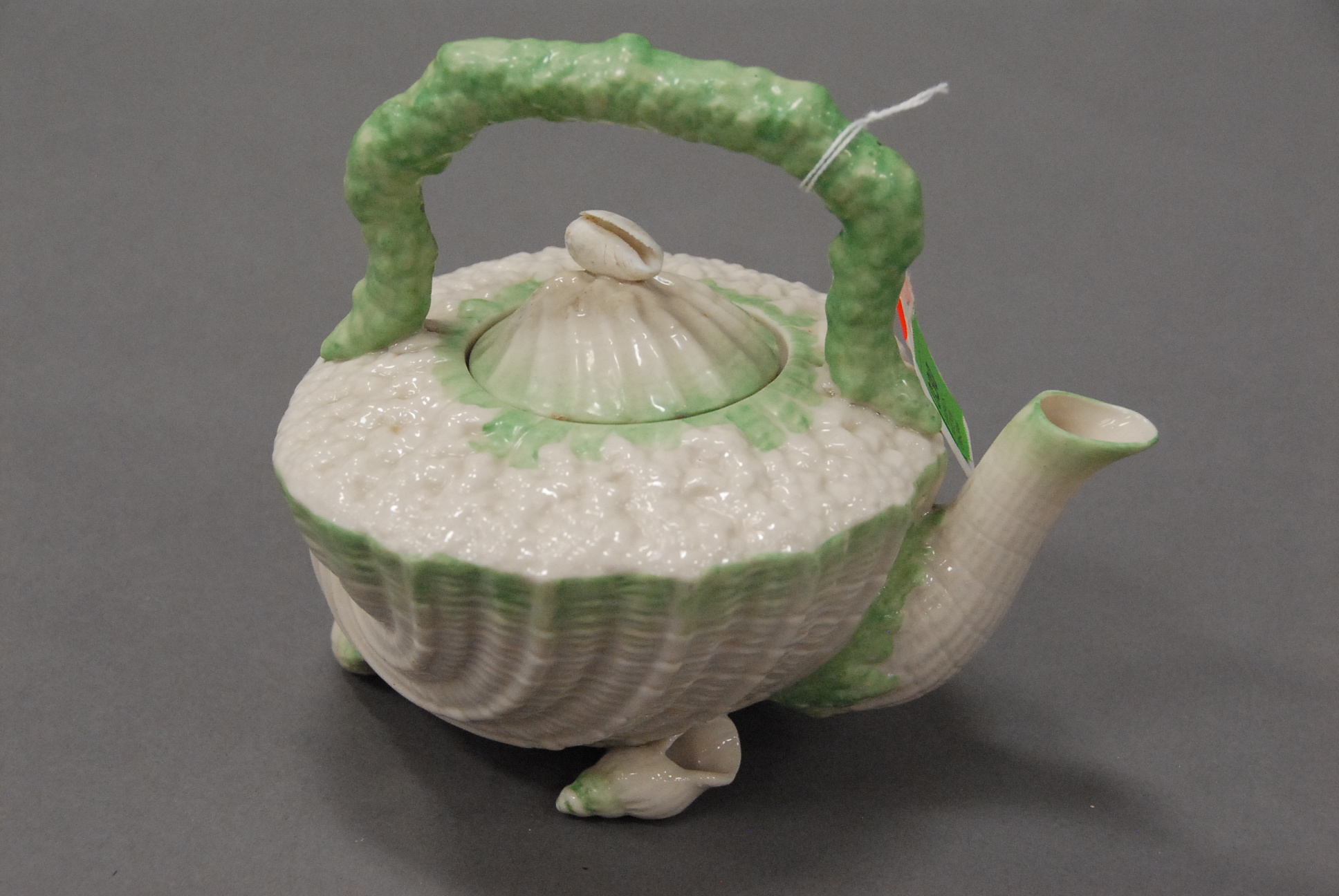 Irish Belleek tea pot with Neptune pattern and shell feet, green trim, with a black mark.