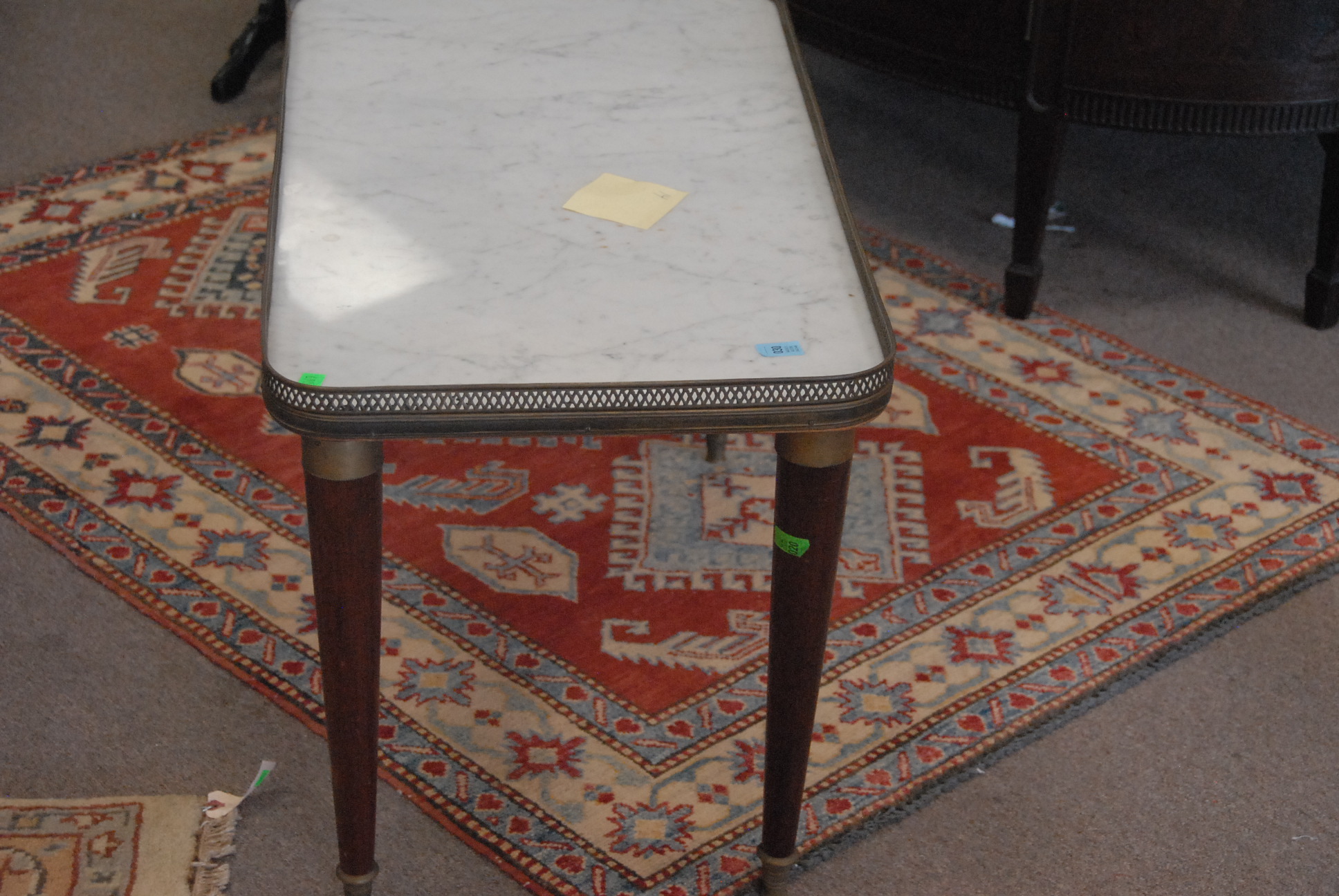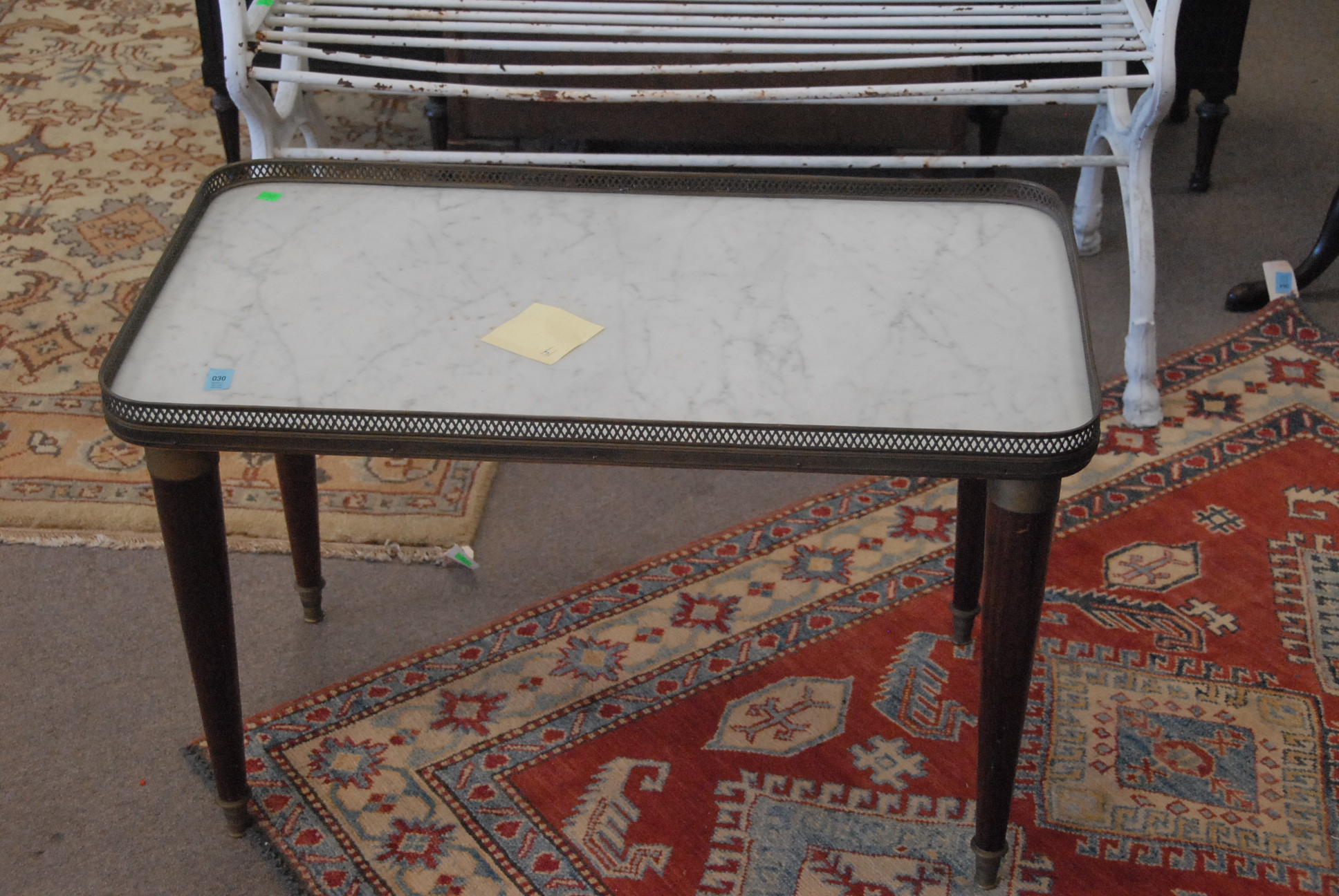Louis XVI style marble top coffee table with brass gallery.