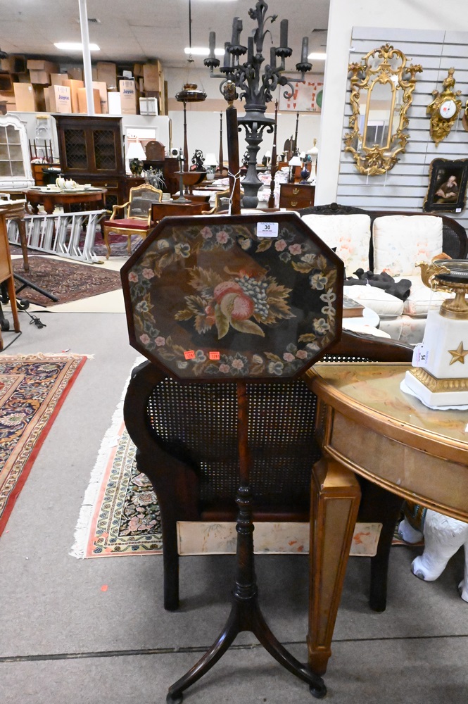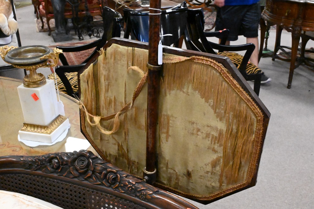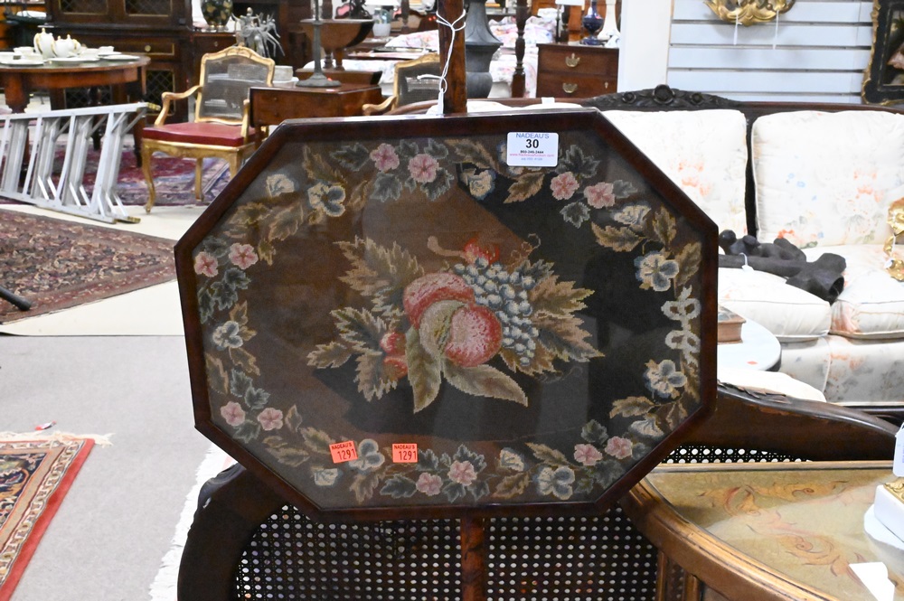 Rosewood Fire Screen, having brass inlay and needlepoint under glass, total height 55 1/2 inches, screen size 13″ x 16″.