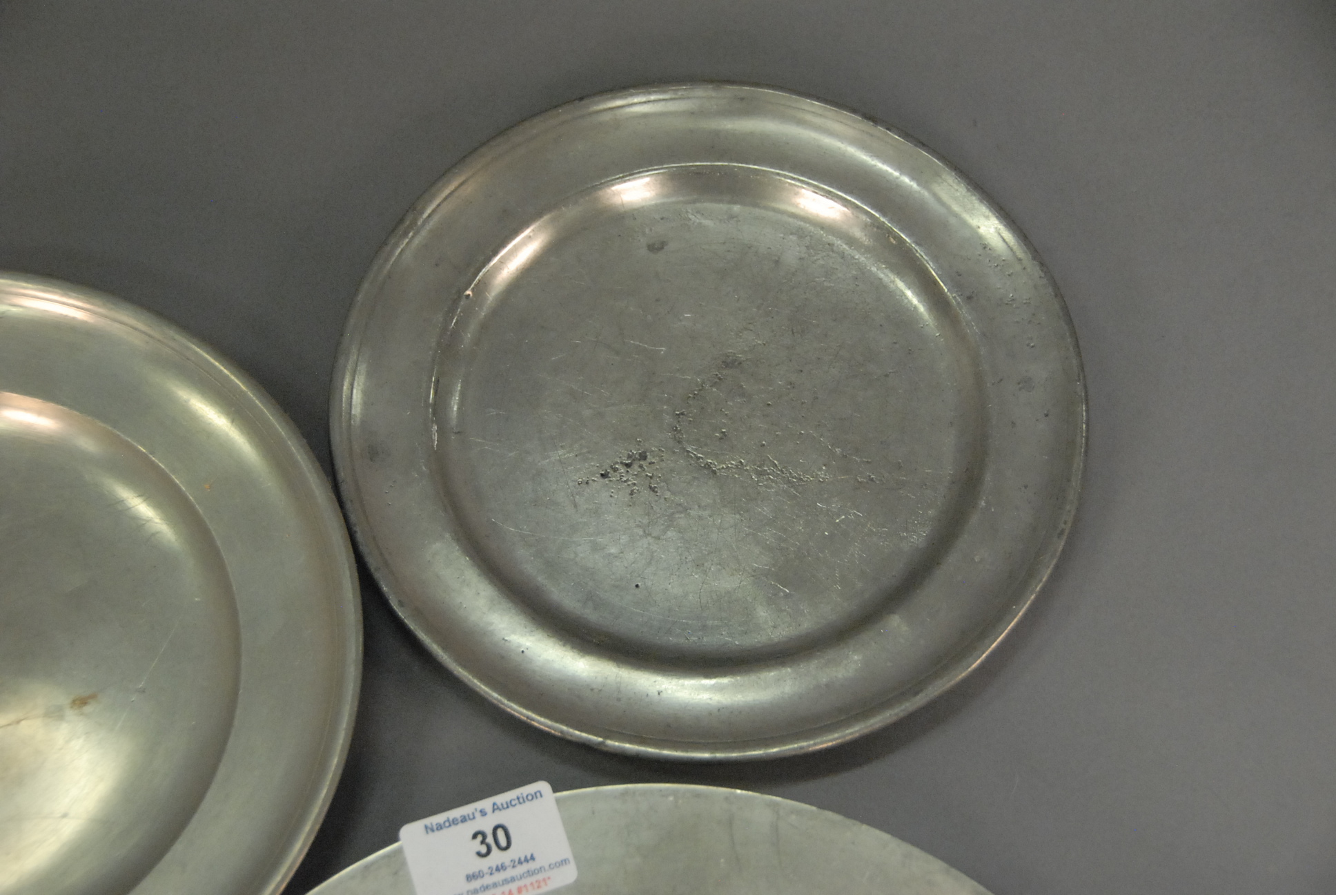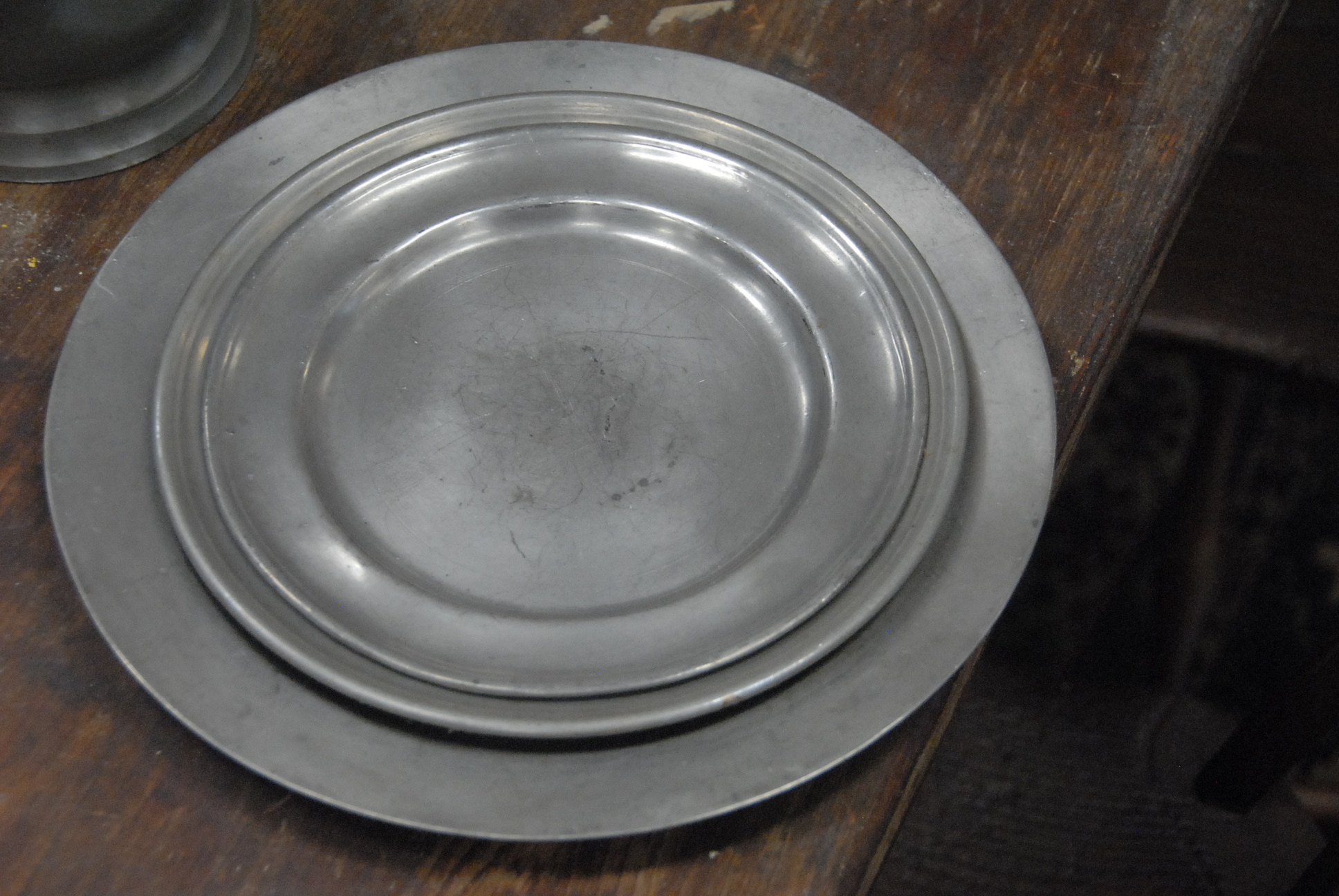 Thirty-one pewter plates in three sizes. dia. 7 3/4 in., dia. 8 3/4 in., & dia. 10 3/4 in. Provenance: Property from the Estate of Elizabeth and Edward Wallace of The Tracy House in Meriden, Connecticut.