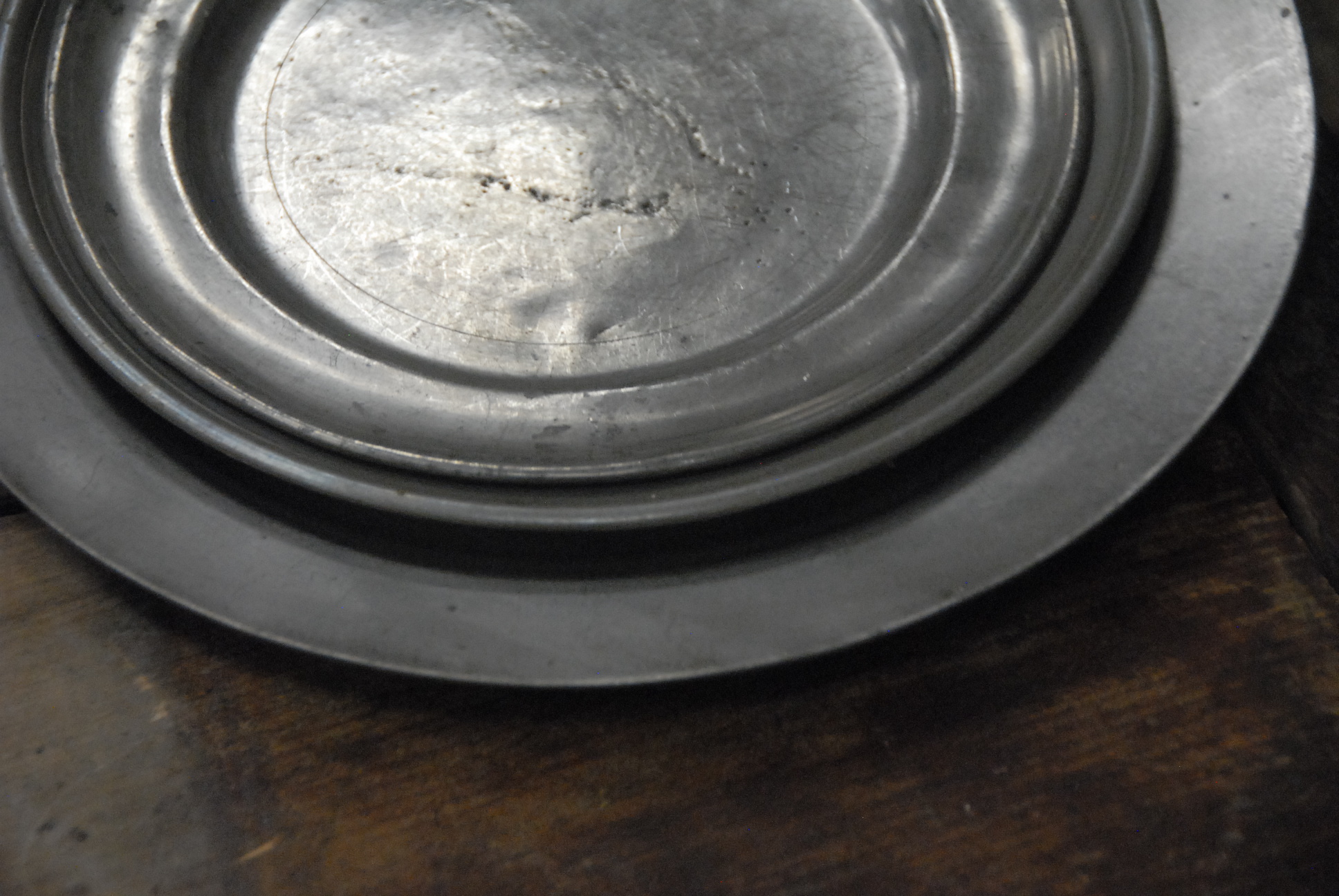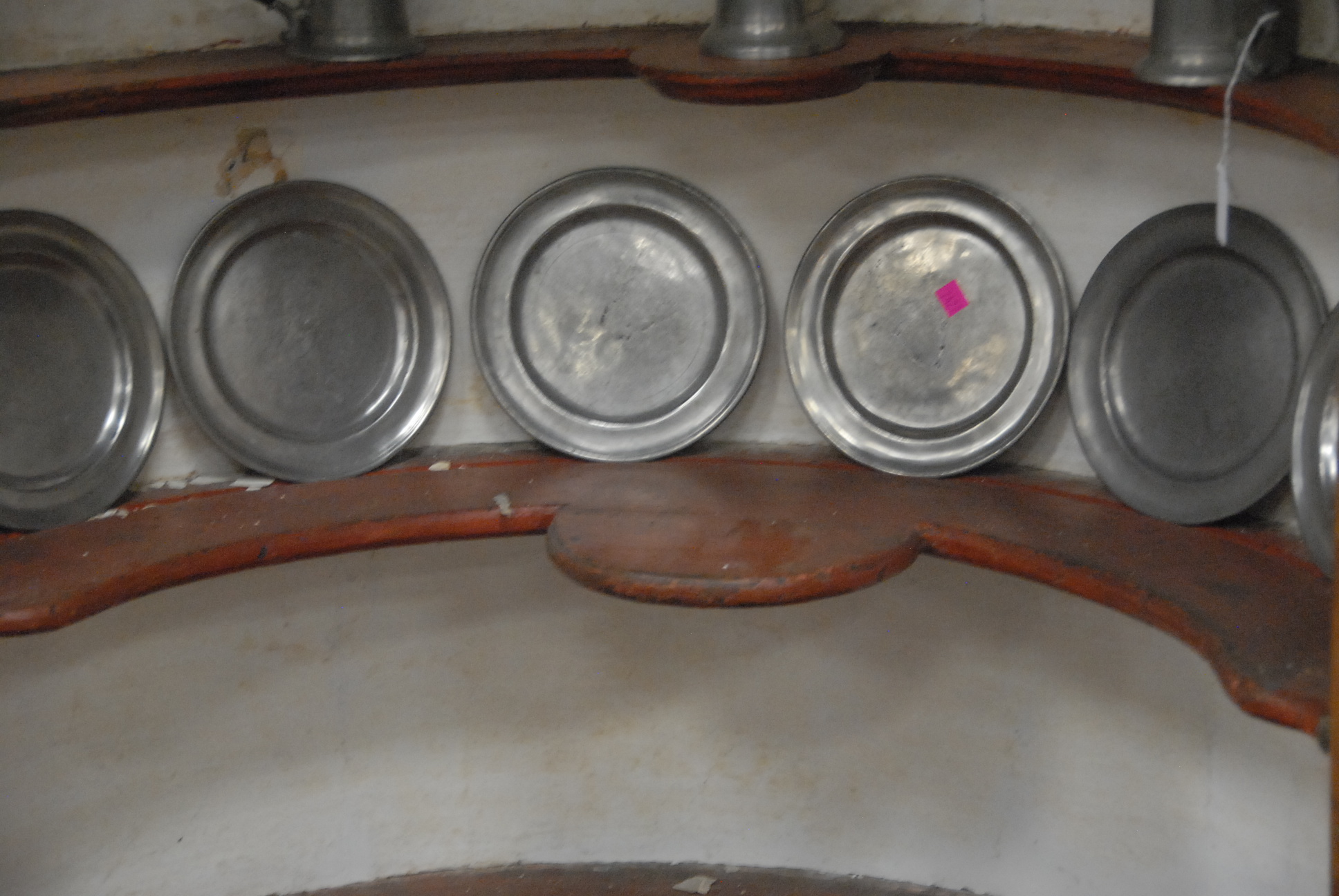 Lot 30: Thirty-one pewter plates in three sizes. dia. 7 3/4 in., dia. 8 3/4 in., & dia. 10 3/4 in. Provenance: Property from the Estate of Elizabeth and Edward Wallace of The Tracy House in Meriden, Connecticut.