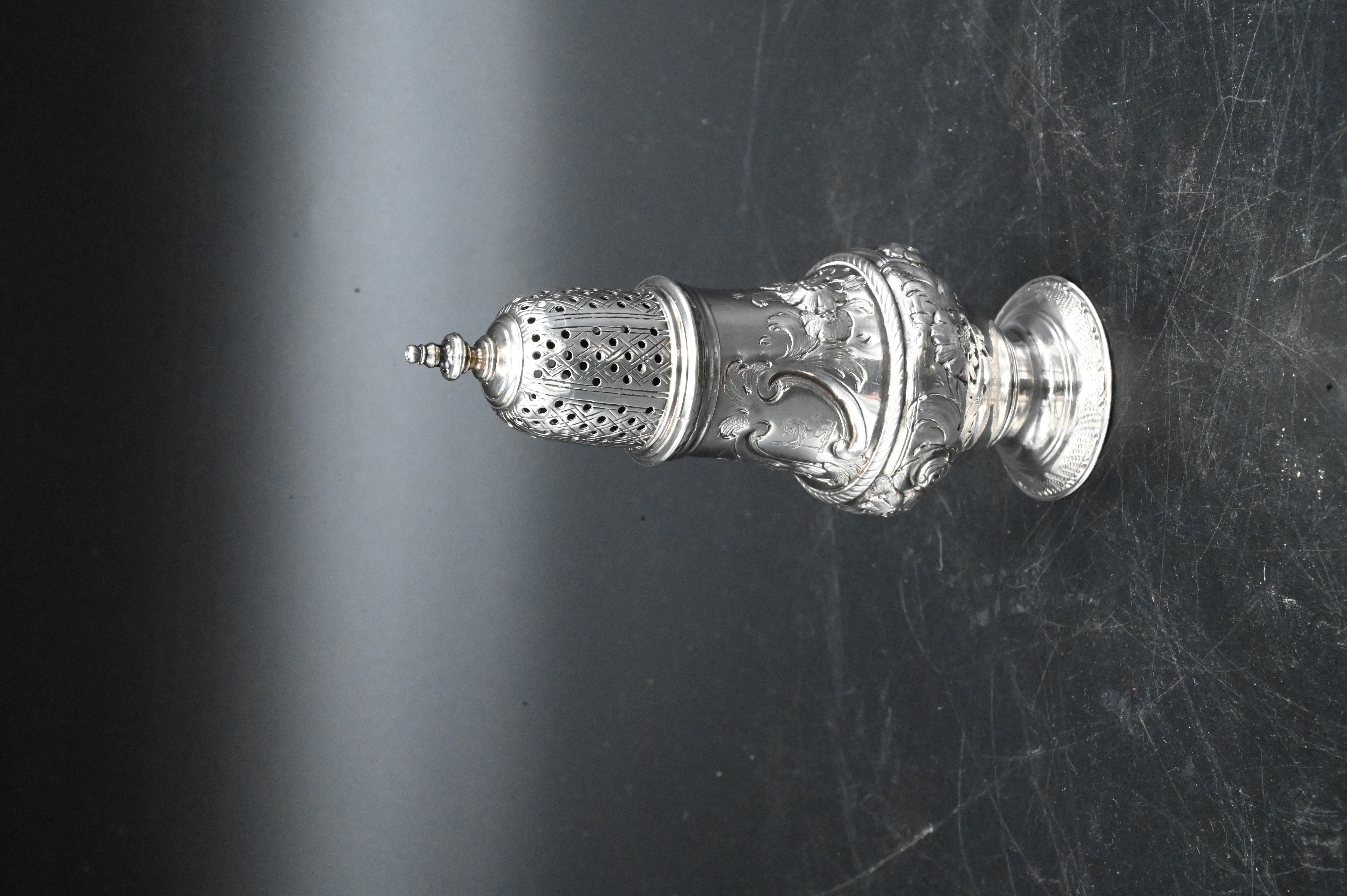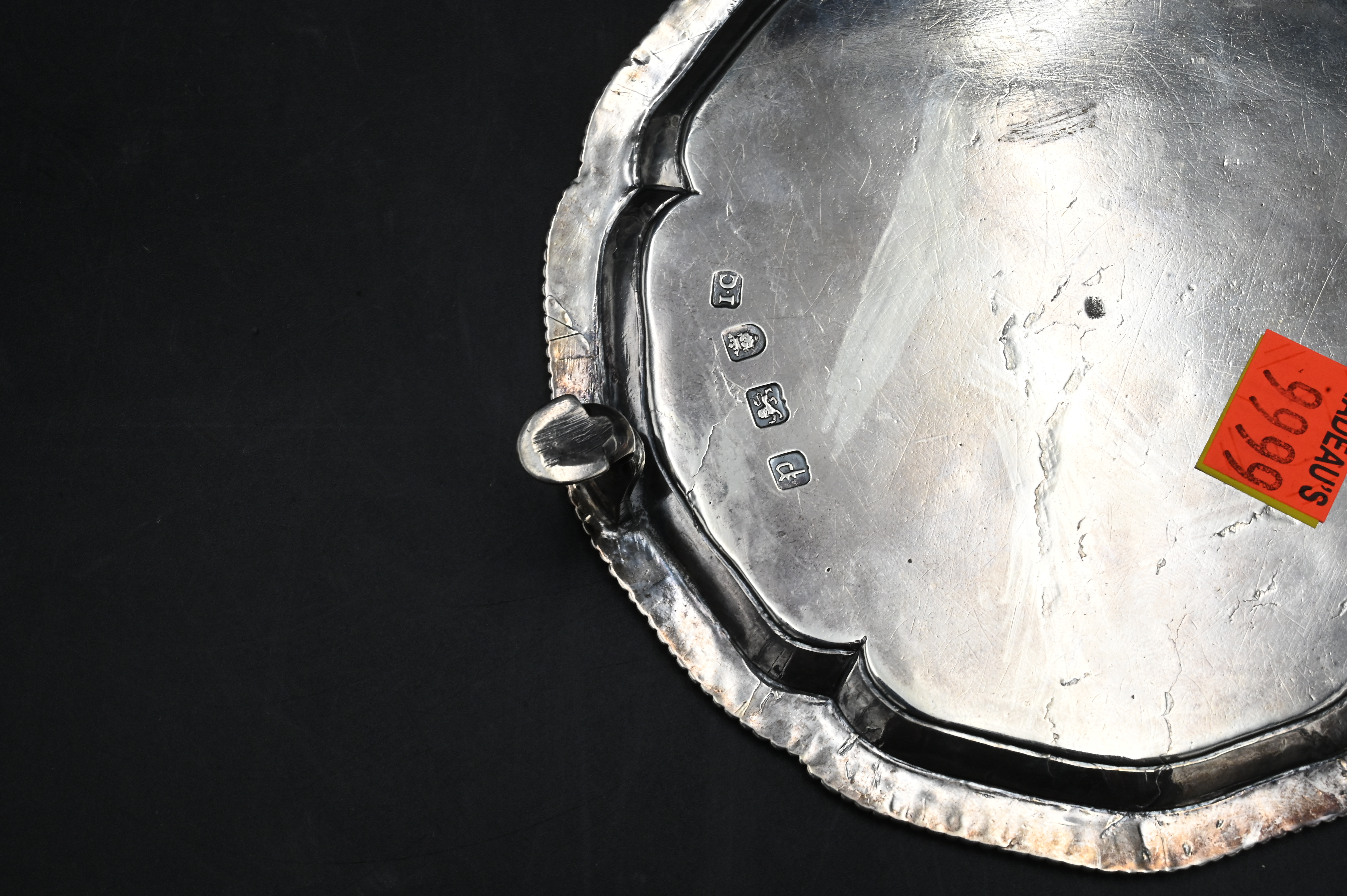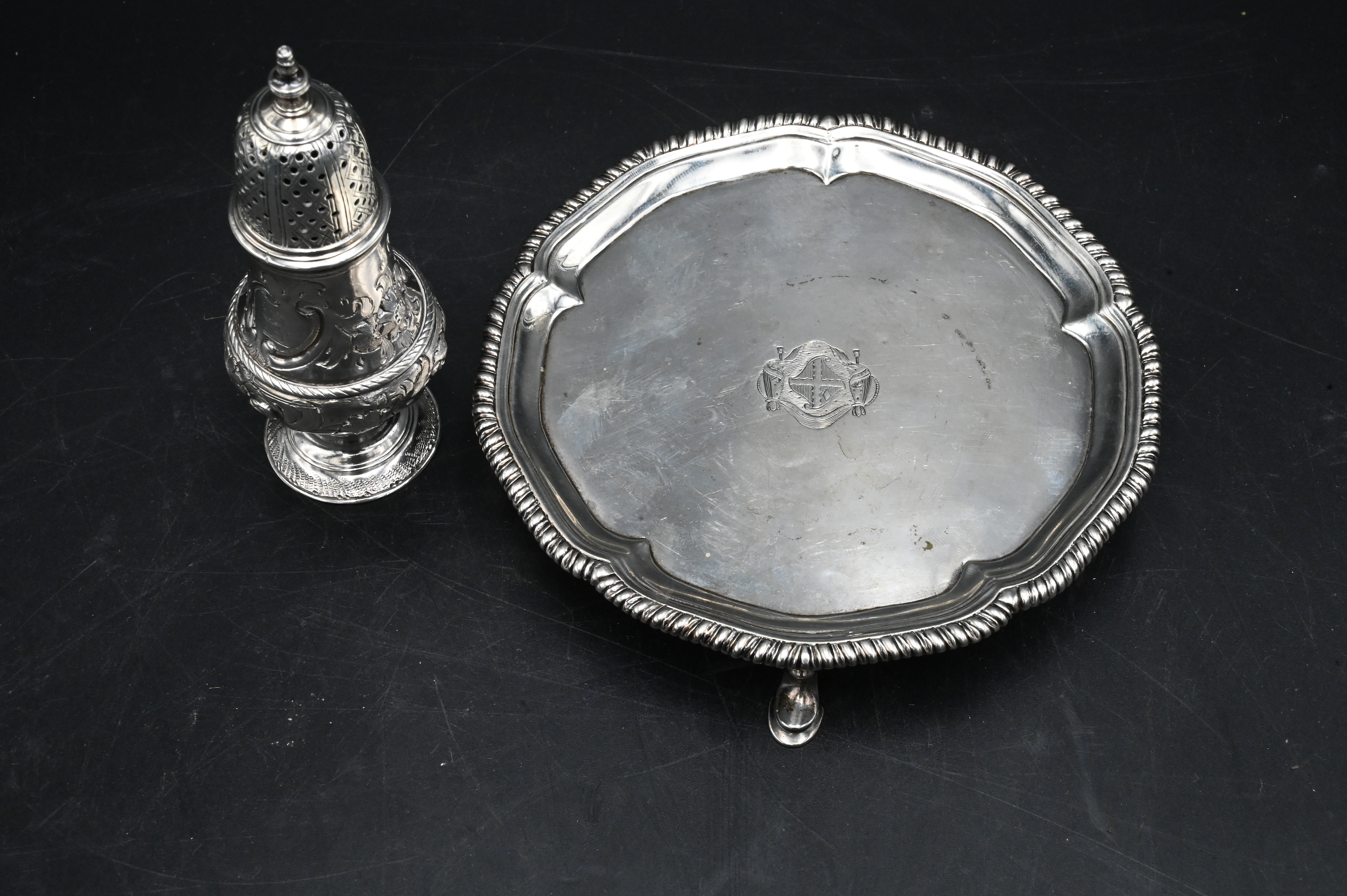Two Piece George III Silver Pieces, Silver Salver, probably John Carter 1772, diameter 5 1/2 inches, along with a pepper shaker, small caster, R. Peaston 1756-1764