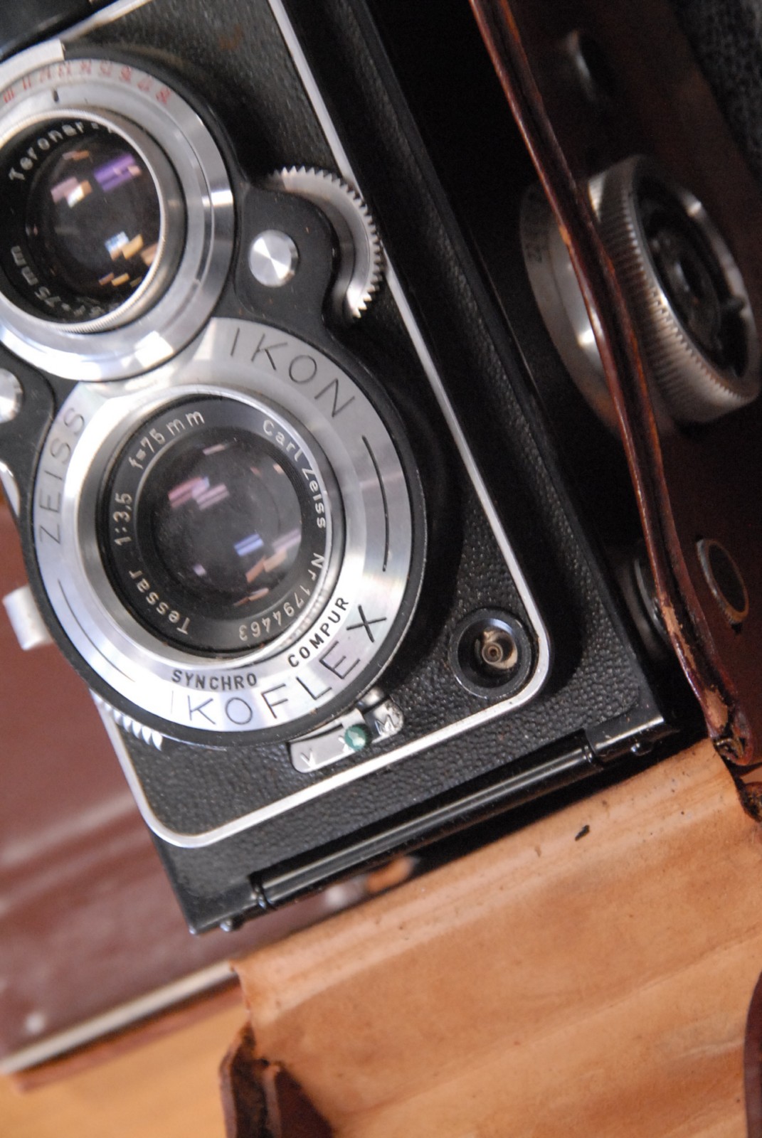 Two vintage cameras a Nikkormat and a Zeiss icon box camera