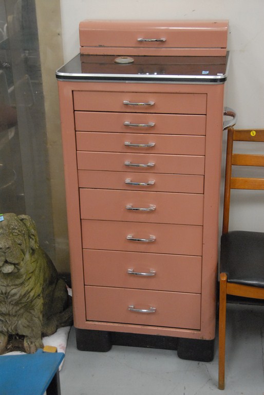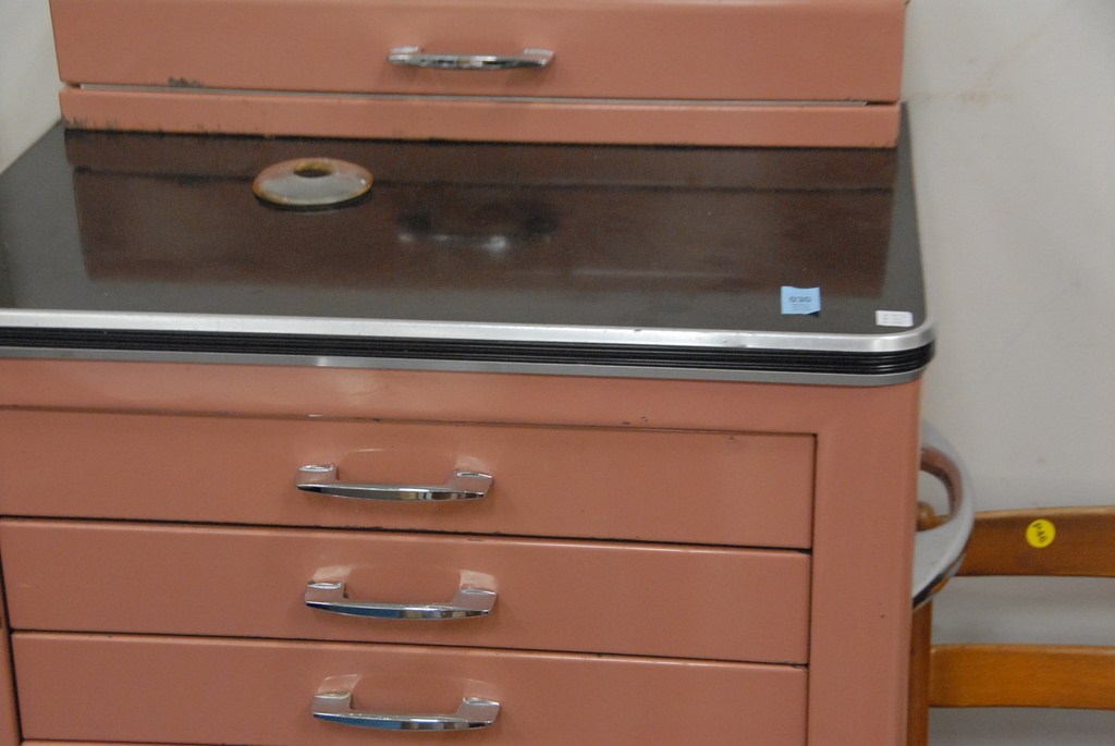 Lot 30: Vintage metal dental cabinet in original pink with black top some paint loss, ht. 47 1/2in. wd. 25in.