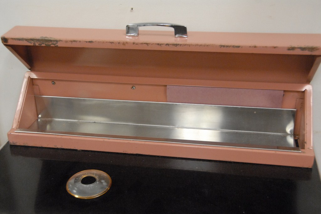 Vintage metal dental cabinet in original pink with black top some paint loss, ht. 47 1/2in. wd. 25in.