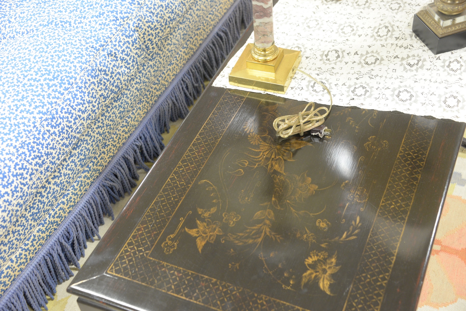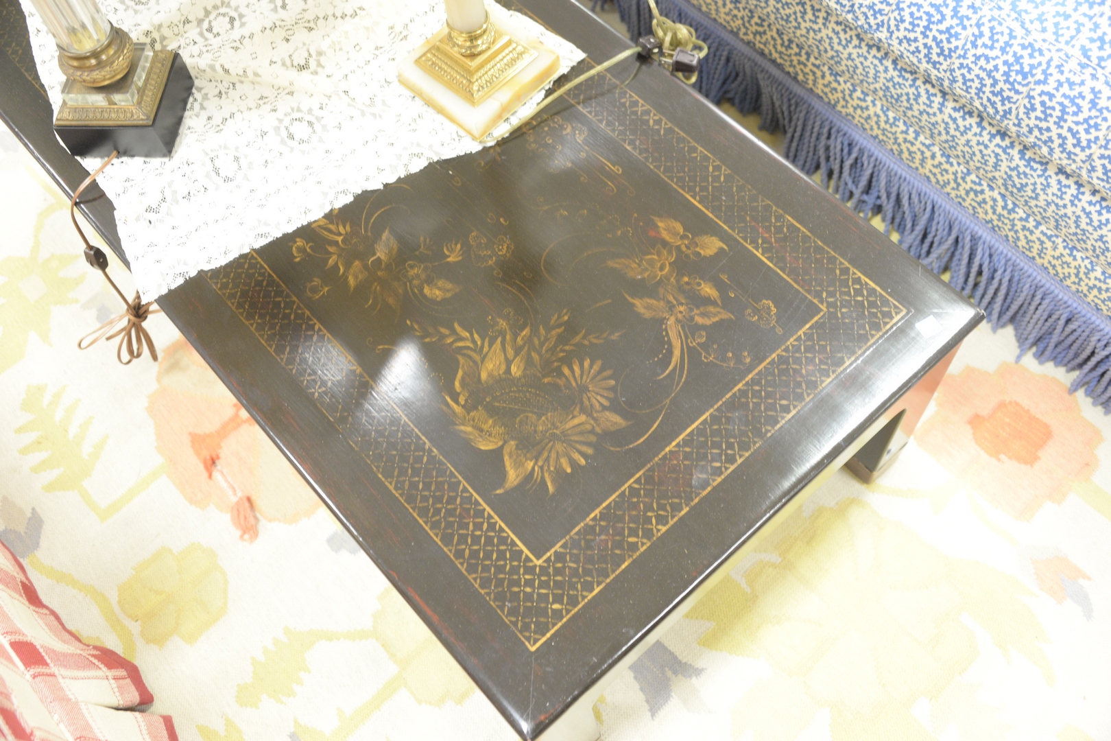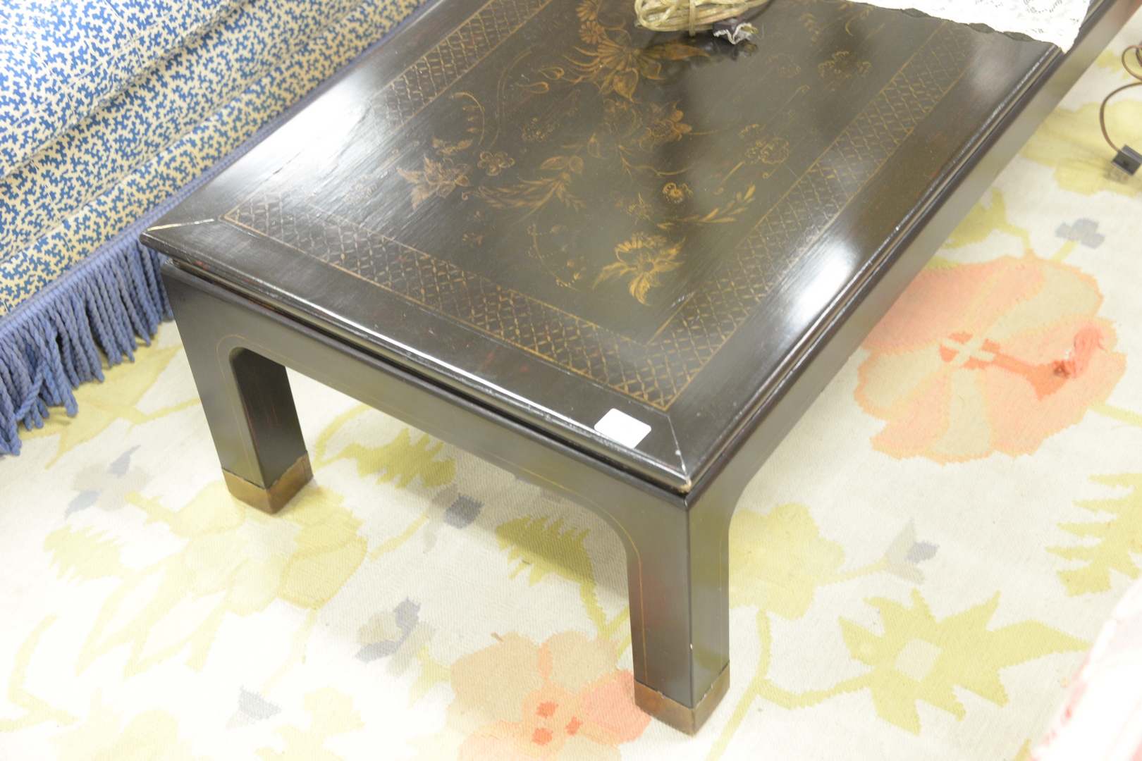 Lot 300: Asian Style Black Lacquer and Gilt Decorated Coffee Table, brass capped feet, height 14 inches, top 23 x 48.