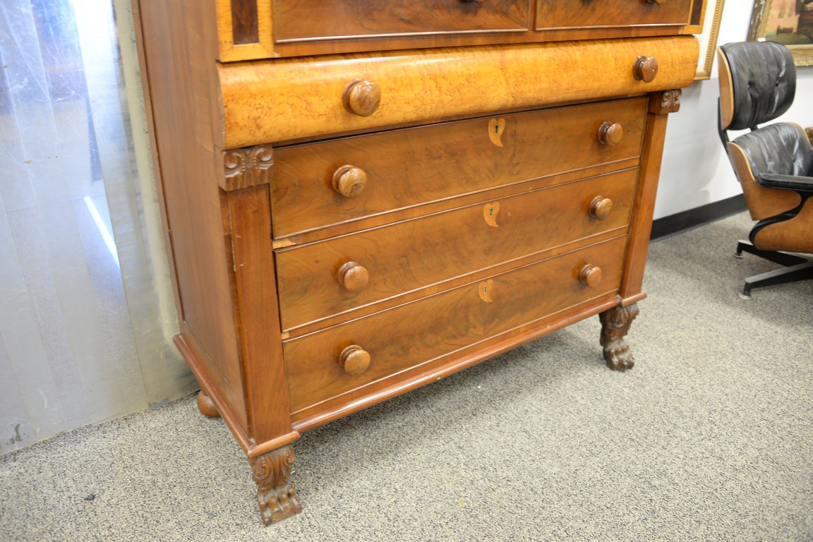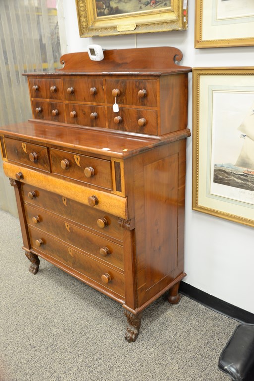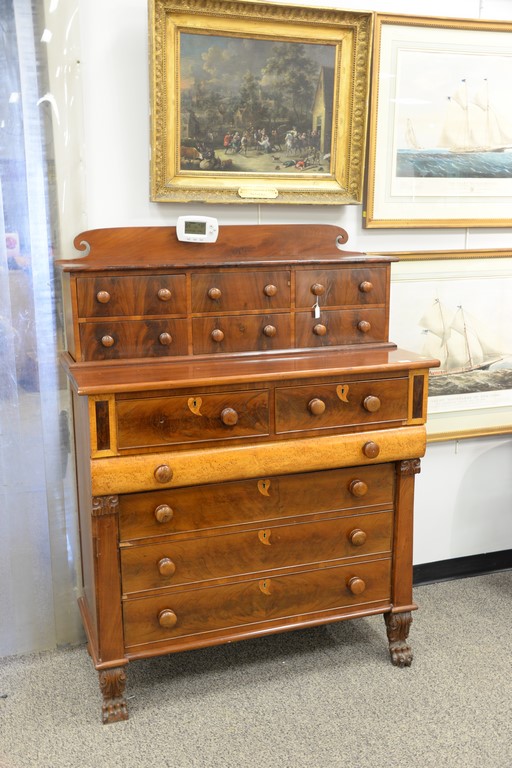 Empire mahogany and birdseye maple chest having stacked double drawer top over two short drawers with heart inlays over birdseye maple drawer over three drawers set on carved paw feet, circa 1840.