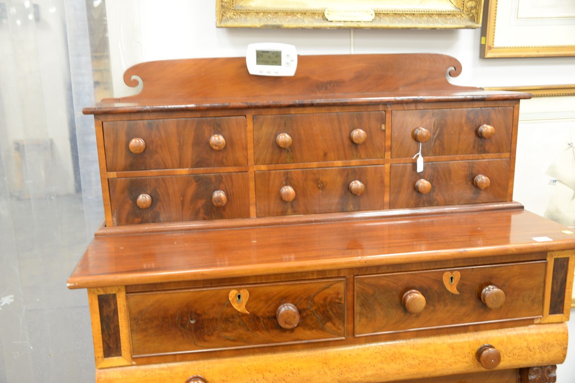 Lot 300: Empire mahogany and birdseye maple chest having stacked double drawer top over two short drawers with heart inlays over birdseye map…