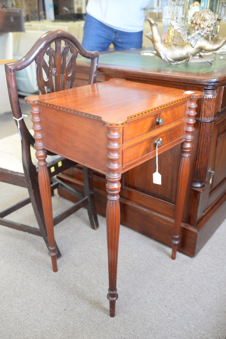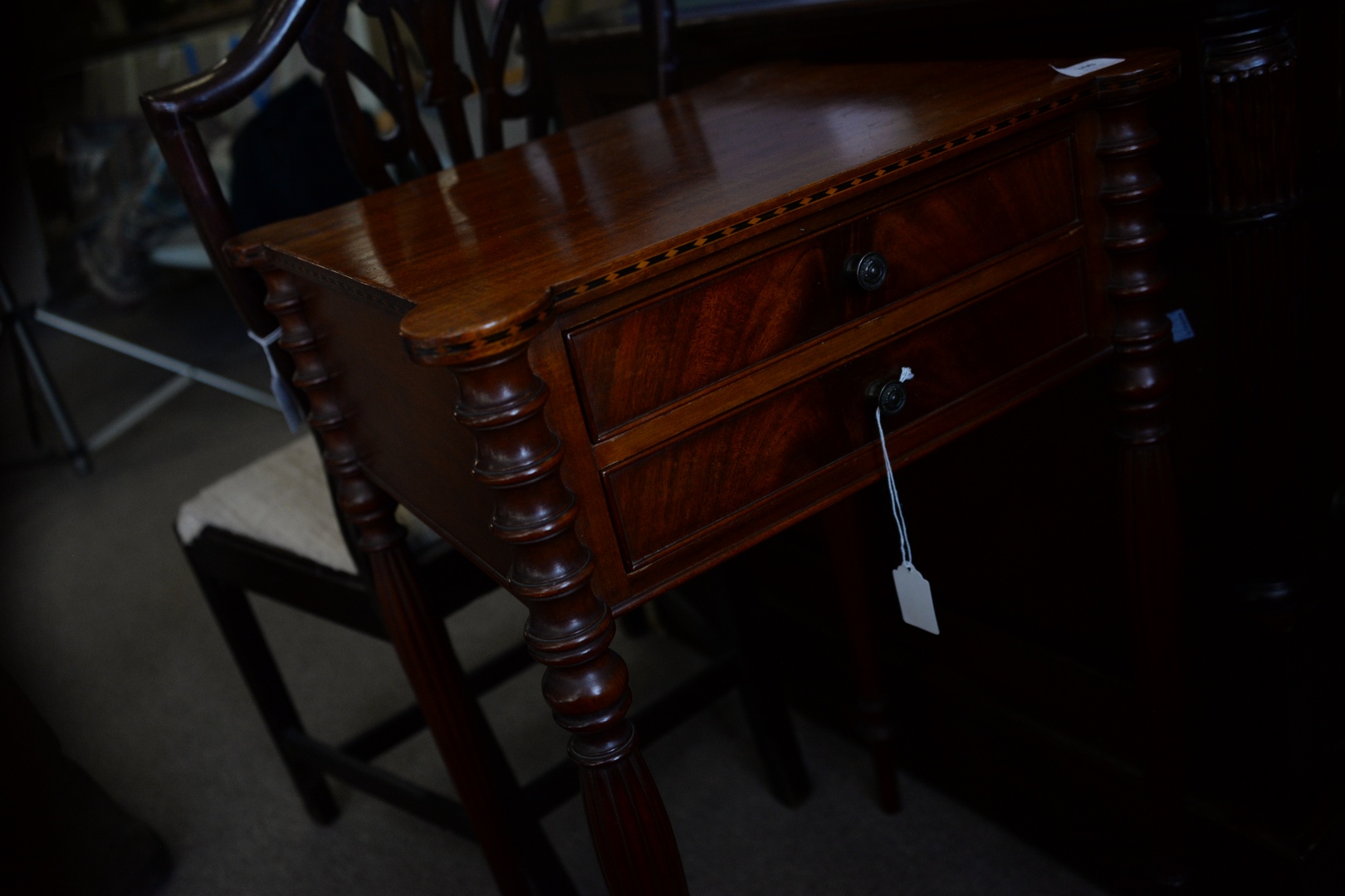 Lot 300: Fineberg Mahogany Two Drawer Sheraton Style Stand with turret corners height 29 1/2 inches, top 16 x 18 1/2
