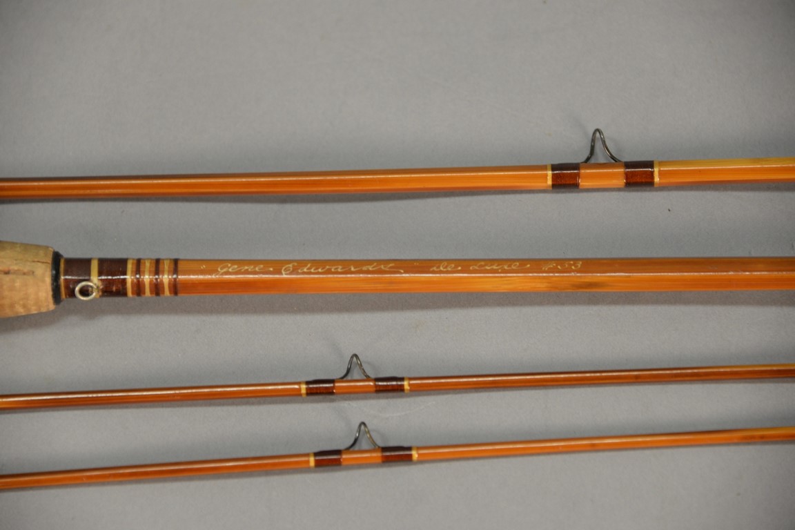 Gene Edward De Luxe #53 vintage three piece bamboo fly rod with case, lg. 7 1/2′, 4 1/2oz., with two full tips in original Eugene F. Edwards cloth.