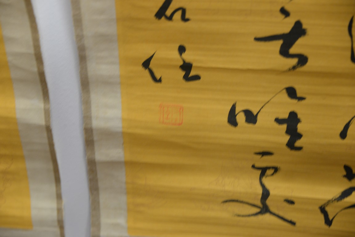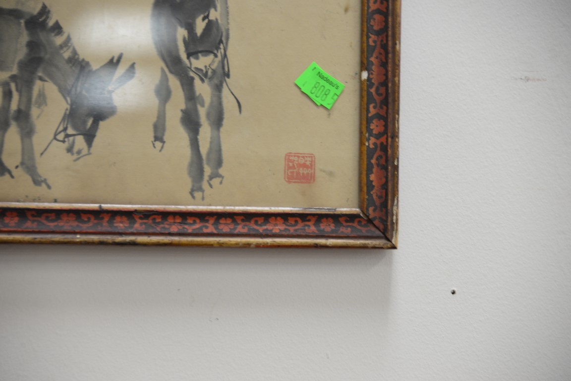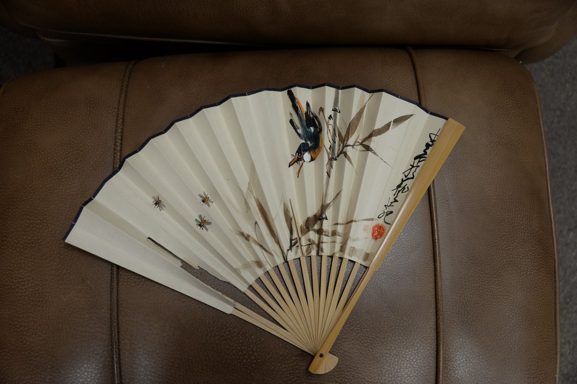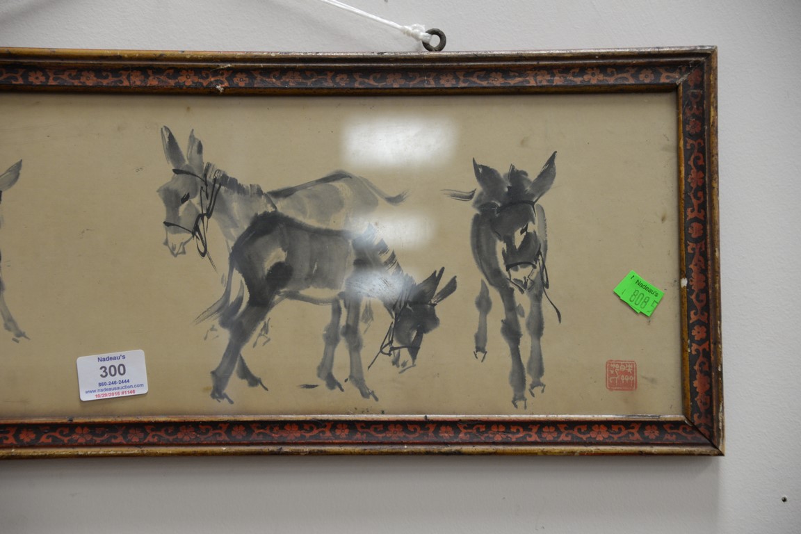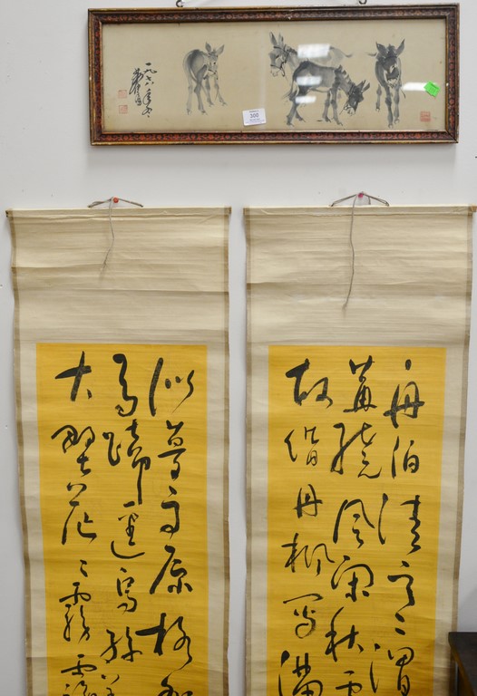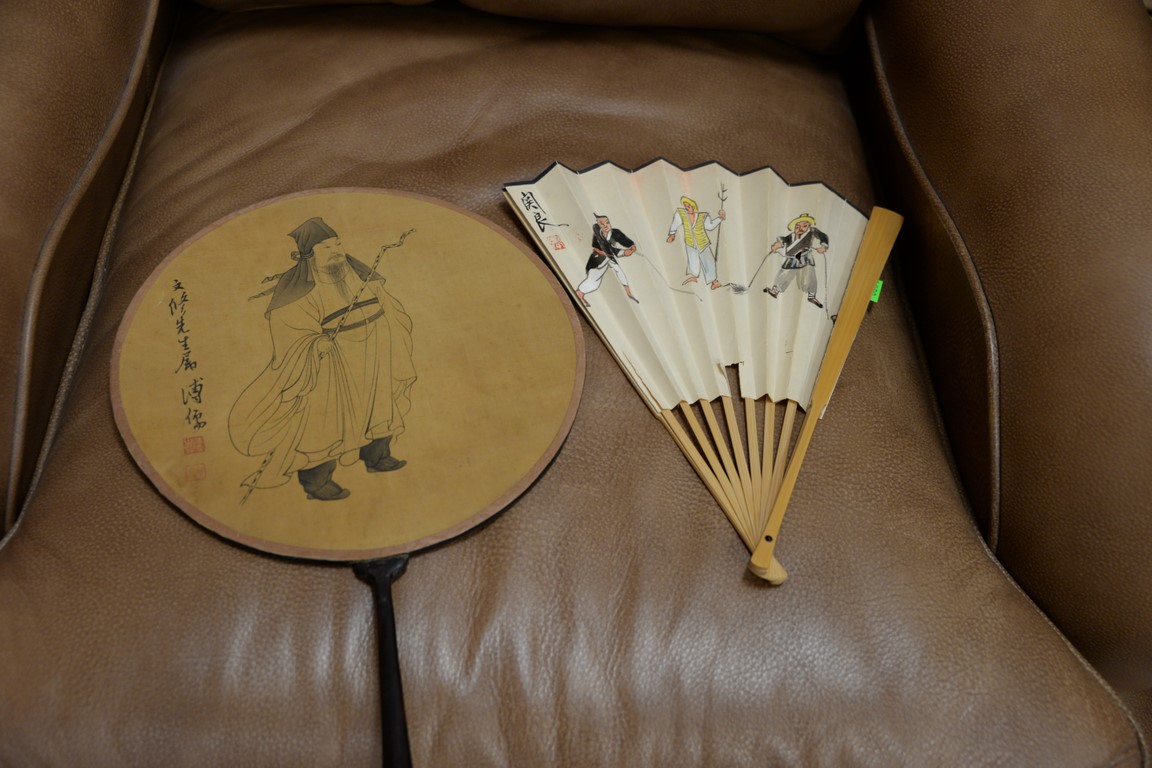 Lot 300: Group of Oriental paintings to include a pair of scrolls, pair of Chinese painted fans, round fan, and a framed watercolor 7 1/2 x…