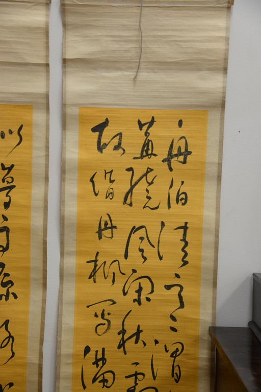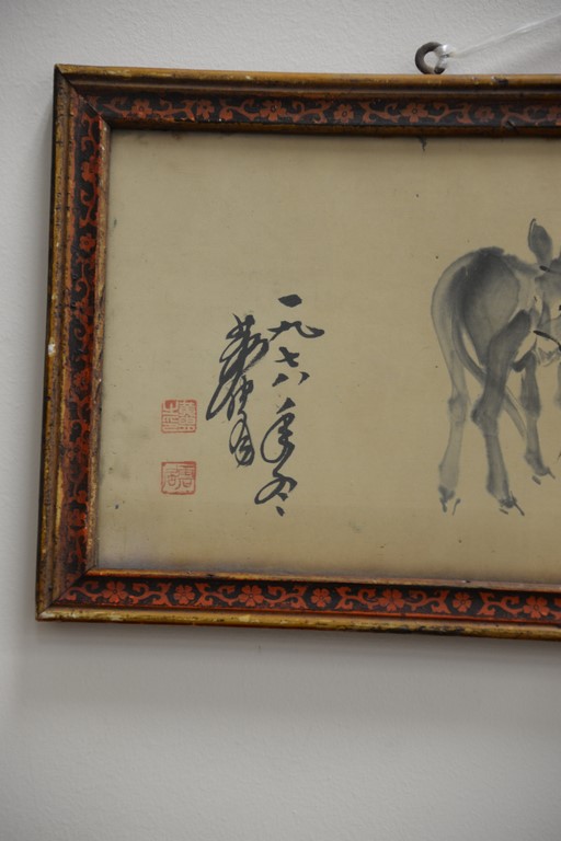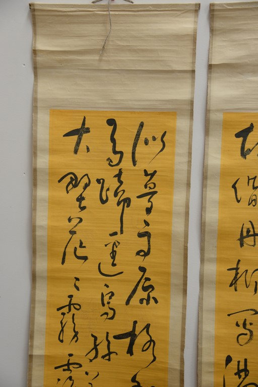 Group of Oriental paintings to include a pair of scrolls, pair of Chinese painted fans, round fan, and a framed watercolor 7 1/2 x 23 1/2.