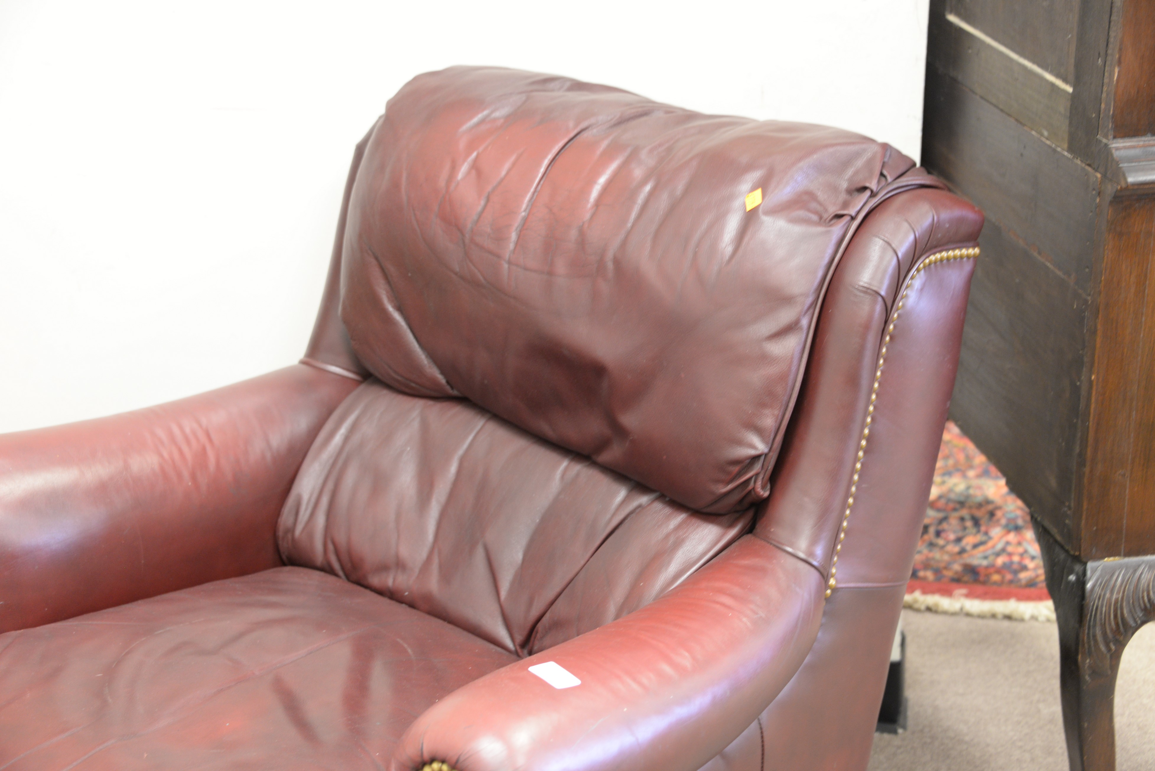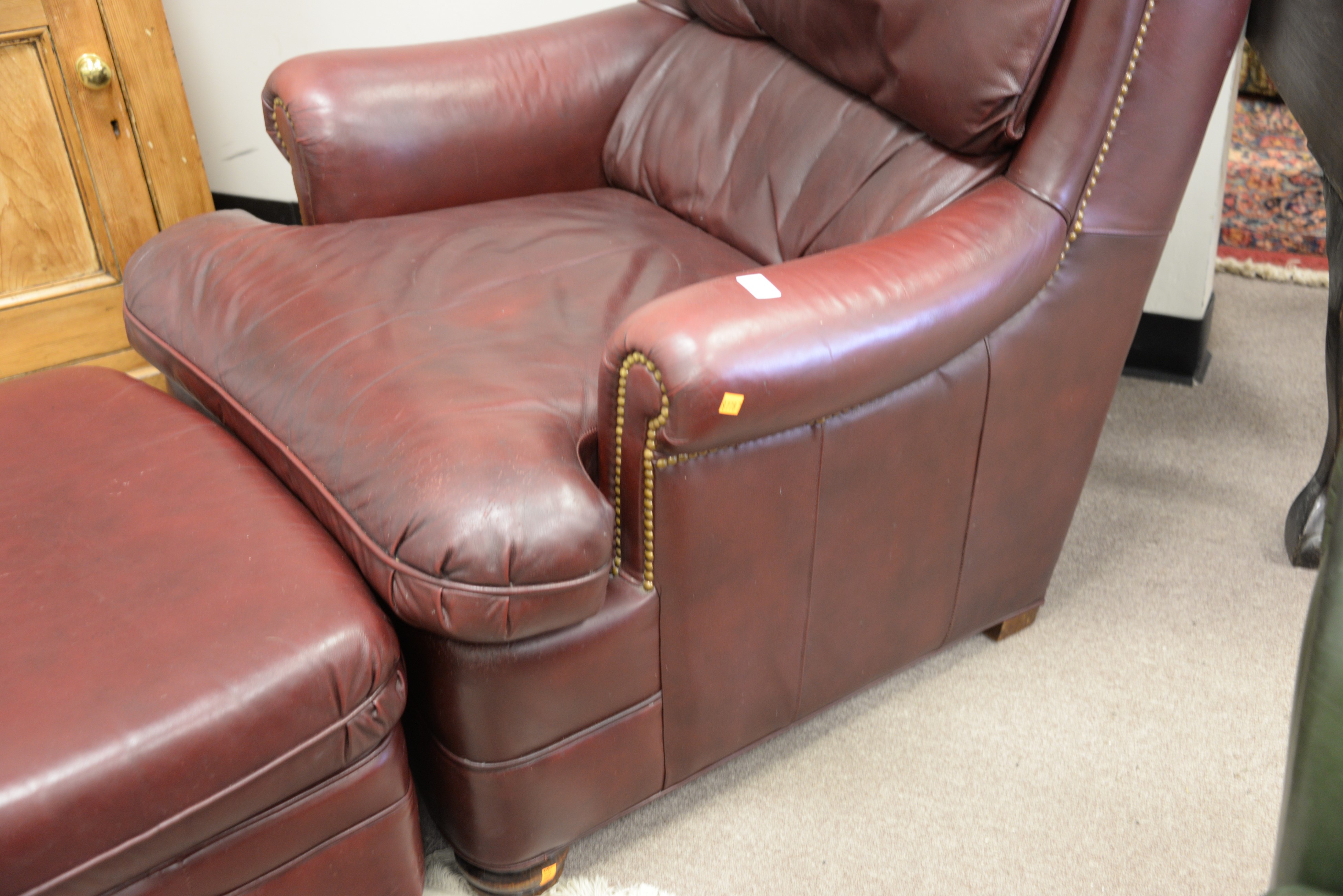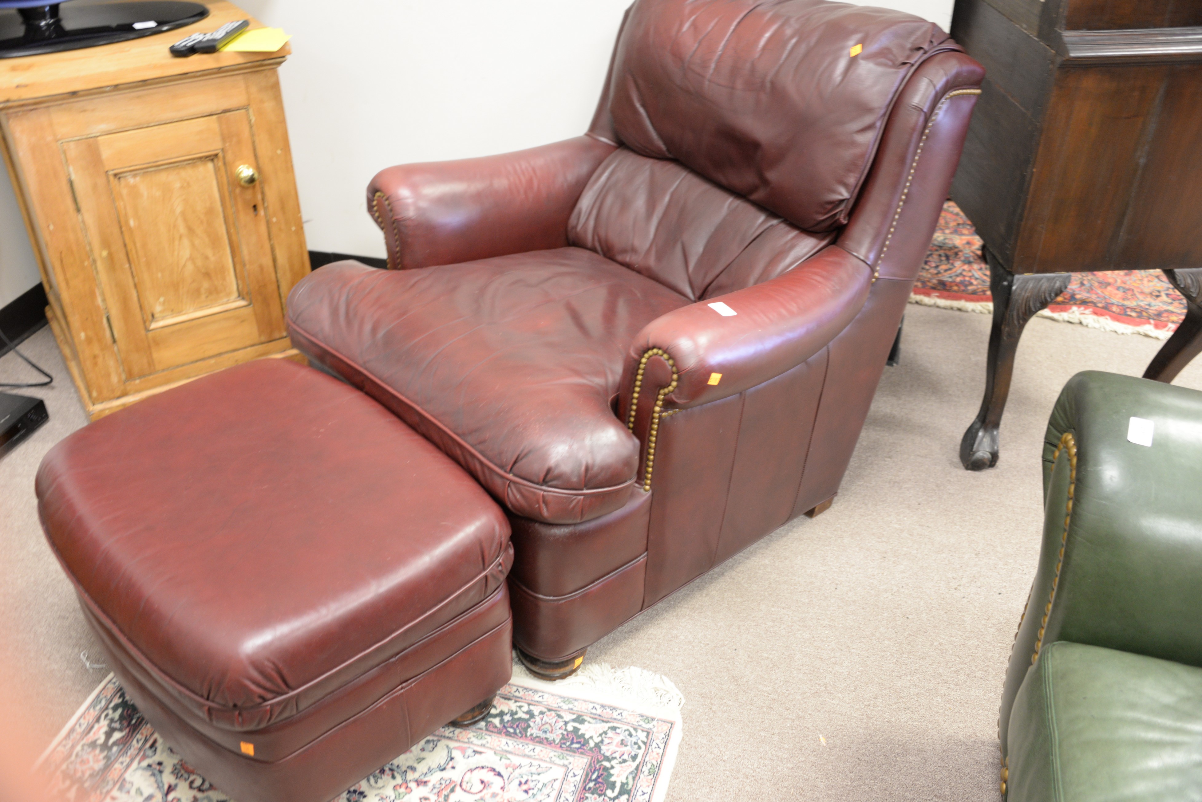 Hancock & Moore red leather chair and ottoman some wear on arms.