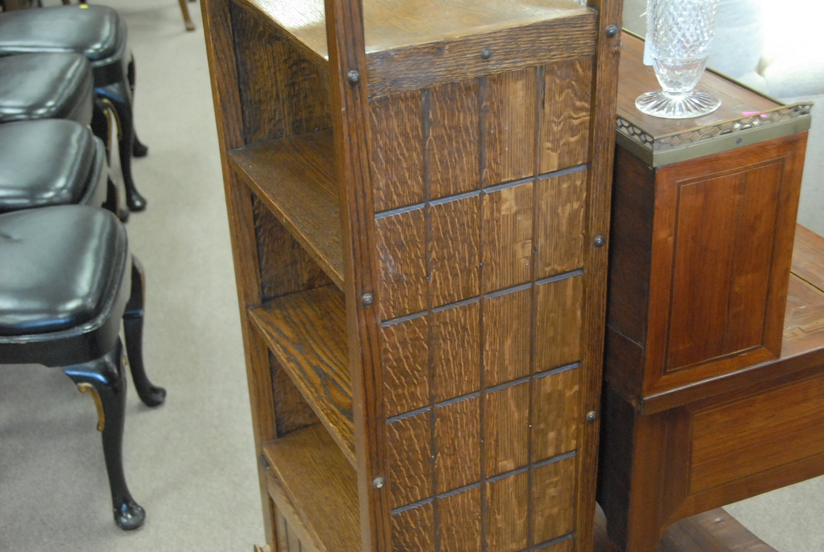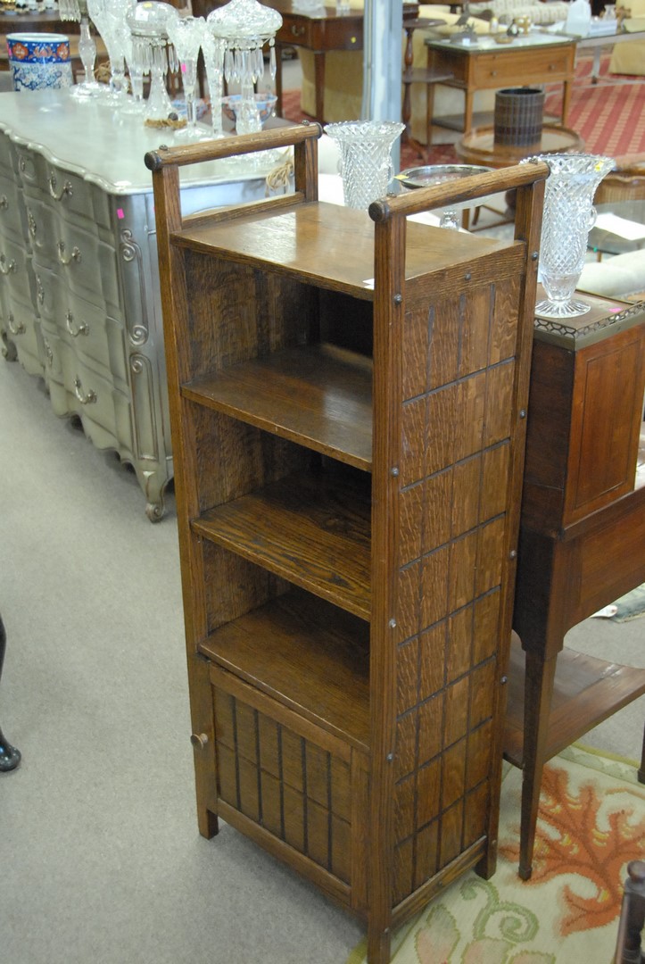 Mission oak style book shelf with four shelves over one door. ht. 49 in. wd. 17 in. dp. 12 in.