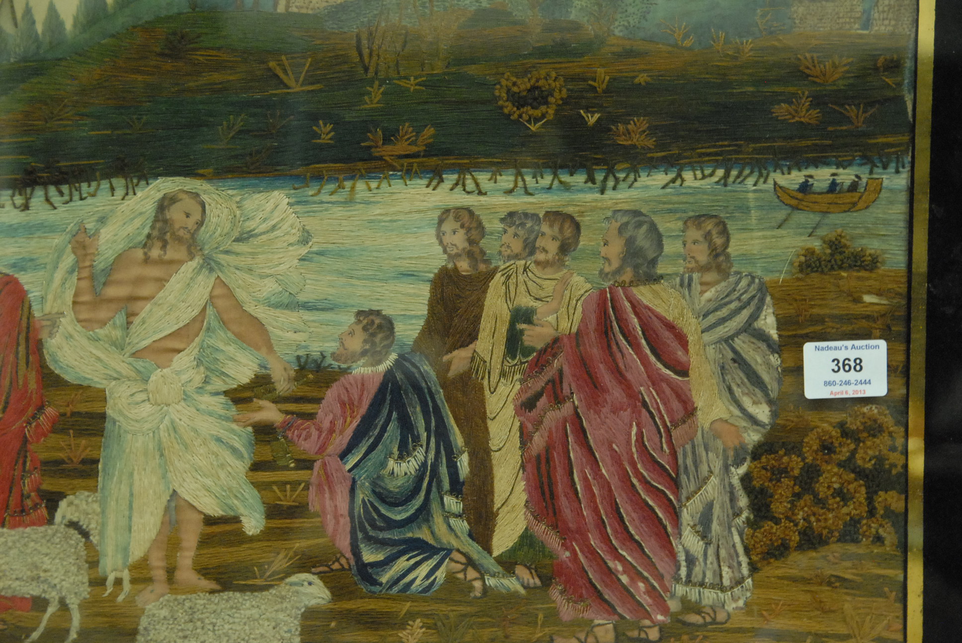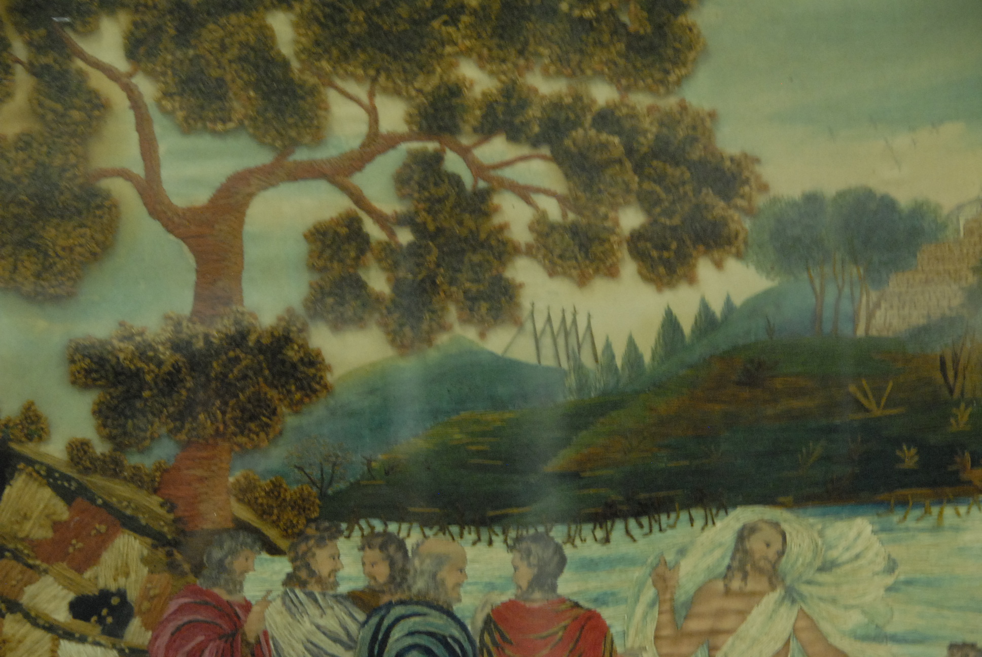 Needlework on silk, religious picture, 19 x 27.