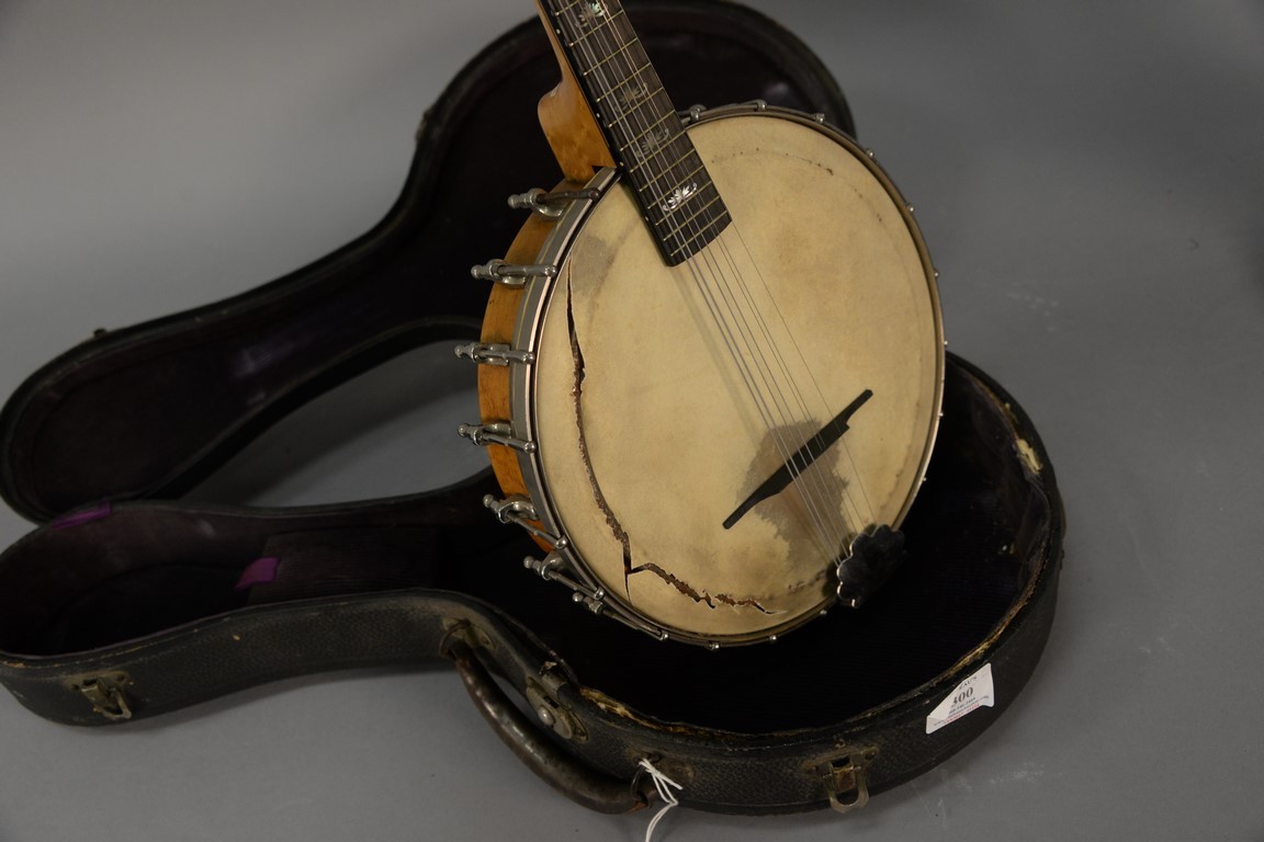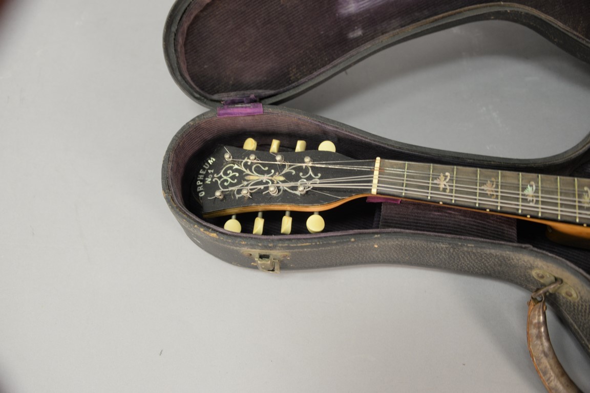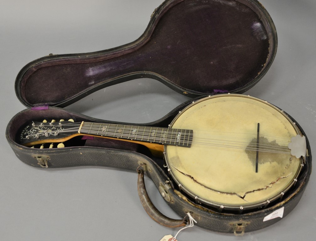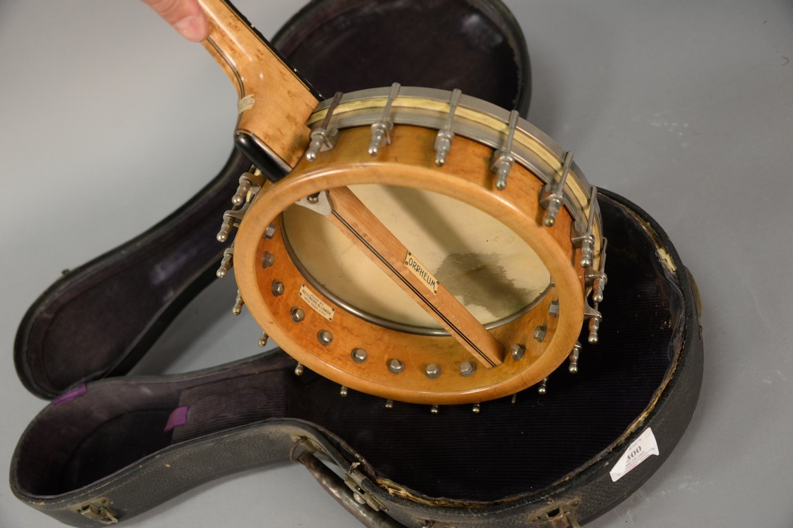 Lot 300: Orpheum Rettberg and Lange birdseye maple banjo/mandolin with case marked Orpheum No. 1 ser. #3459. lg. 24in.