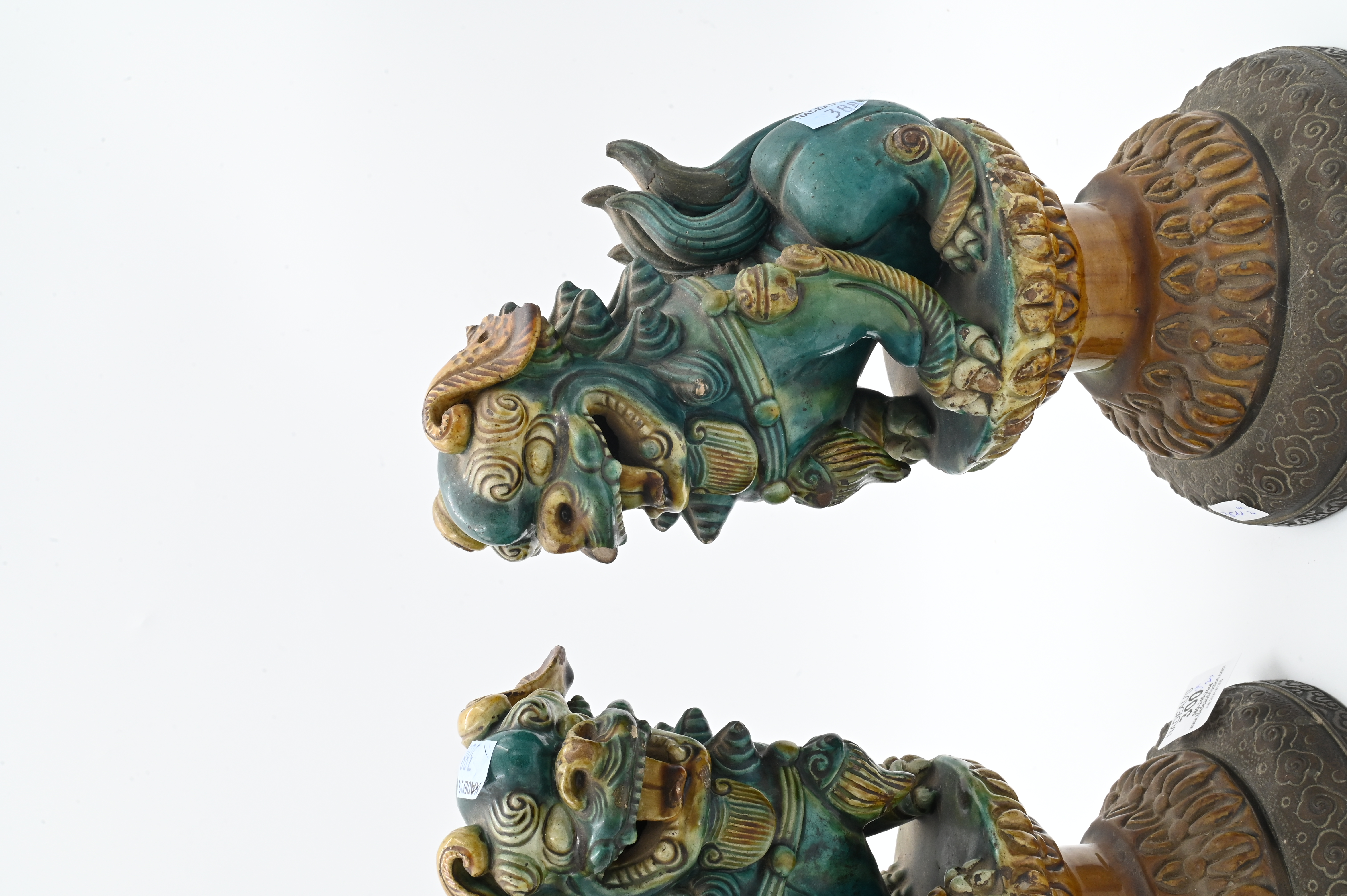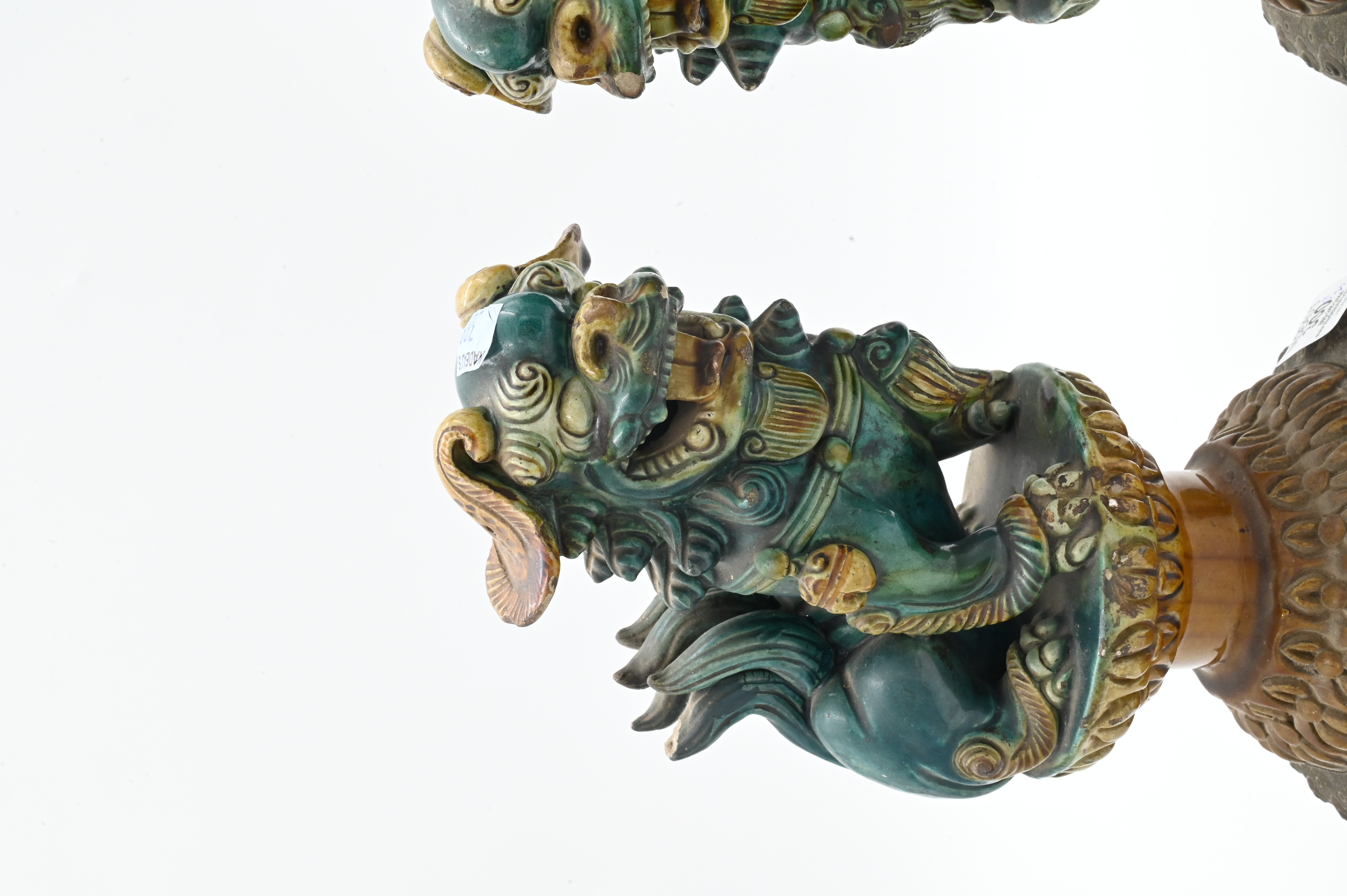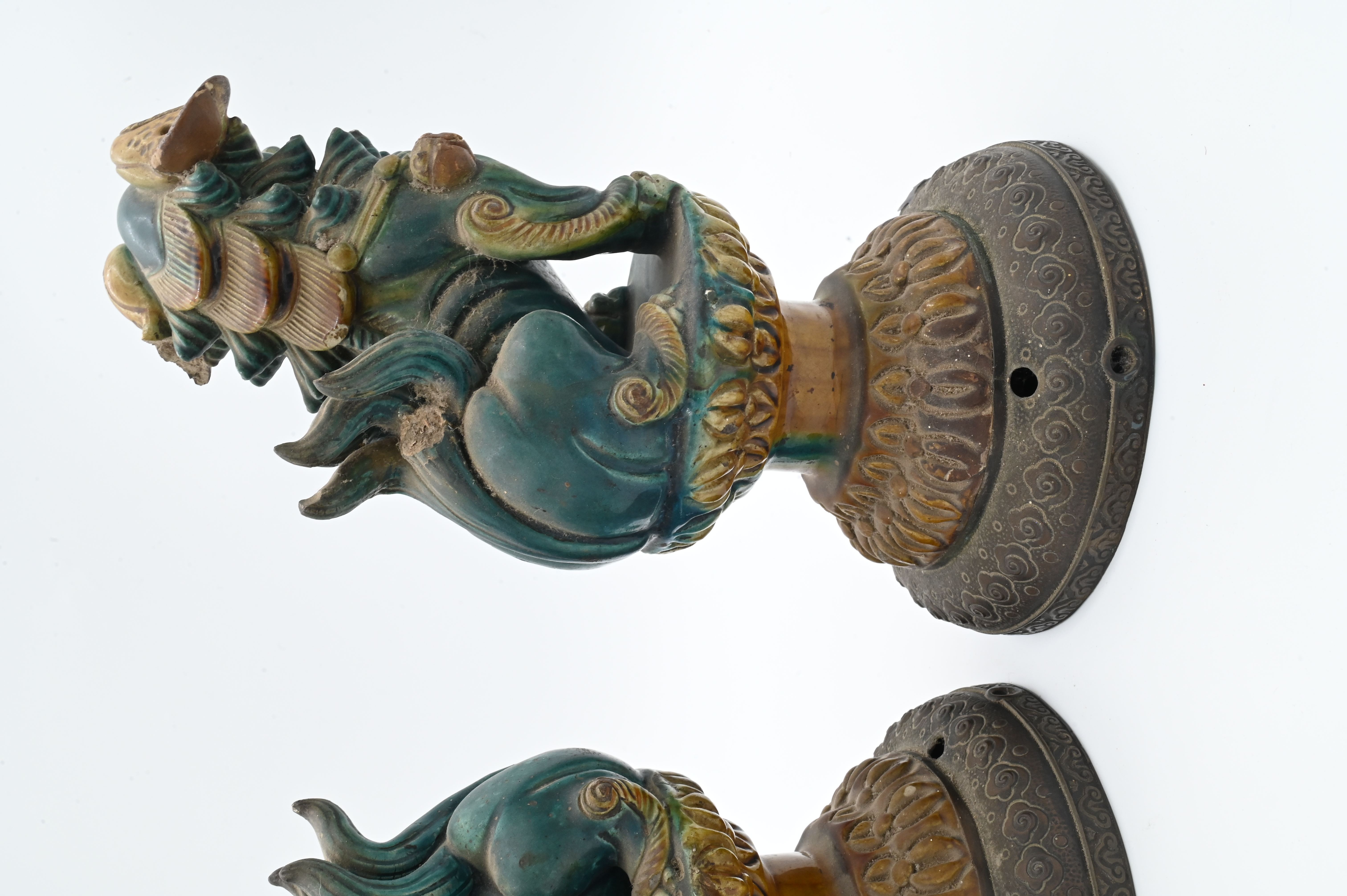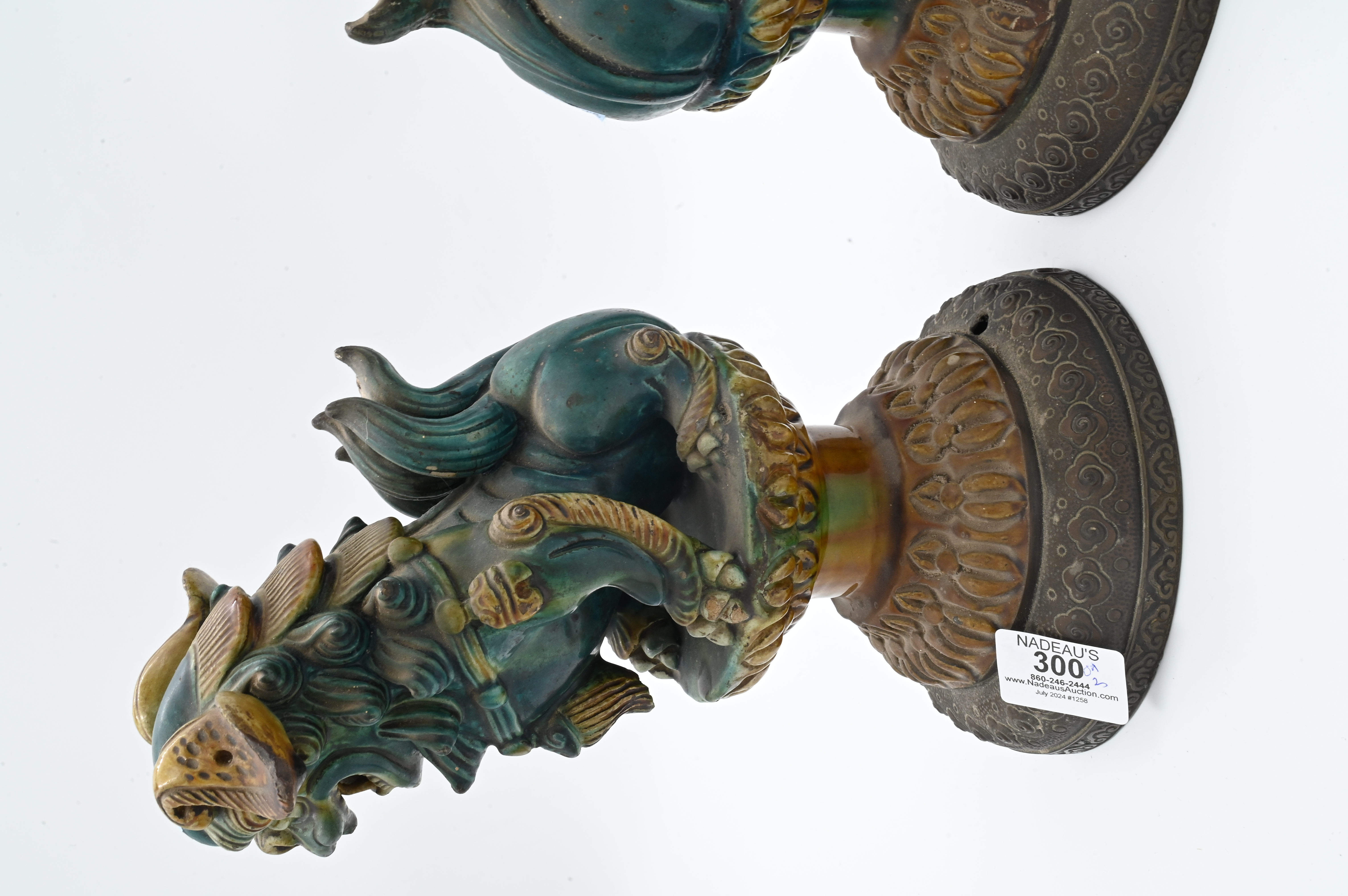 foo dogs in green, blue, and yellow glaze stand mounted on a bronze circular base, once made into table lamps