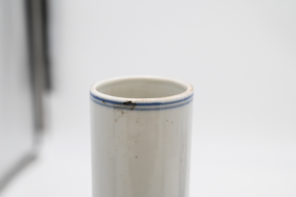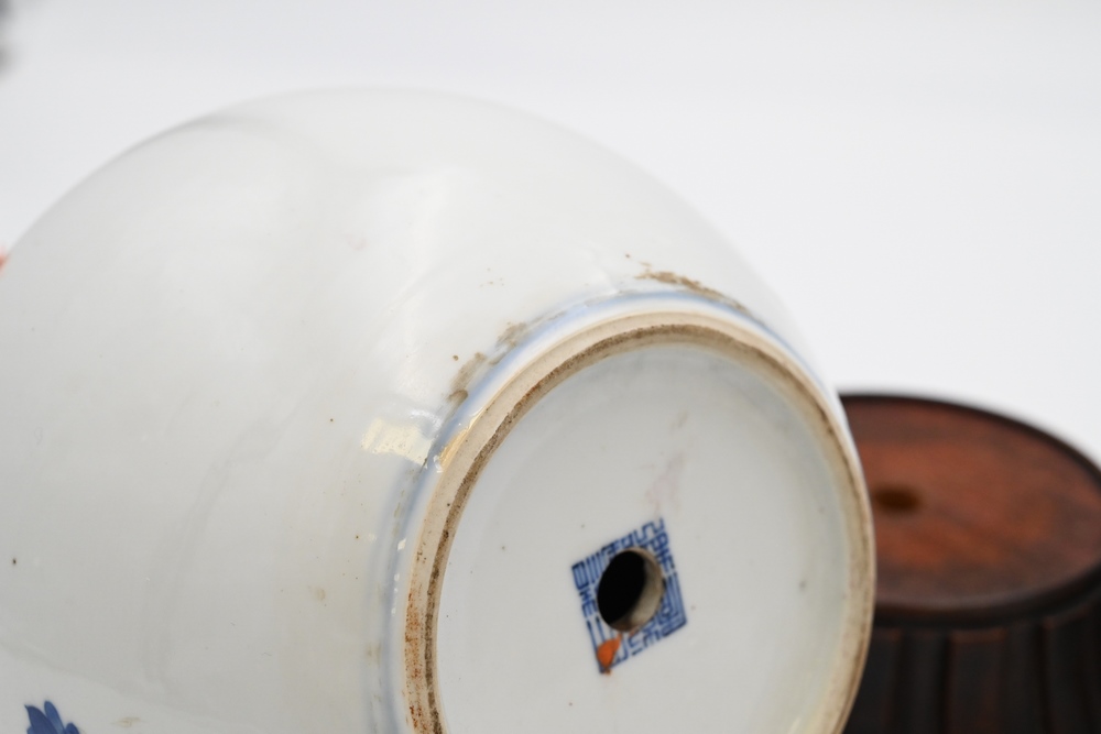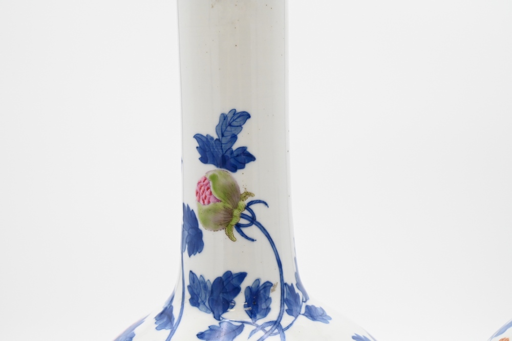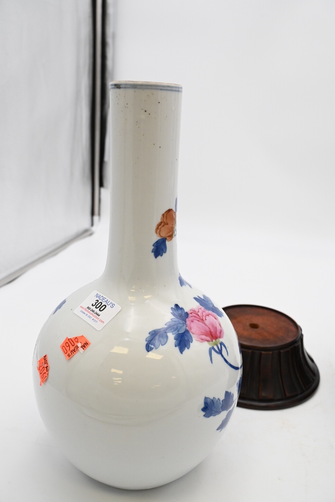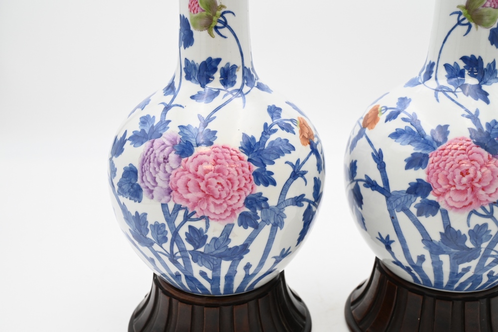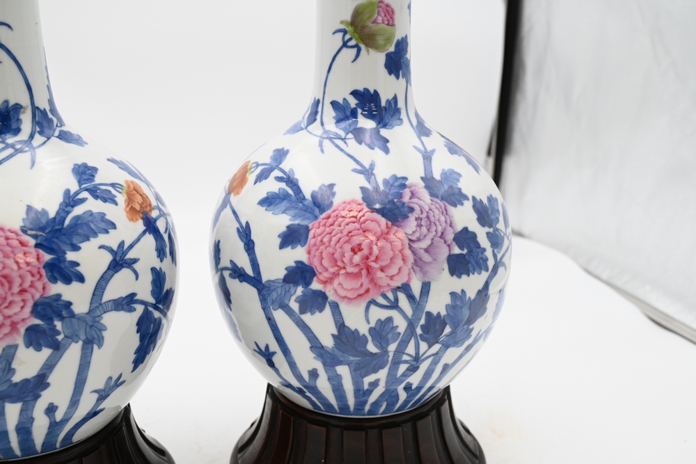 Lot 300: Pair of Chinese Famille Rose Porcelain Vases having painted blossoming flowers with blue vine and leaves bearing blue seal mark on bottom, on wood base drilled bottom height 17 inches