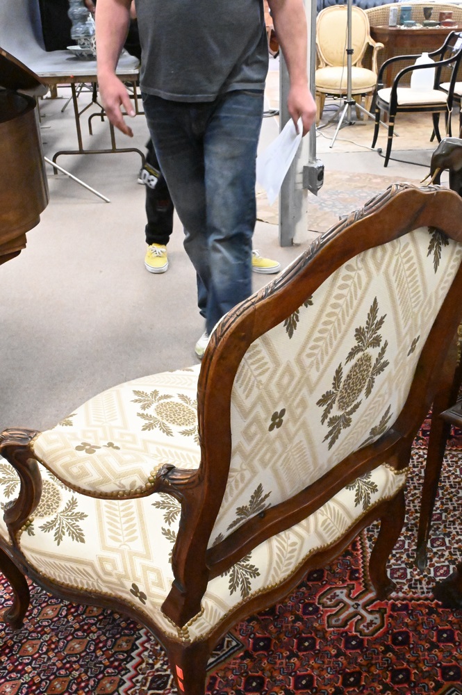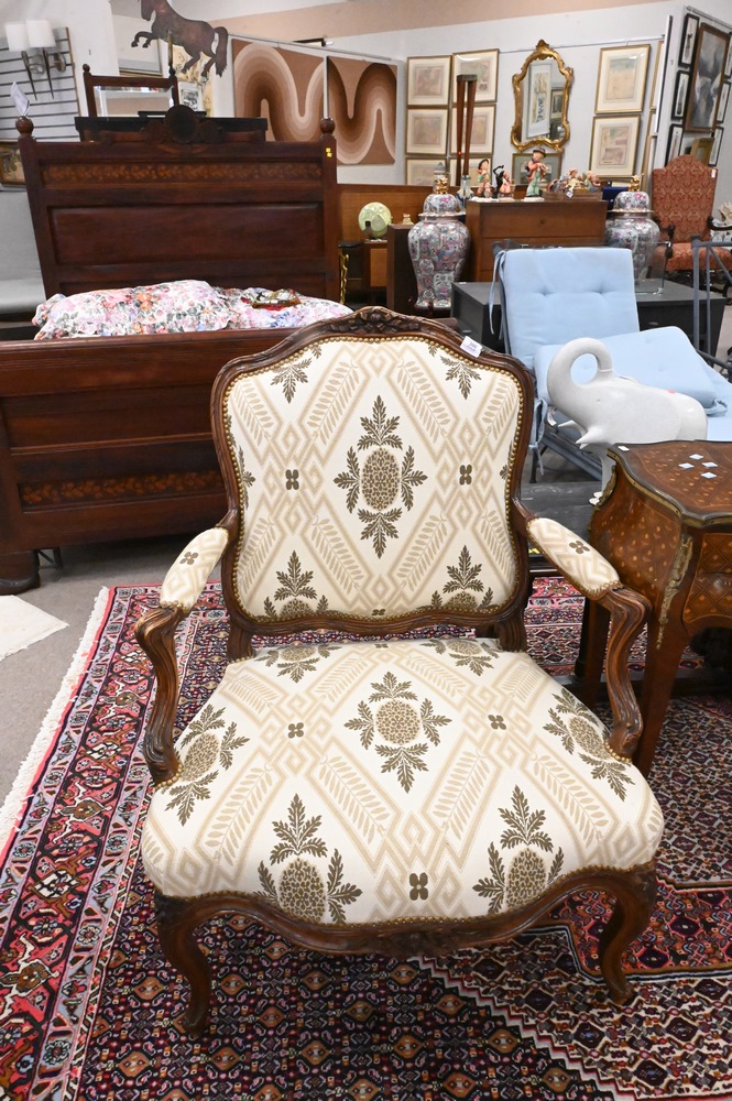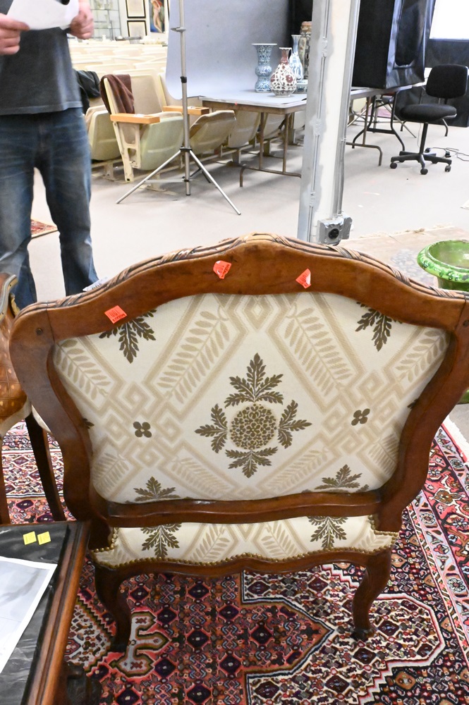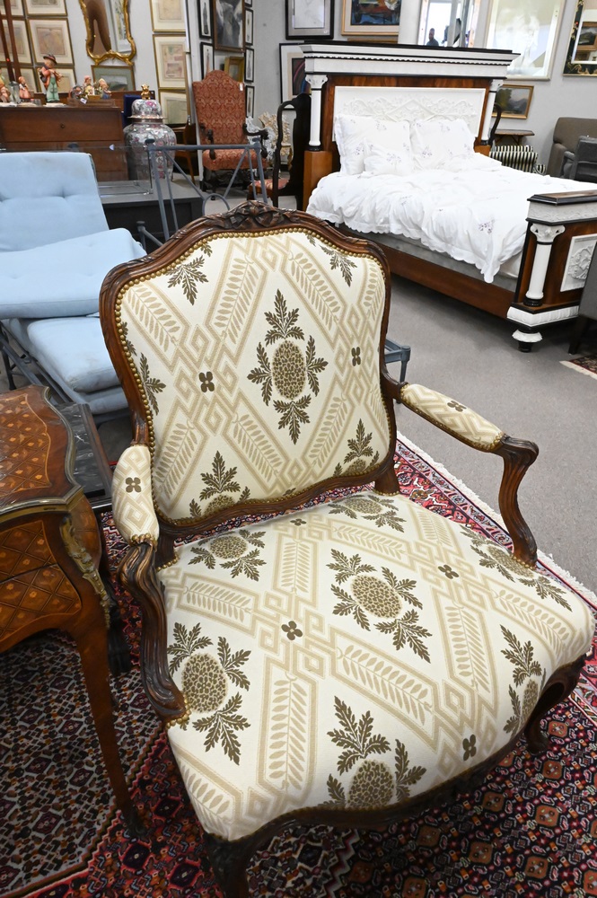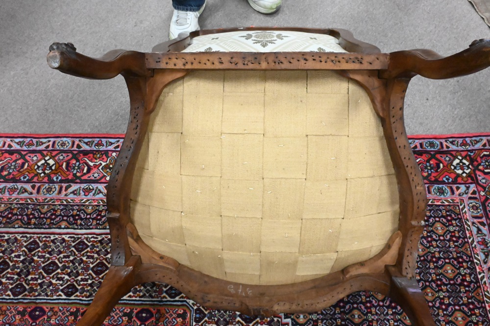 Lot 300: Pair of Nogaret Lyon Louis XV Walnut Fauteuil, ribbon carved and fluted backs and frames, set on carved cabriole legs, signed Nogaret Lyon, Monsieur DelaGarde, on old paper label, height 40 inches, width 33 inches.