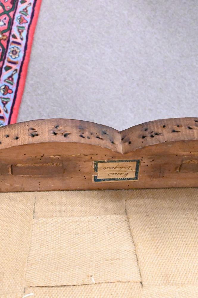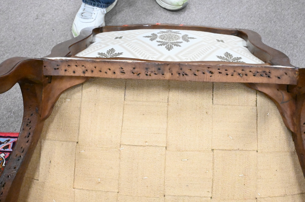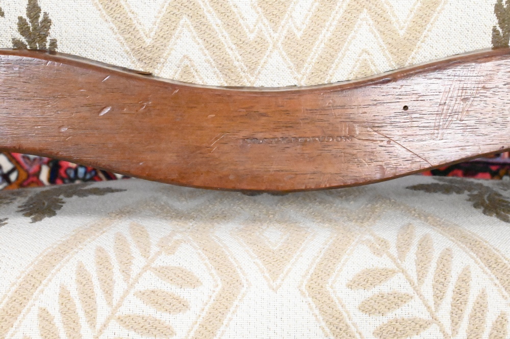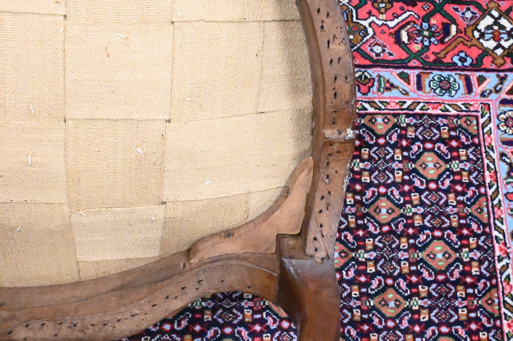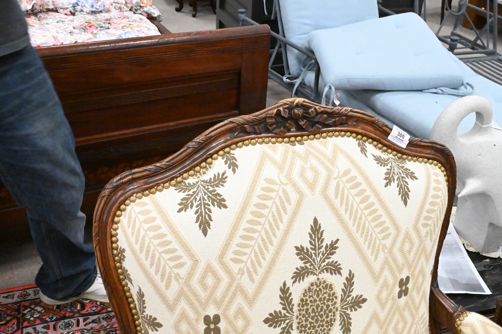 Lot 300: Pair of Nogaret Lyon Louis XV Walnut Fauteuil, ribbon carved and fluted backs and frames, set on carved cabriole legs, signed Nogaret Lyon, Monsieur DelaGarde, on old paper label, height 40 inches, width 33 inches.