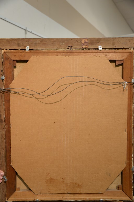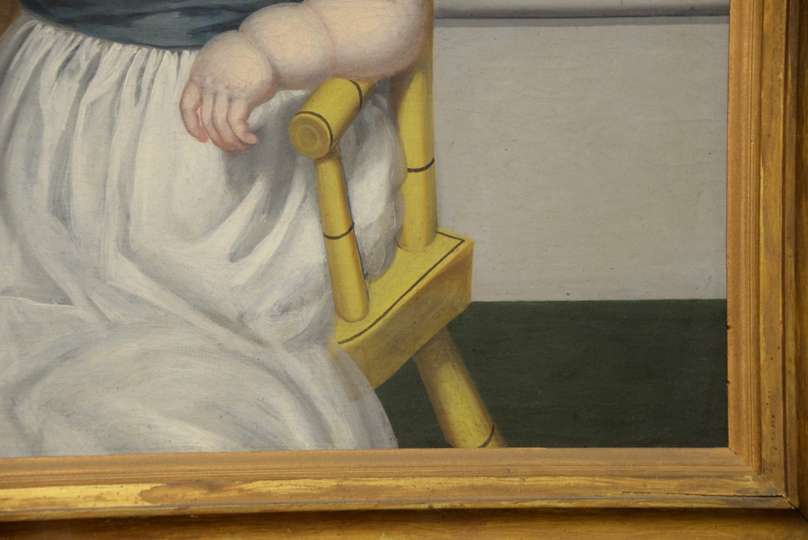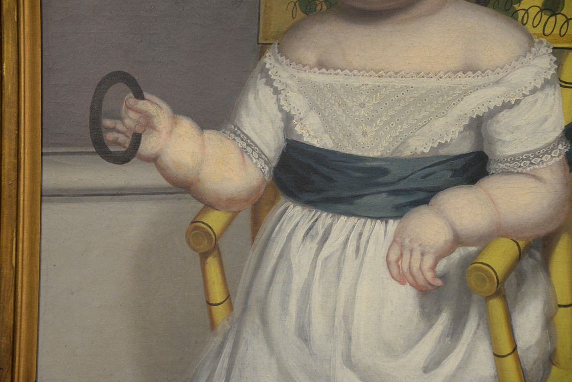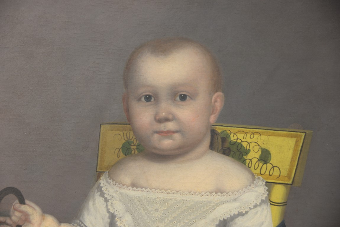Lot 300: Portrait of a Baby seated in a yellow stenciled Federal chair holding a rattle oil on canvas unsigned American School, 19th Century relined 26 1/4 x 22 1/4